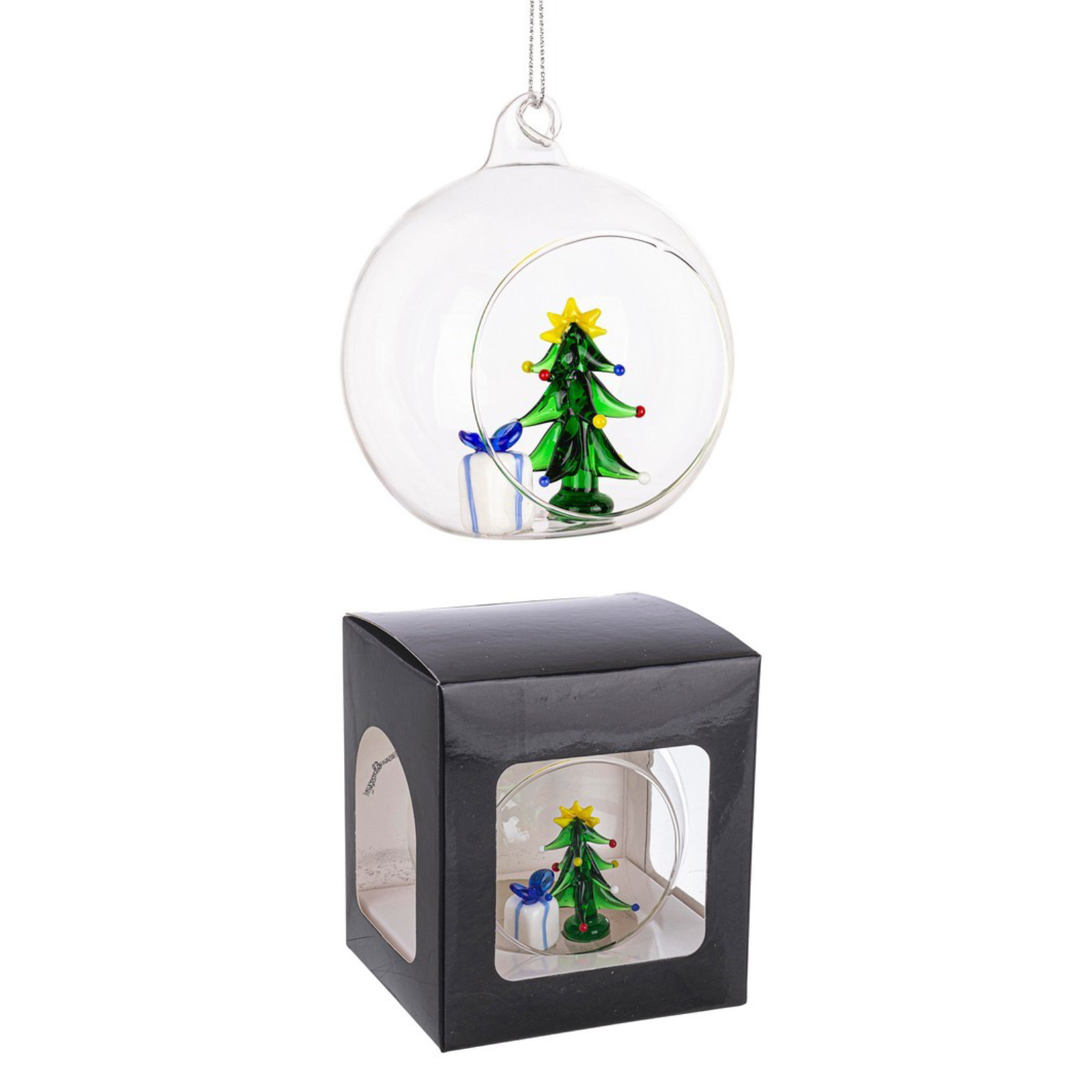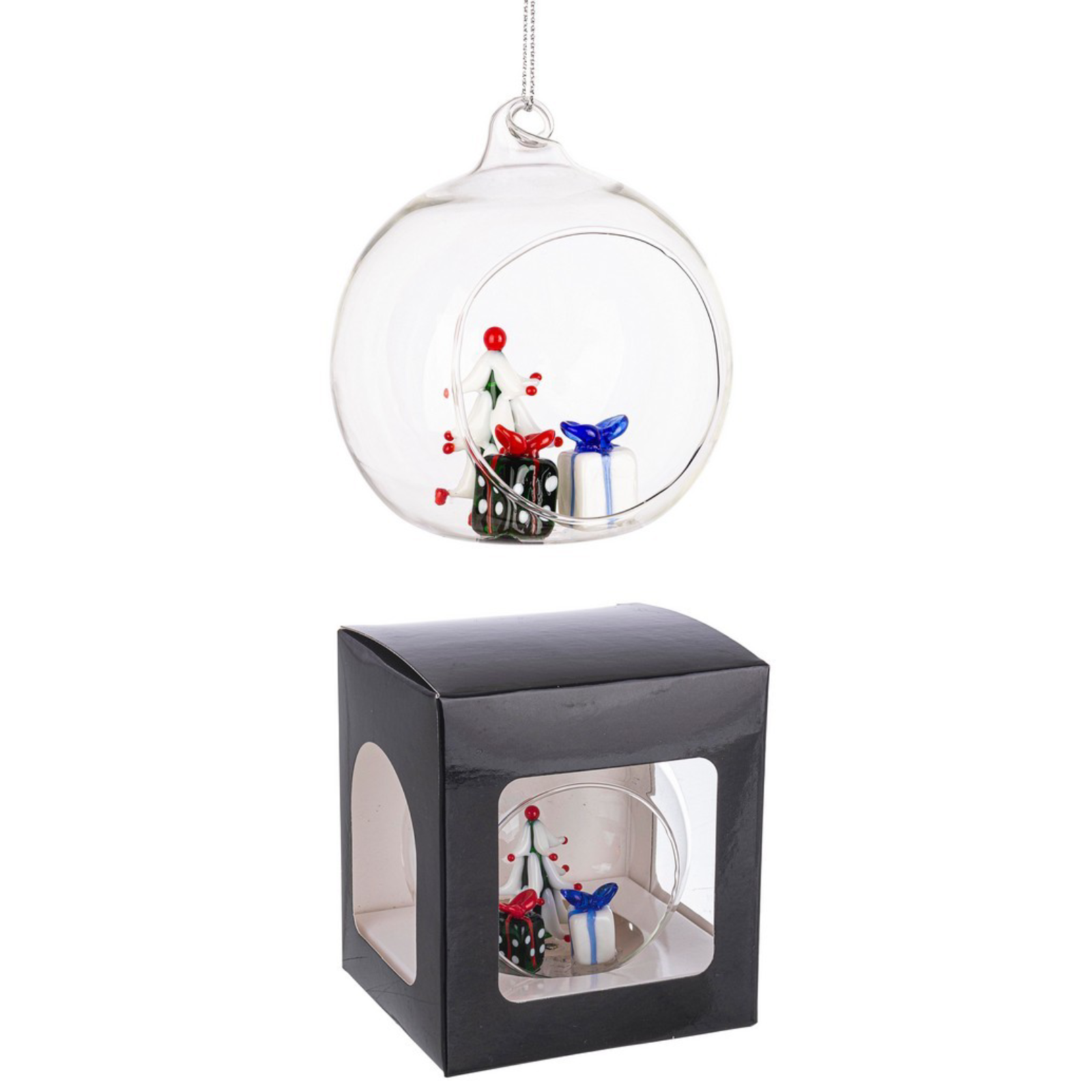 Première Sphère - Trois Dons: Cette sphère présente trois cadeaux magnifiquement conçus, symbolisant la générosité et la surprise. Les couleurs vives et les détails exquis des emballages feront briller votre arbre.