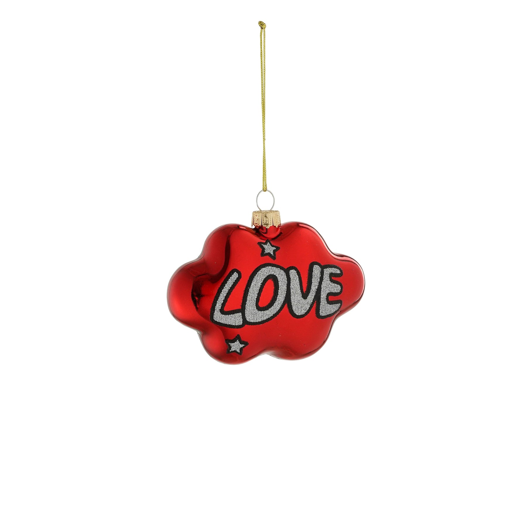 Le pendentif disco en verre de 7,5 cm de haut avec « Love » en rouge et « Wow » en or est un ajout vibrant et étincelant à vos décorations de Noël.