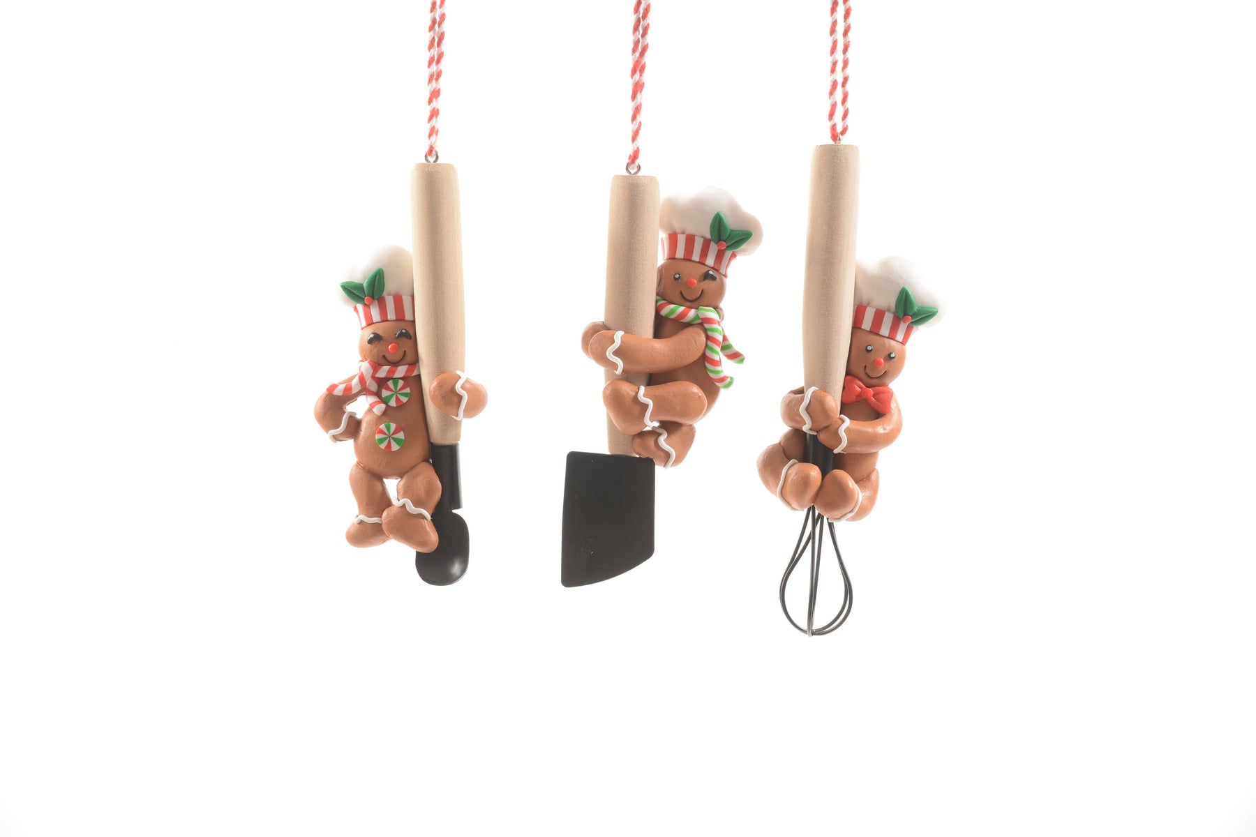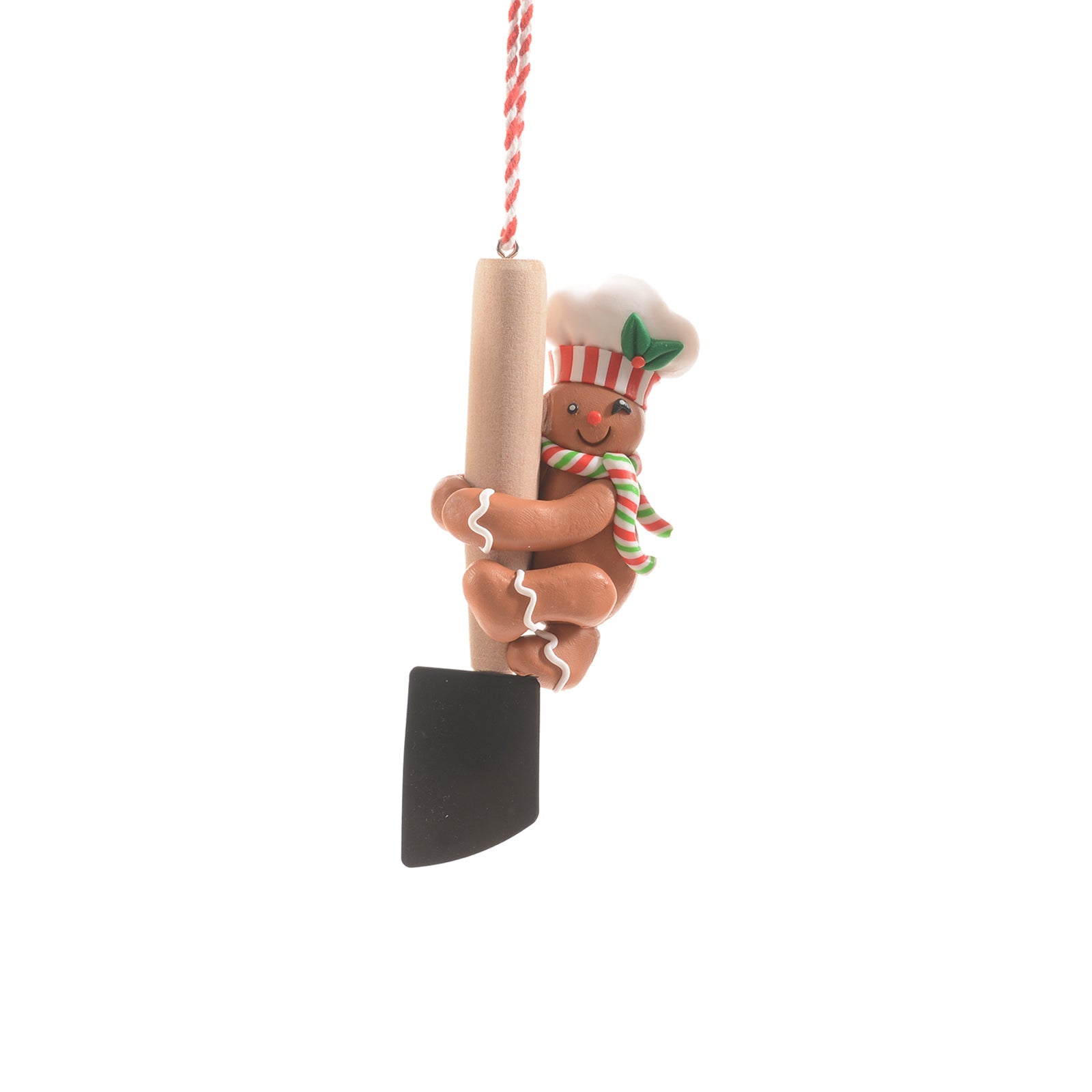Ce pendentif représente un ravissant bonhomme en pain d'épices accompagné d'une variété d'ustensiles de cuisine miniatures, symboles de l'art culinaire typique des fêtes.