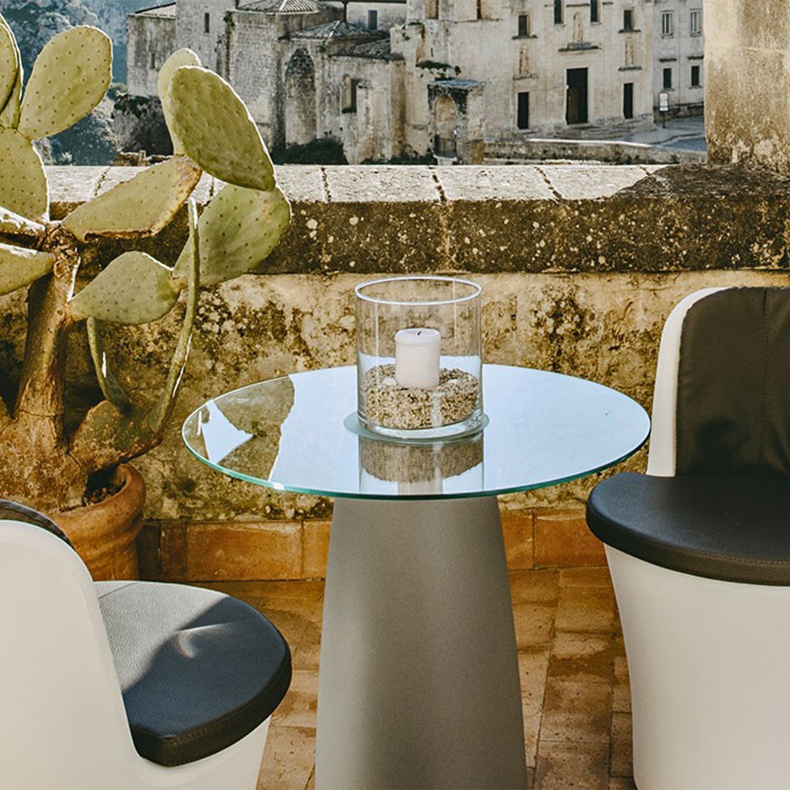 Adaptée également aux jardins et terrasses, son assise confortable est complétée par deux coussins en cuir de belle facture, disponibles en blanc et gris.