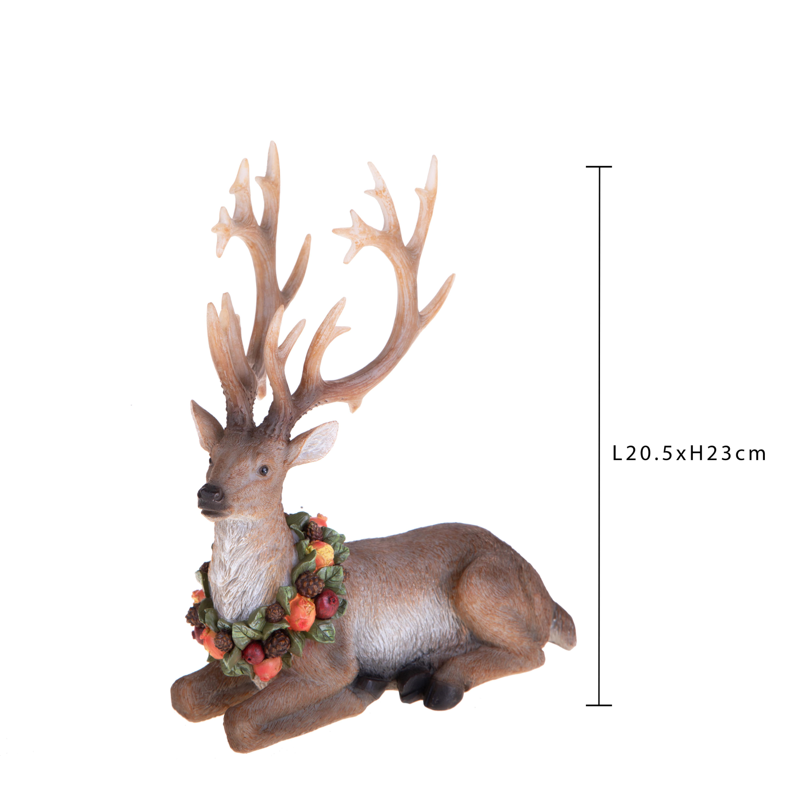 Fabriquée à partir de résine de haute qualité, cette décoration présente un renne assis orné d'une guirlande de fruits, ajoutant une touche fraîche et festive à votre décor en cette période des fêtes.