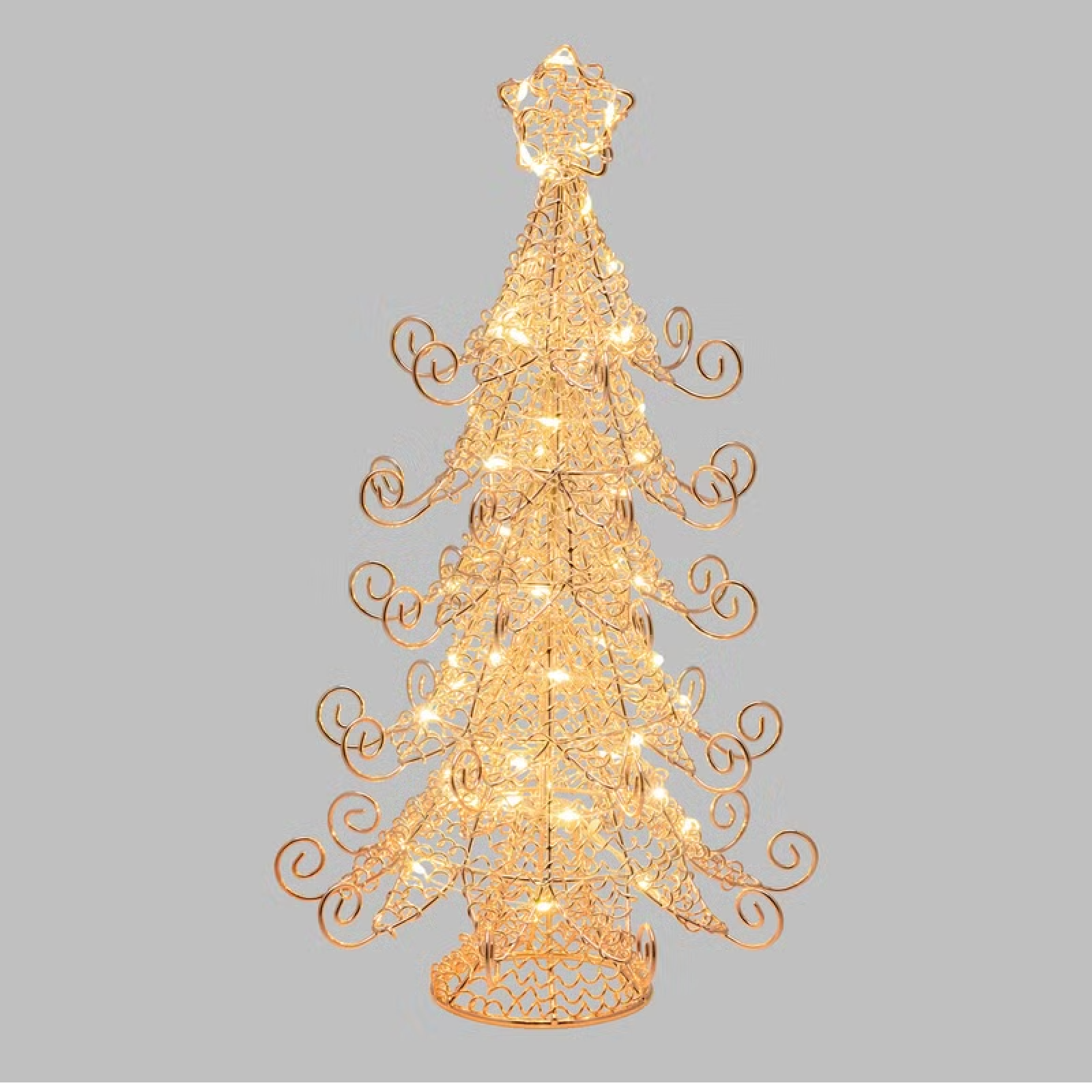 Cet arbre de Noël en trois dimensions est constitué d'un cadre en métal brillant de couleur cuivre autour duquel de nombreux fils métalliques de couleur argentée ont été enroulés. 55 micro LED blanc chaud à lumière fixe .