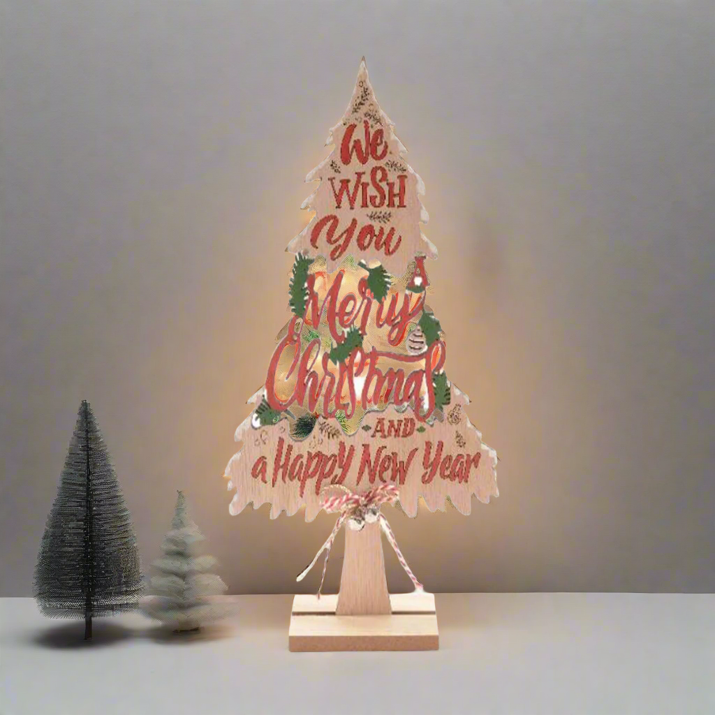 Le sapin de Noël en bois "Joyeux Noël" pour décorations de Noël est une décoration élégante et festive qui allie tradition et touche artisanale.
