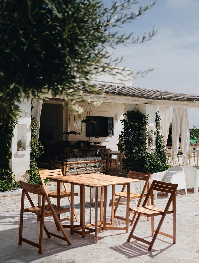 L'ensemble comprend une table et quatre chaises, toutes fabriquées en bois d'acacia avec finition huilée. La finition à l'huile est conçue pour protéger le bois de l'exposition aux éléments et le maintenir en bon état pour une utilisation à long terme.