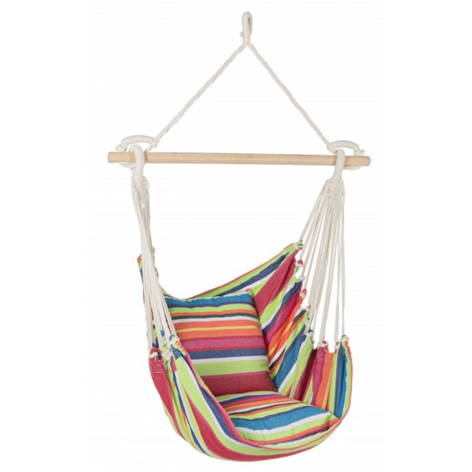Fauteuil à bascule de jardin suspendu en tissu avec coussins rayés et barre de support en bois