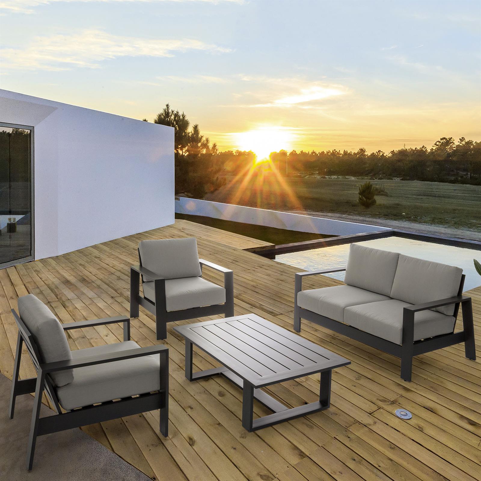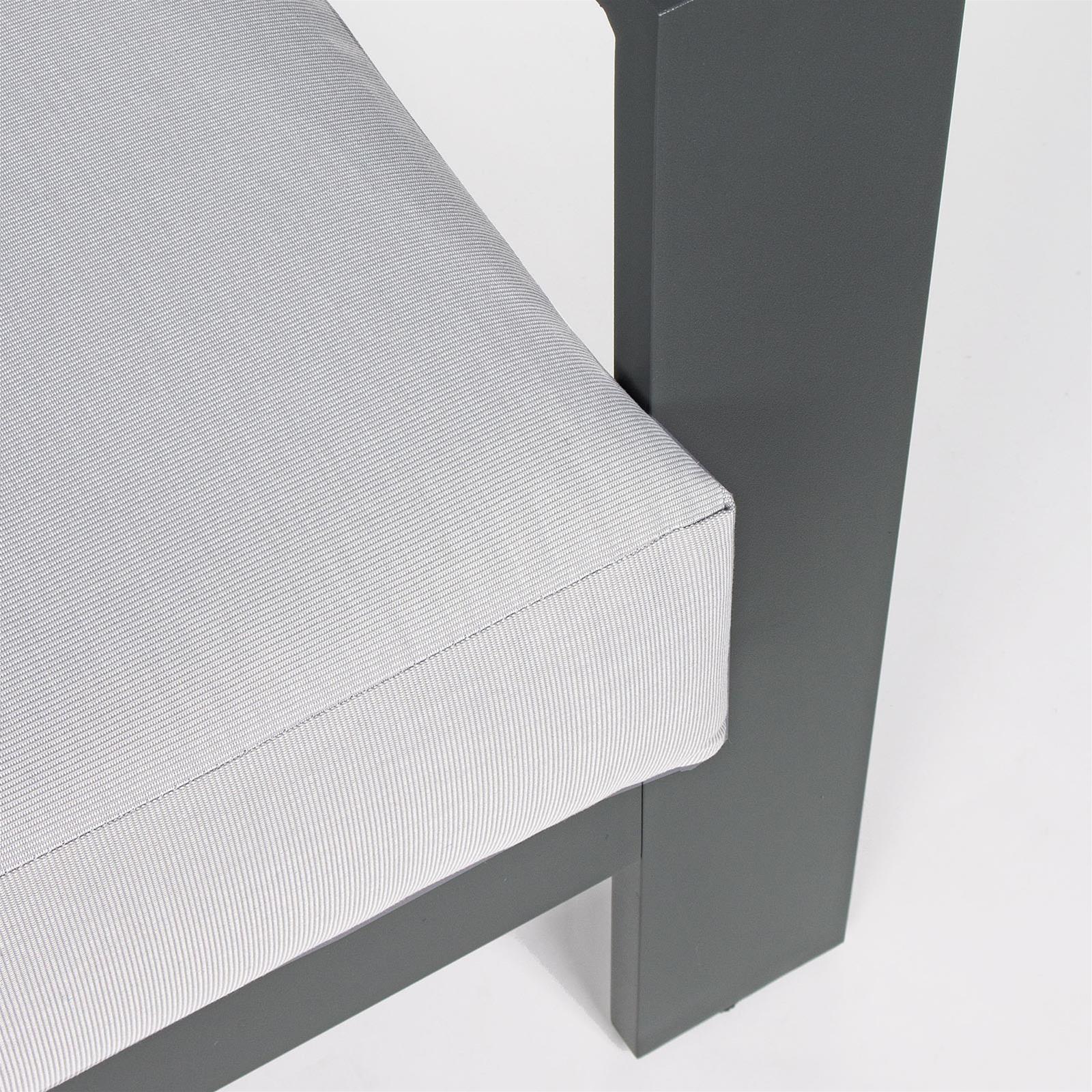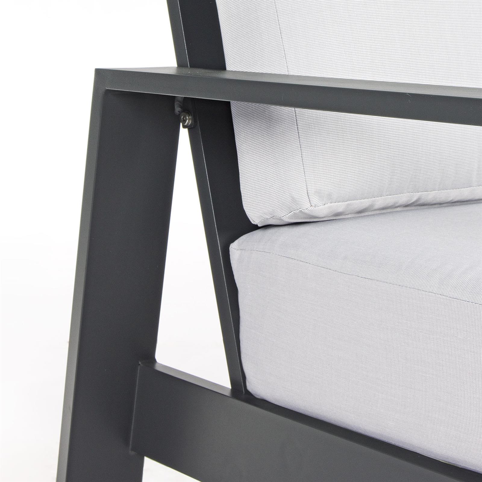 Salon en aluminium peint avec de la poudre époxy avec des coussins d'extérieur rembourrés gris clair très confortables.