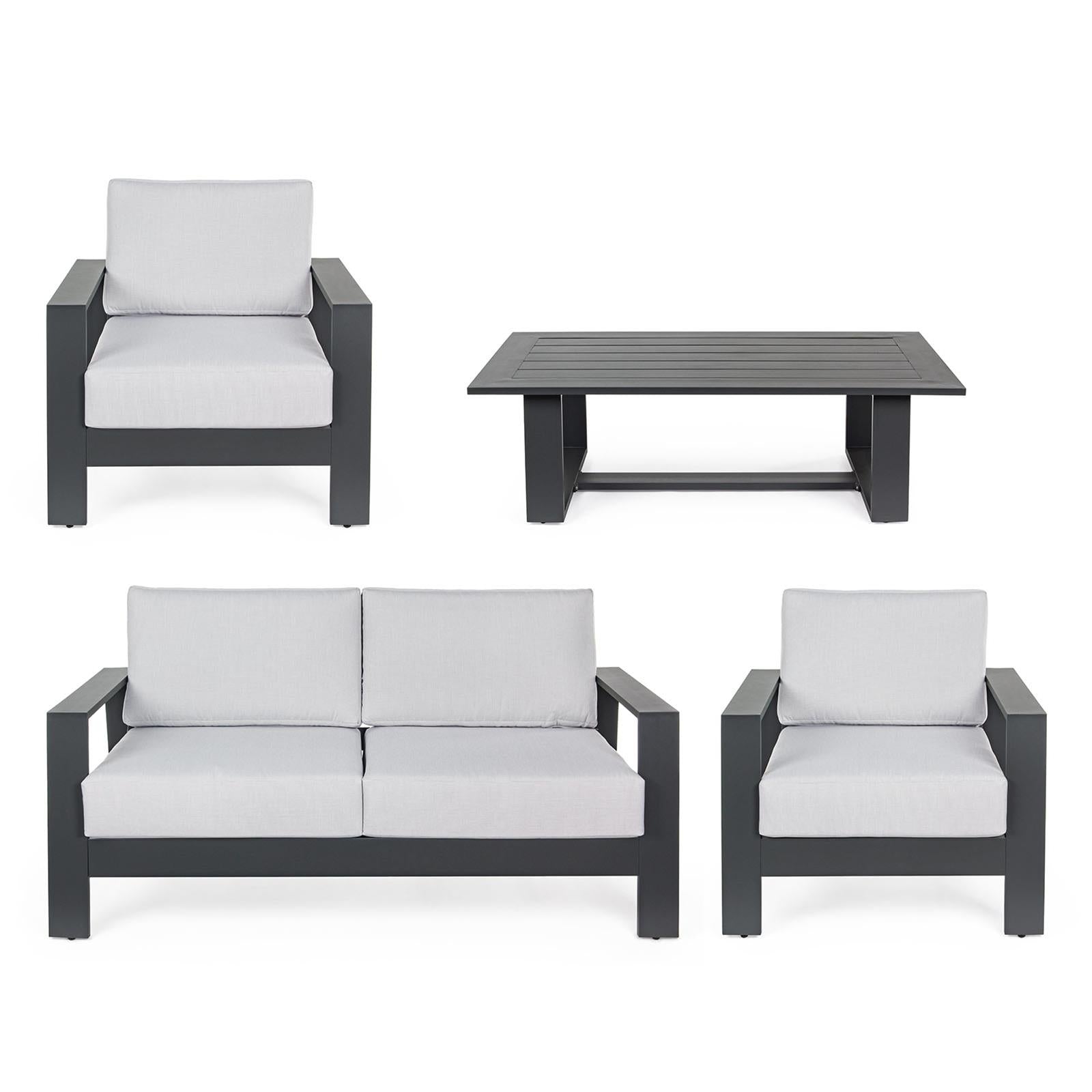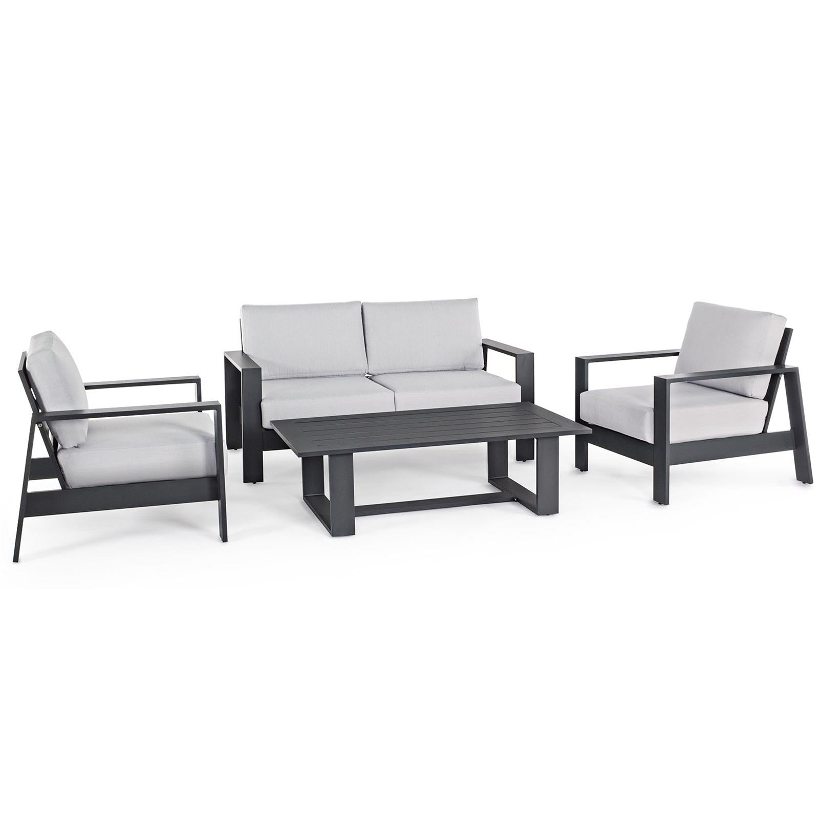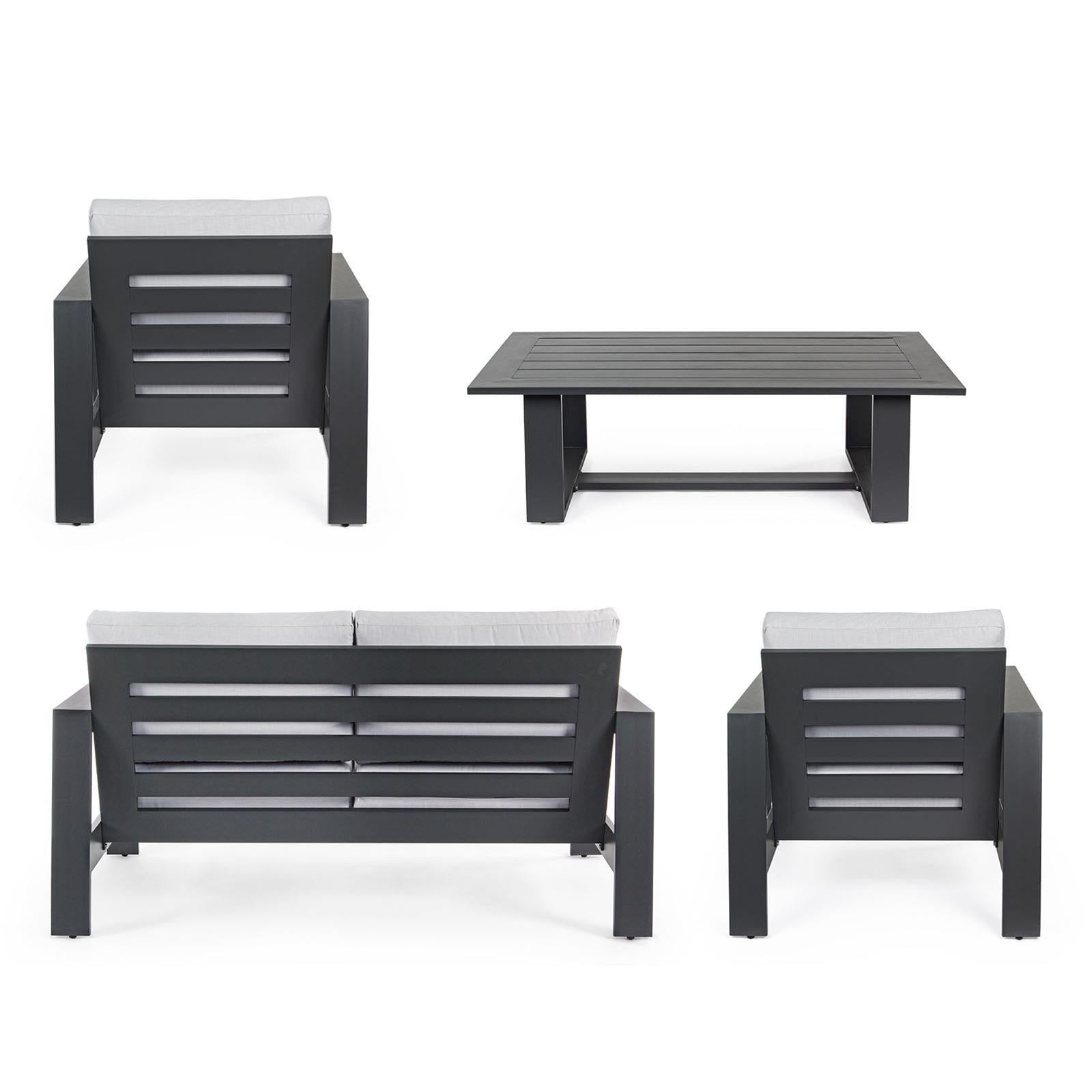 Salon en aluminium peint avec de la poudre époxy avec des coussins d'extérieur rembourrés gris clair très confortables.