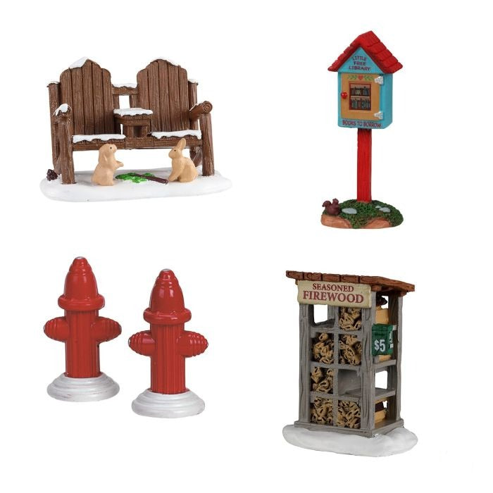 Le produit décrit est un ensemble d'accessoires pour village de Noël, en polyrésine durable.