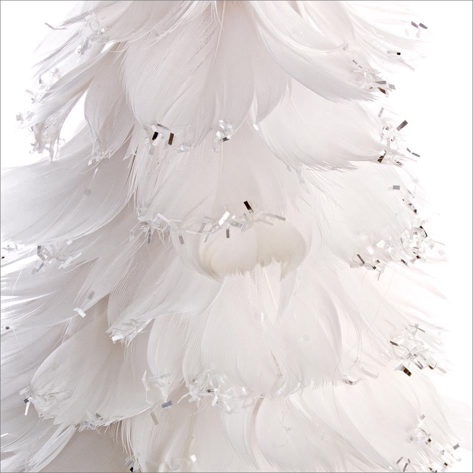 Sa forme rappelle celle d'un sapin de Noël classique, mais réinterprétée avec une touche élégante et légère grâce à l'utilisation de plumes, qui créent un effet visuel doux et moelleux.