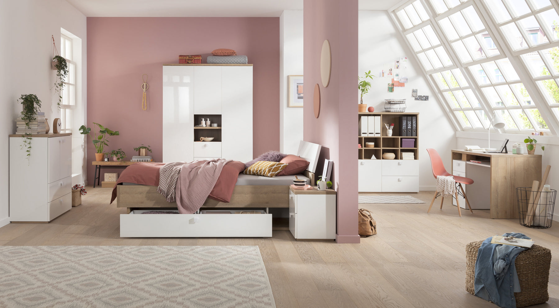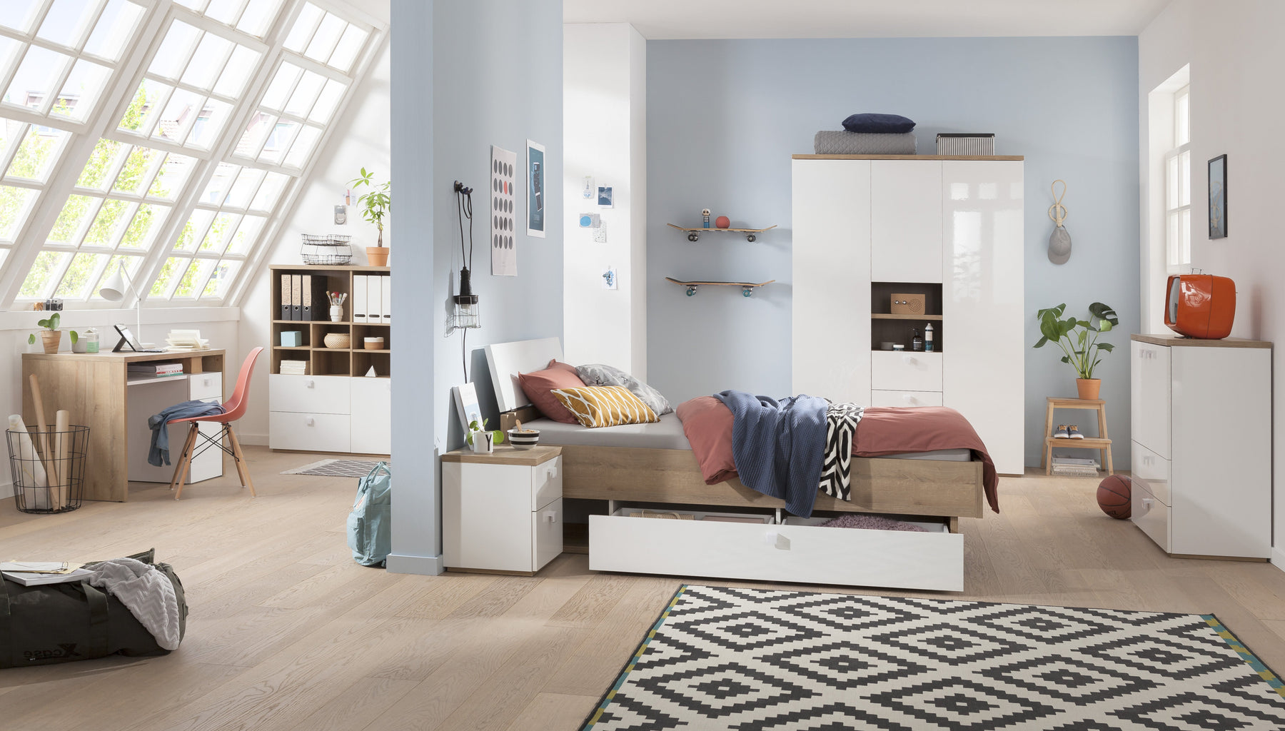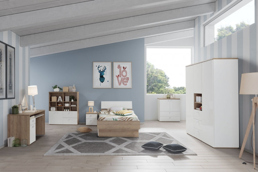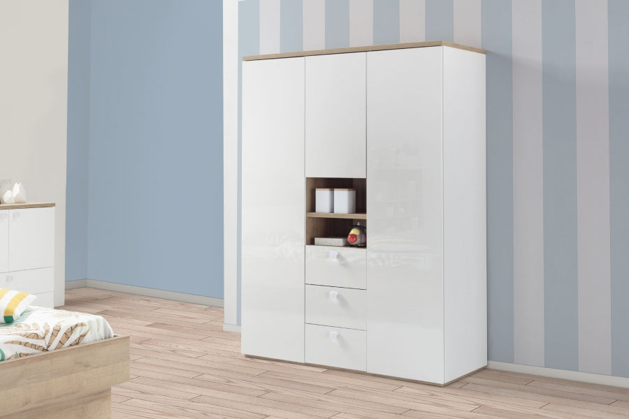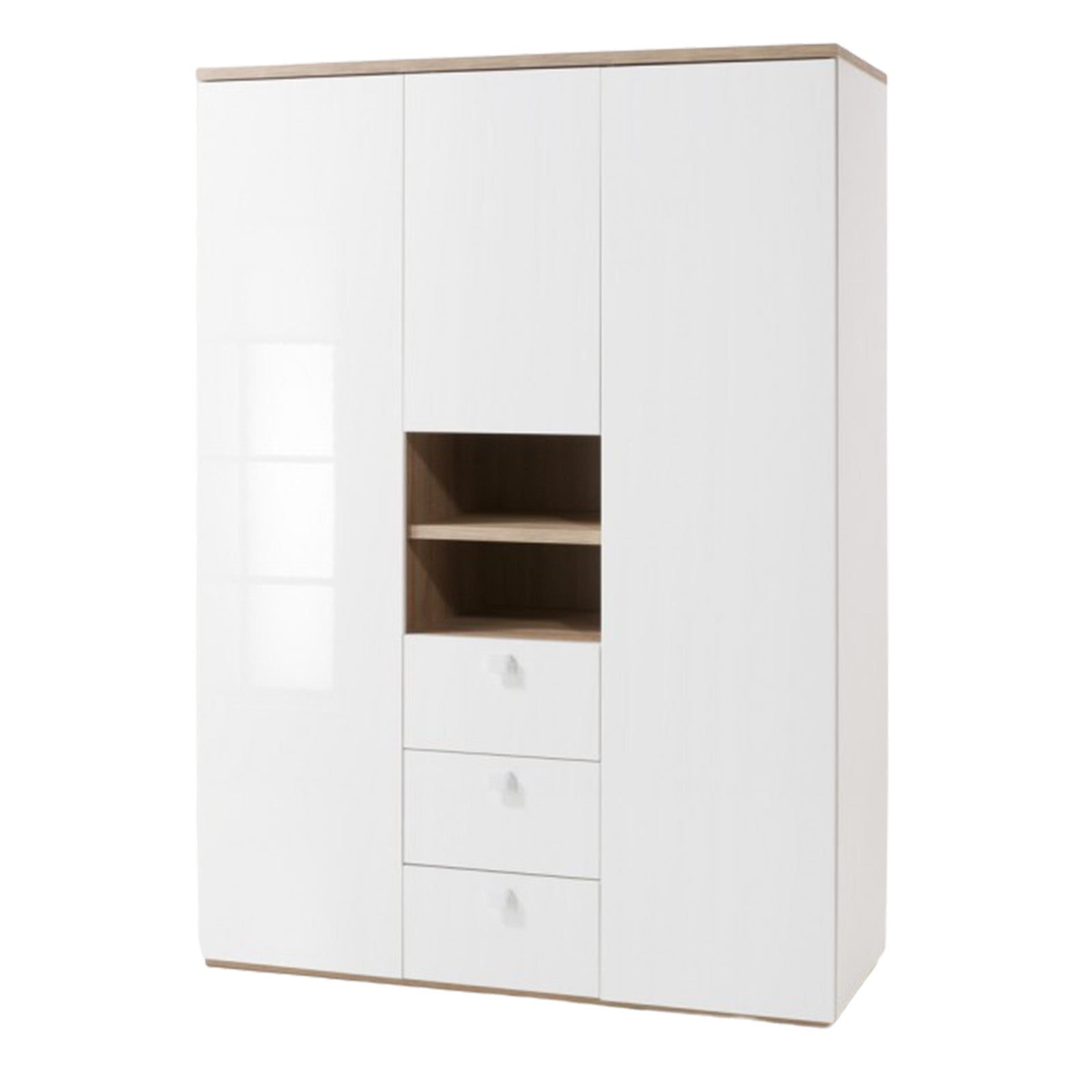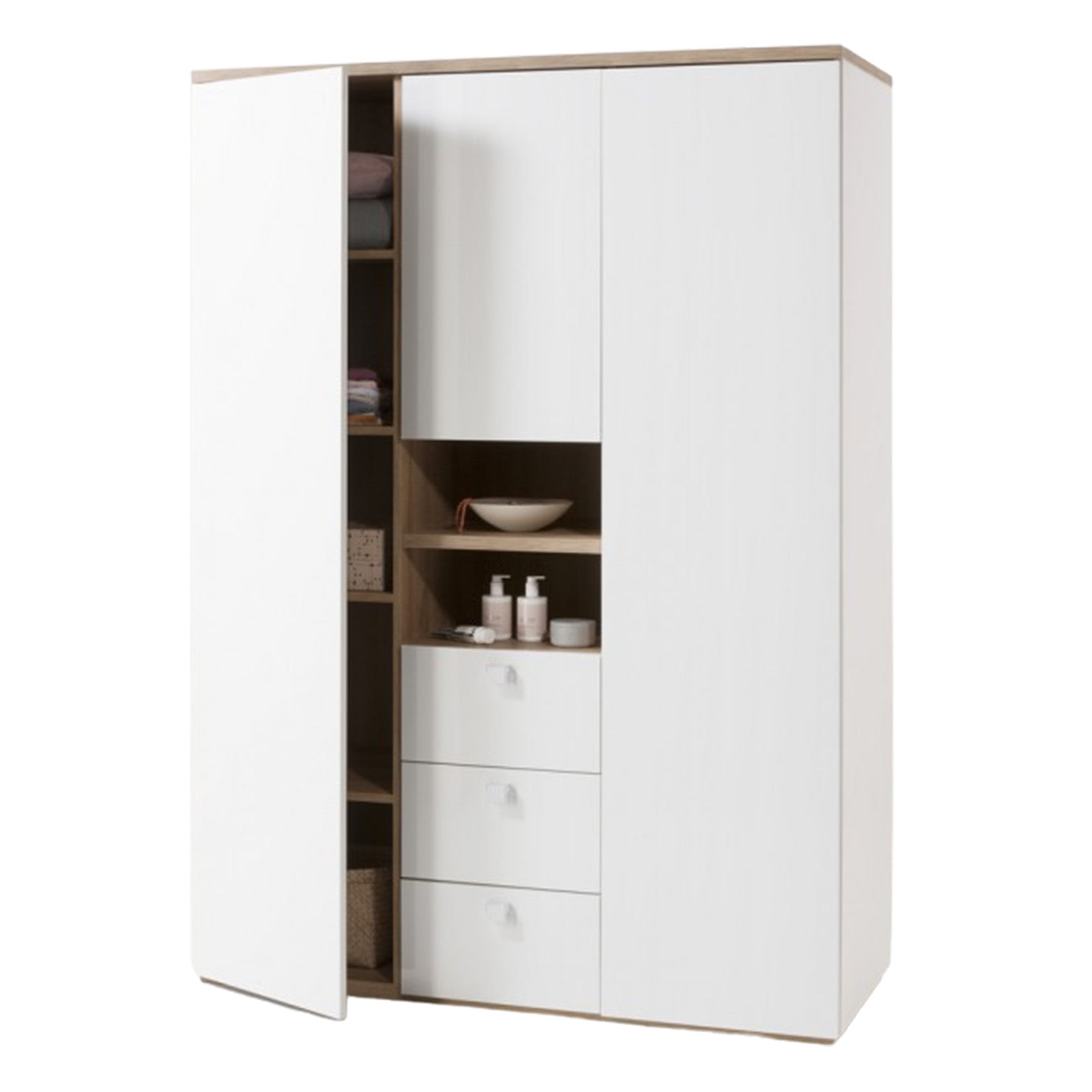 Prix régulier €849,90Armoire Globo 3 portes 3 tiroirs Blanc et Chêne Riviera Structure 16 mm, Base 38 mm, Plateau 30 mm.