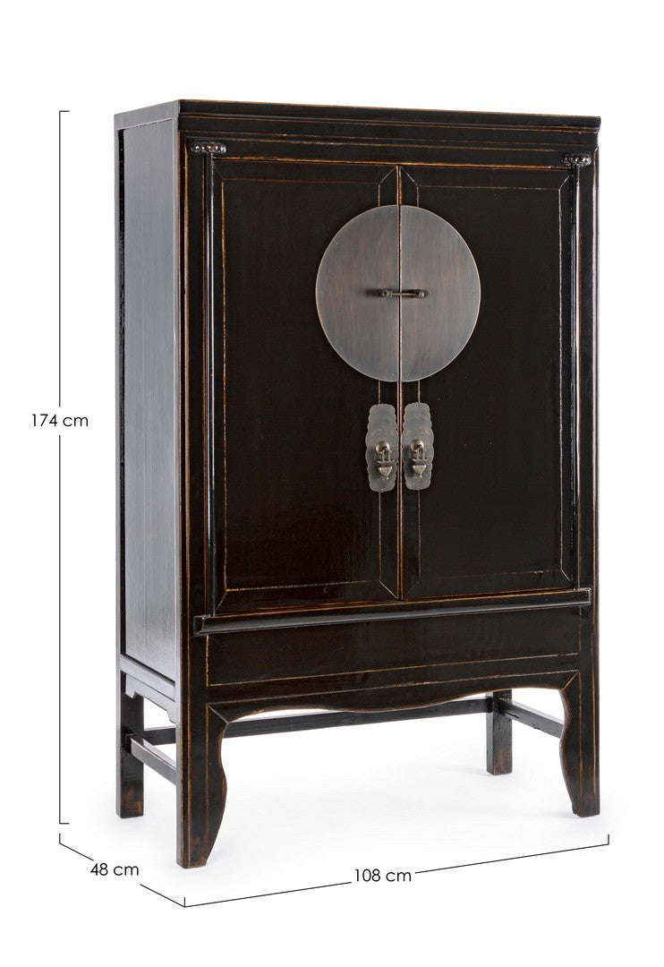 L'armoire "Jinan" avec étagères noires, avec structure en bois d'orme, est un meuble élégant et fonctionnel pour votre maison. Avec des dimensions de 108 x 48 x 174 cm, il offre de nombreux rangements avec style.