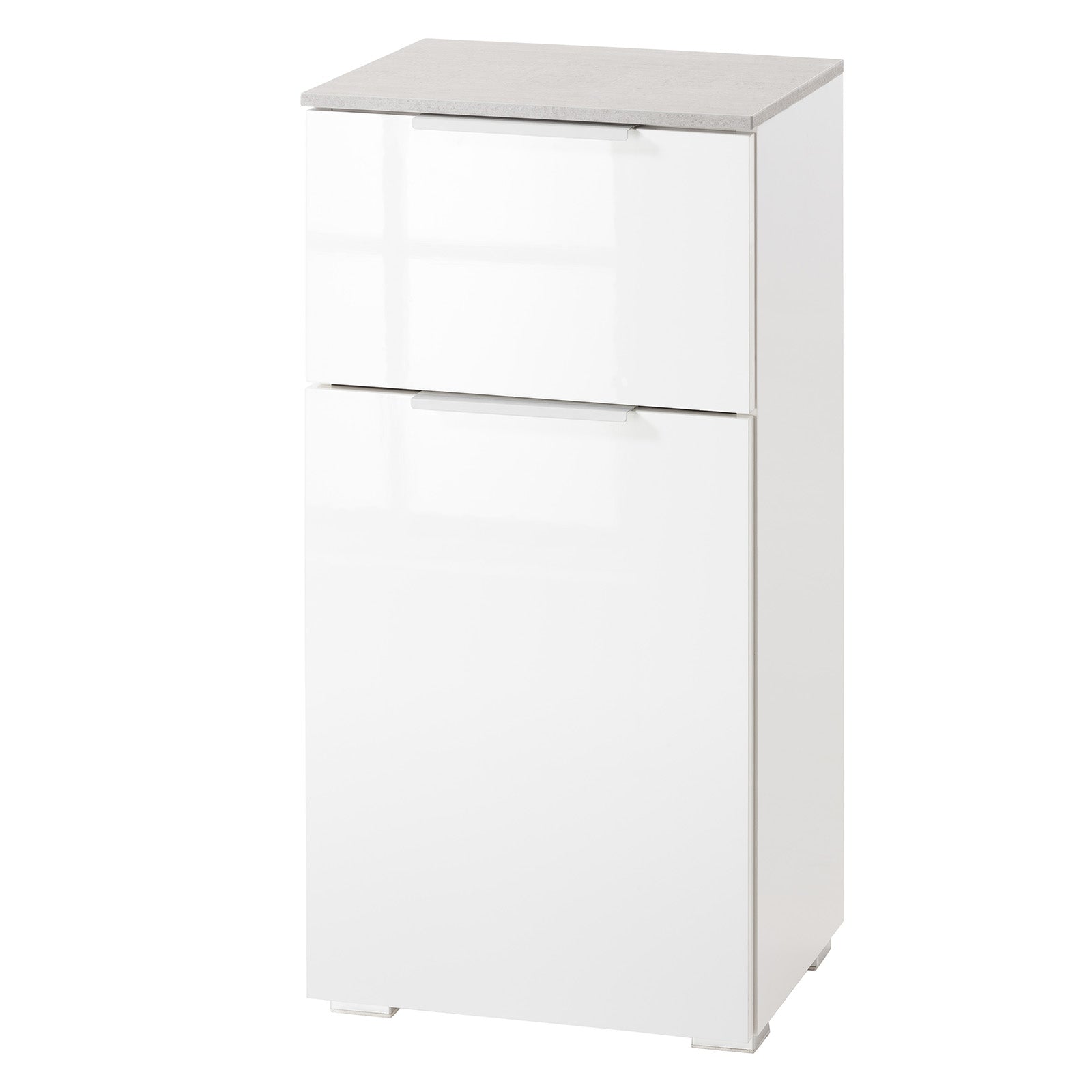Base de salle de bain simple blanc brillant et béton h 82 cm avec 1 porte et 1 tiroir en bois