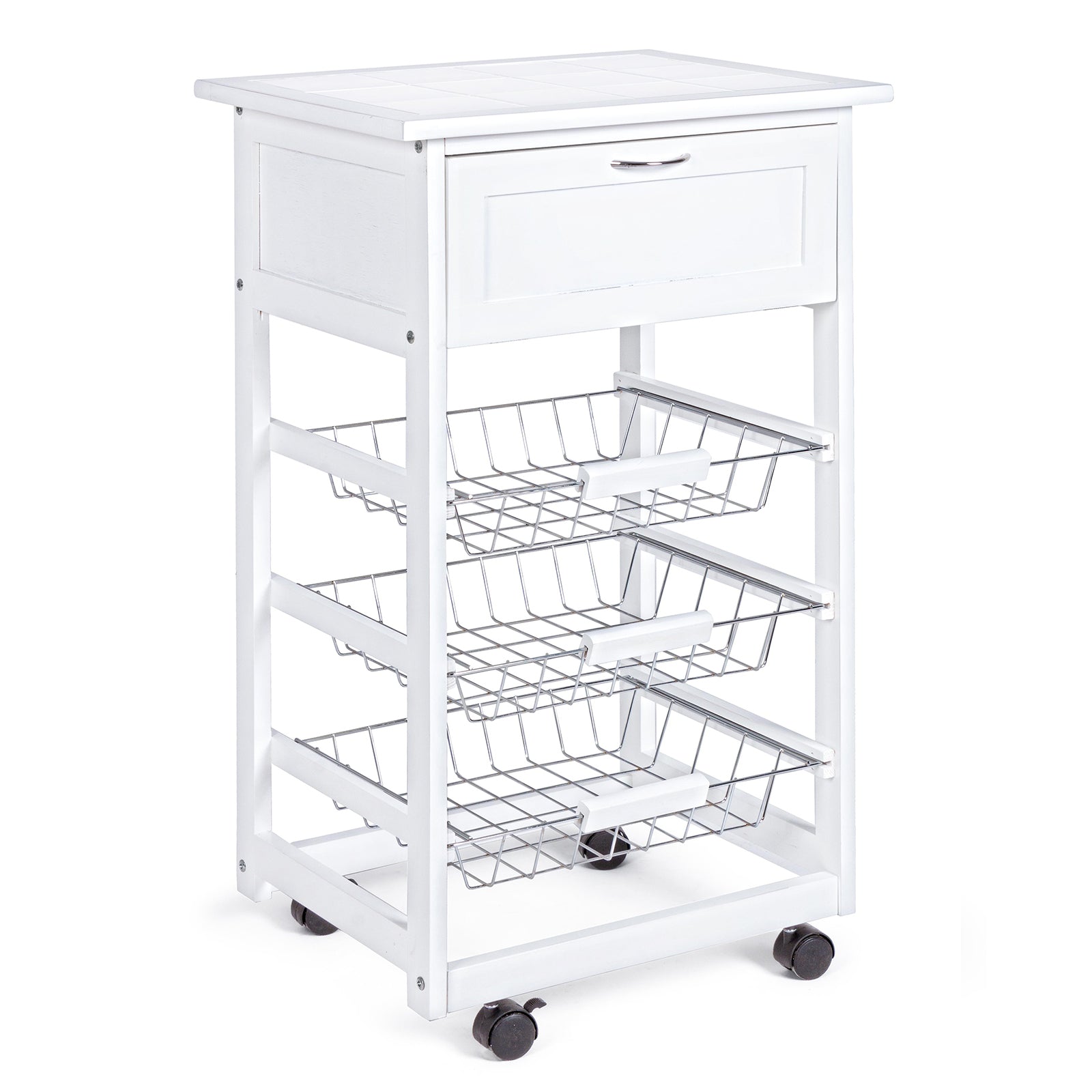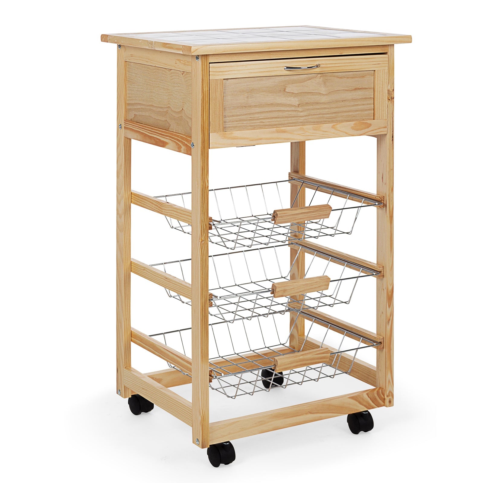 Prix régulier €81,90 Prix réduit €74,90Ce nouveau chariot de cuisine fonctionnel est entièrement réalisé en bois de bambou, il se caractérise par une étagère pratique qui peut être utilisée soit comme plan d'appui soit comme planche à découper, facile à nettoyer et à réutiliser avec 1 tiroir fermé et 3 paniers métalliques avec manche en bois où vous pourrez ranger fruits, légumes, nappes, etc.