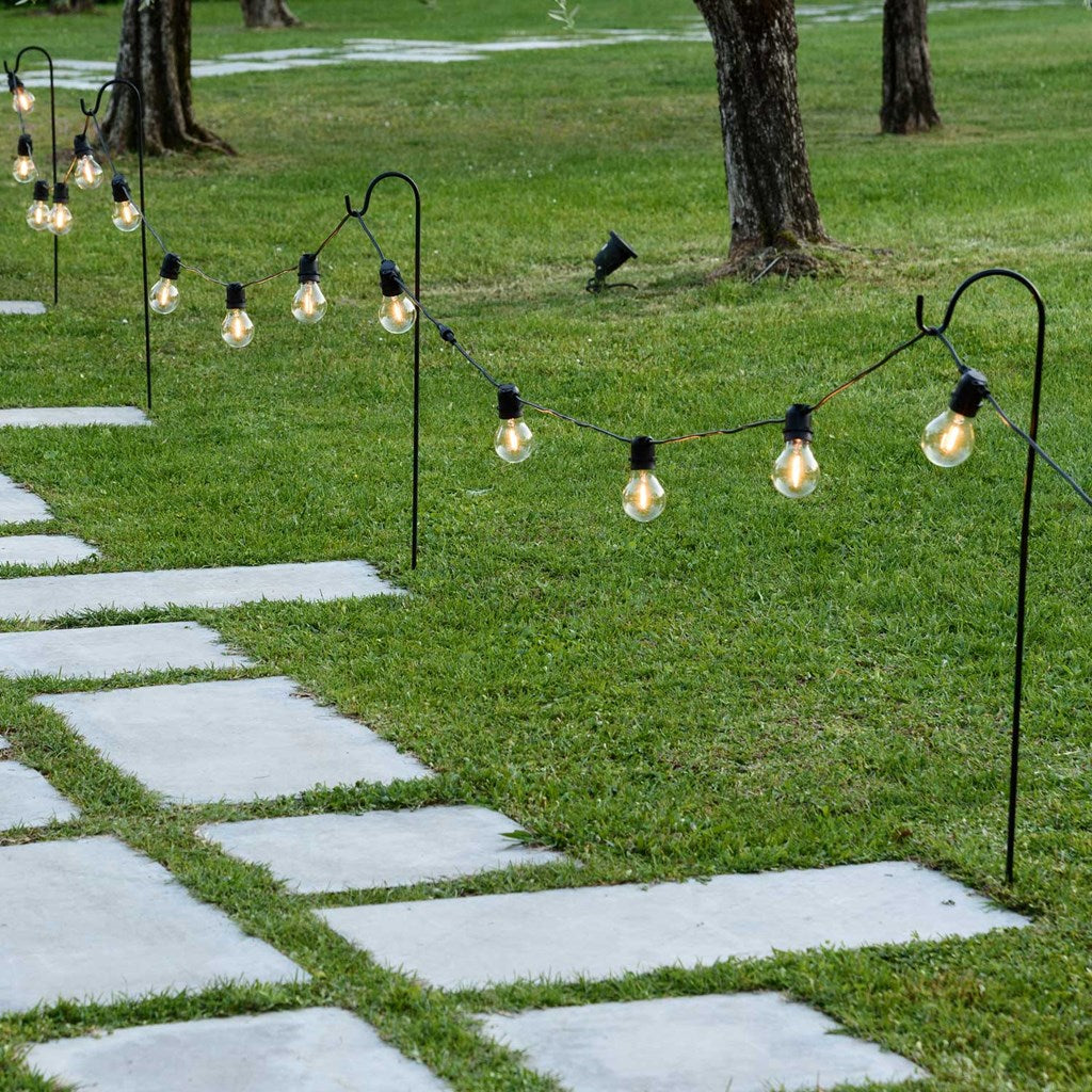 Ce fil noir mesure 5 mètres de long et comporte 10 ampoules en verre transparent suspendues à l'intérieur avec un filament LED qui diffuse une lumière chaude et fixe.