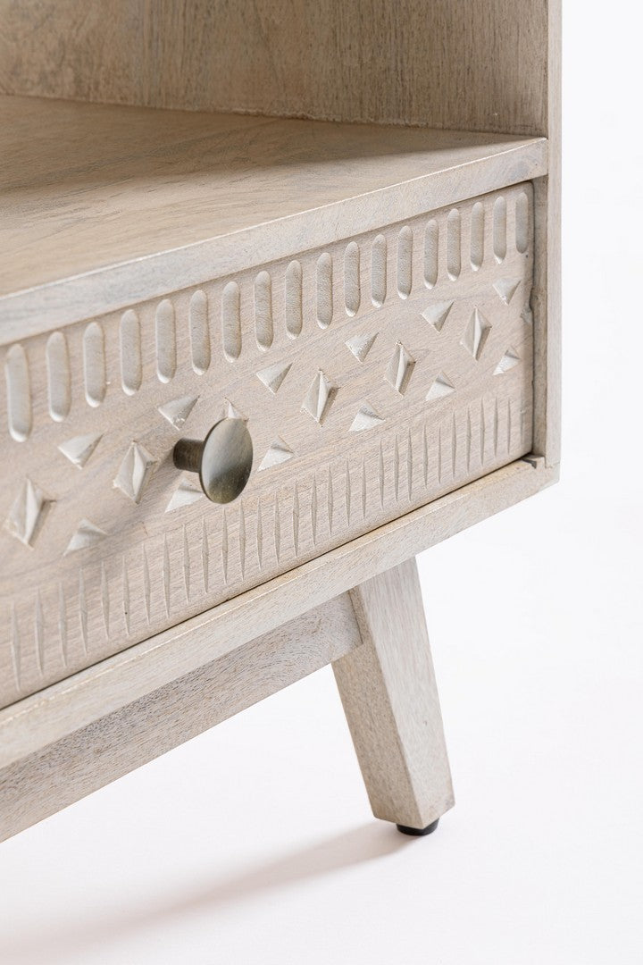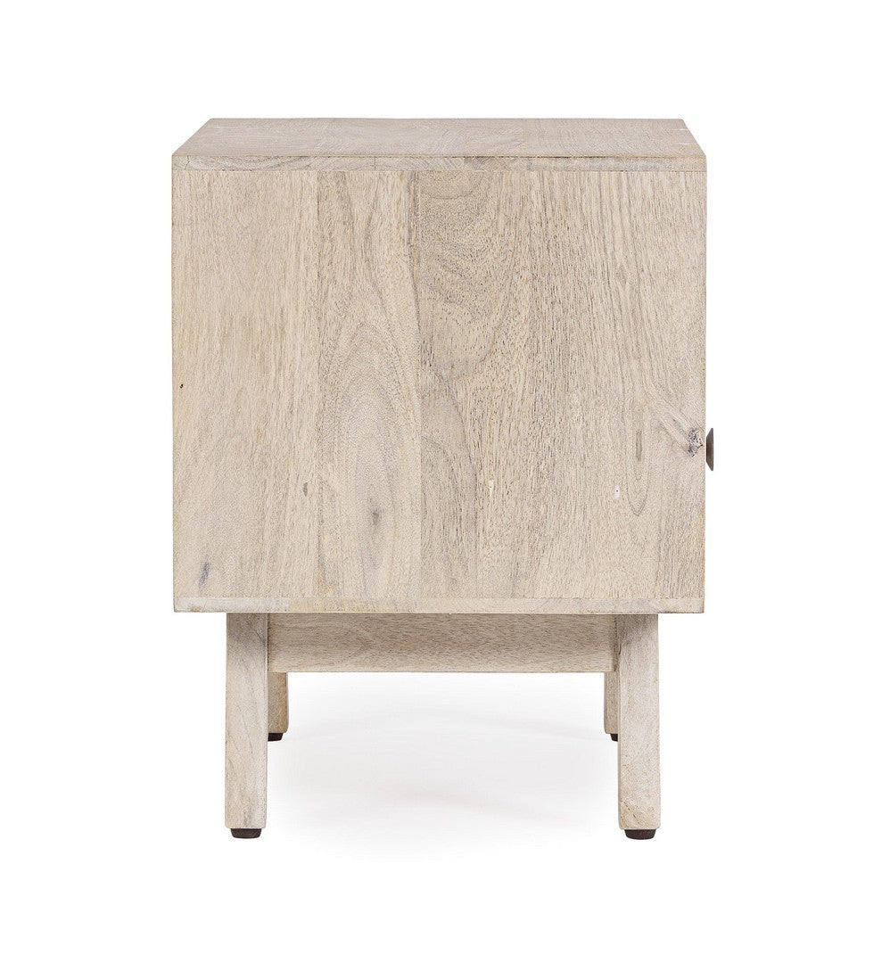 La structure en bois de manguier confère à la table de chevet un aspect chaleureux et naturel, tandis que le dos et le fond des tiroirs en MDF garantissent une surface lisse et uniforme. Le design de "Indira" est conçu pour s'adapter à différentes esthétiques d'ameublement, avec des lignes épurées et une élégance intrinsèque.