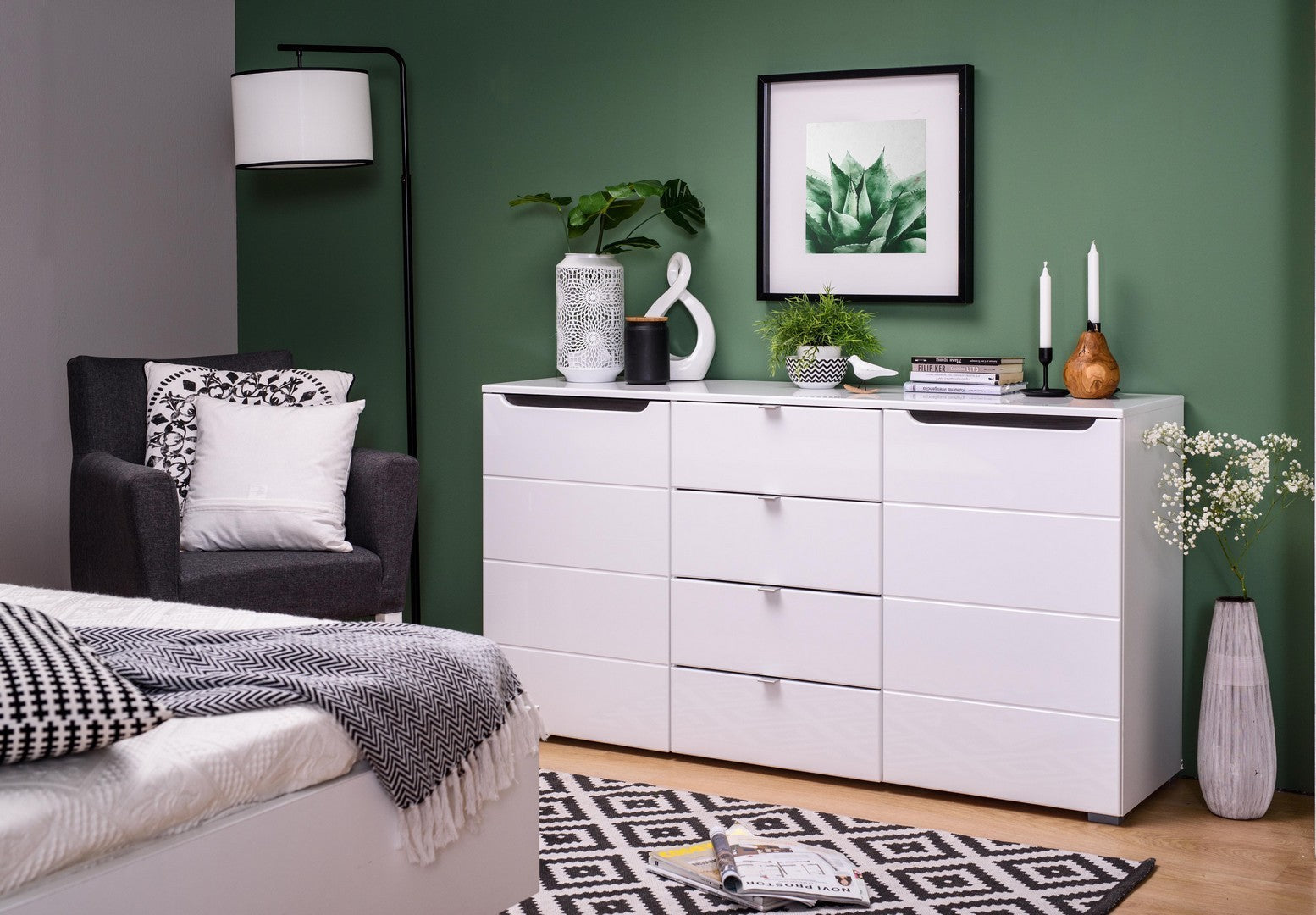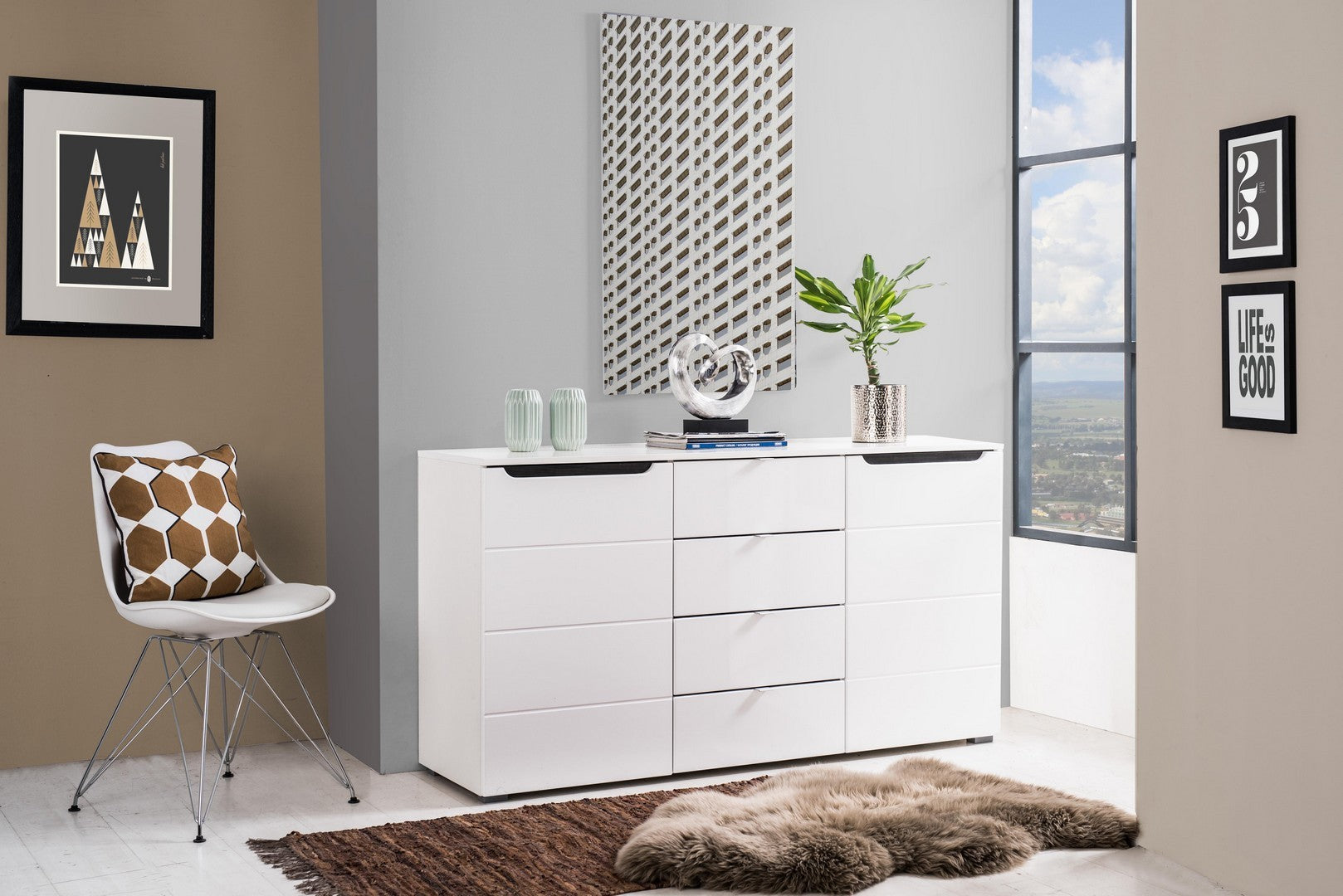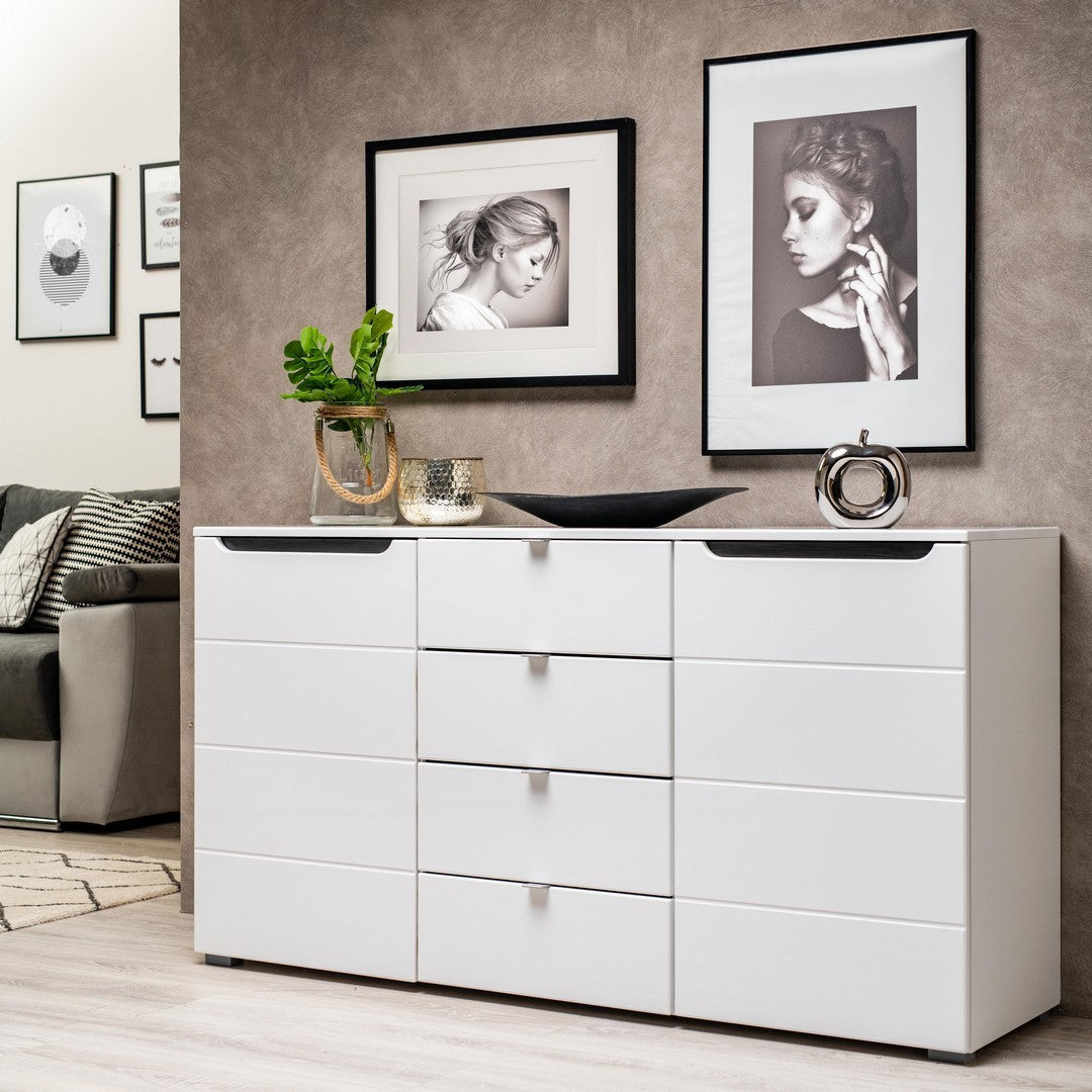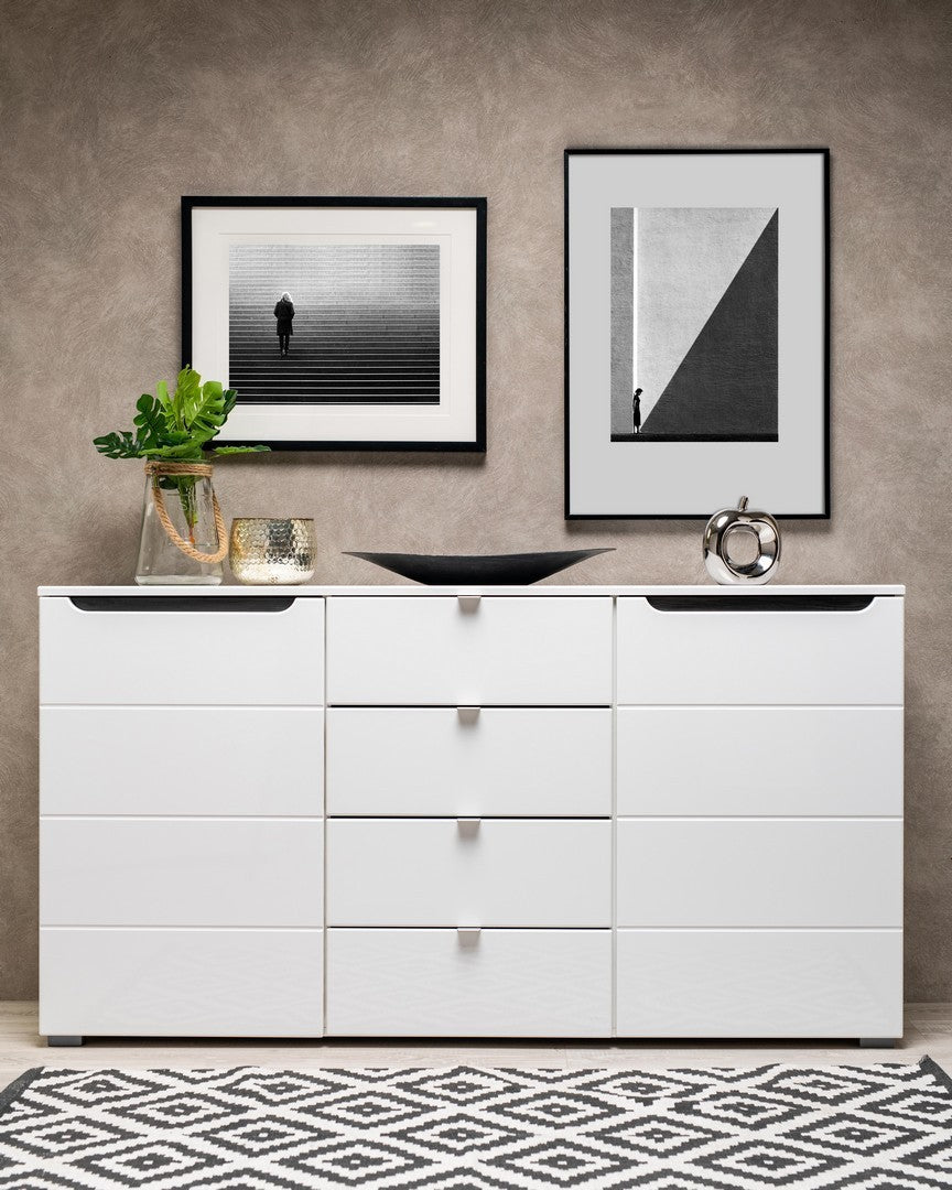 Buffet "Zurich", avec 2 portes et 4 tiroirs, blanc mat, avec structure en aggloméré recouvert, meuble en kit