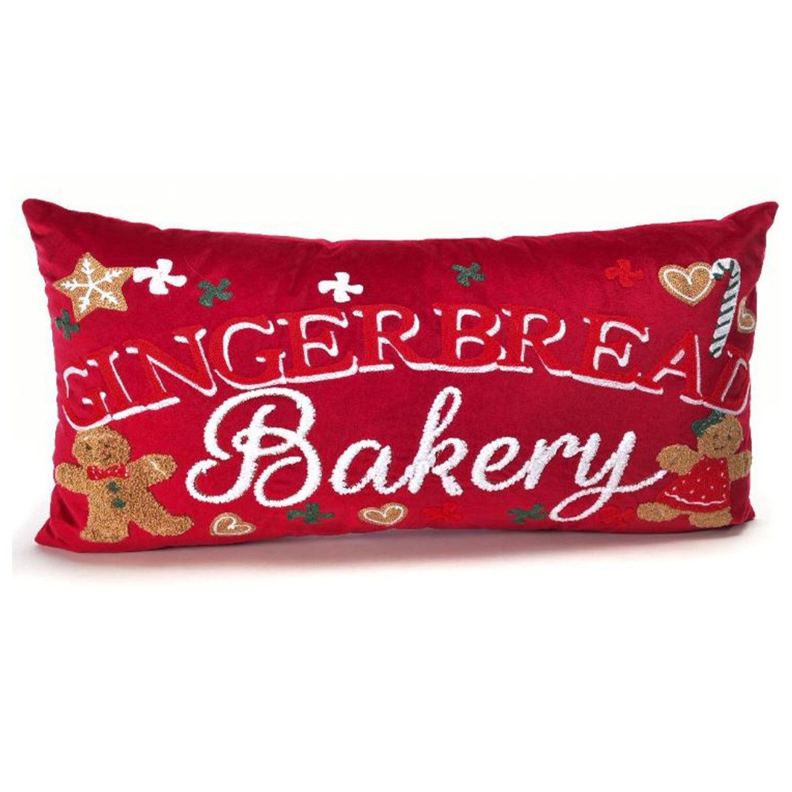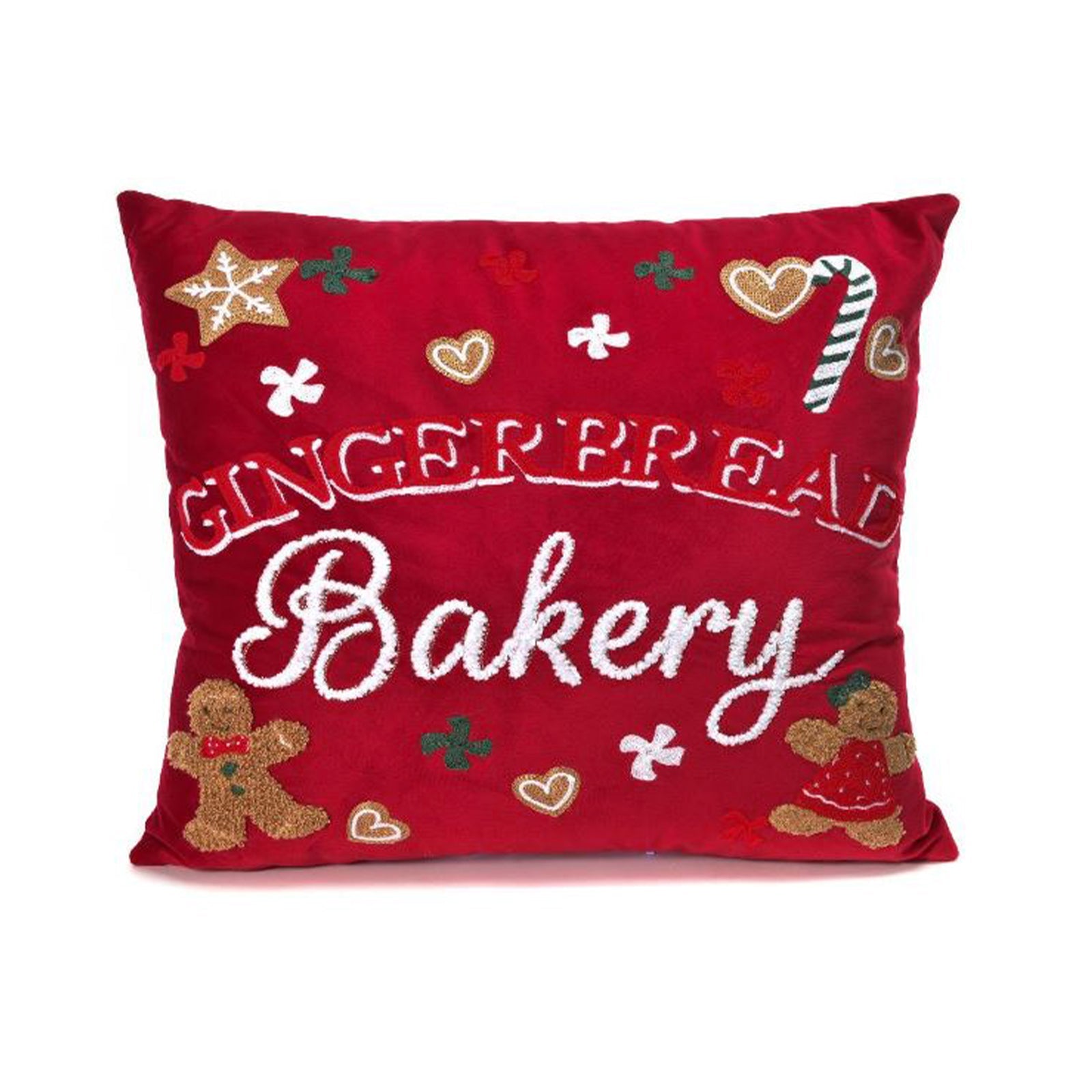 L'imprimé « Gingerbread Bakery » est le thème principal de l'oreiller, représentant des motifs de Noël tels que des bonbons en pain d'épice, des maisons décorées et d'autres symboles traditionnels associés à Noël.
