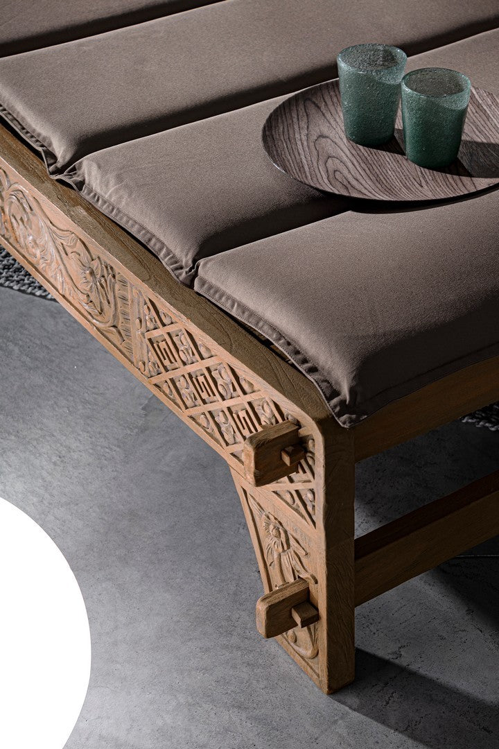 Les côtés du lit de repos sont incrustés à la main par des artisans experts. Le coussin d'assise est amovible et fabriqué avec un tissu Sunproof Olefin, 100% polypropylène, qui offre une bonne résistance aux rayons UV et à l'eau.