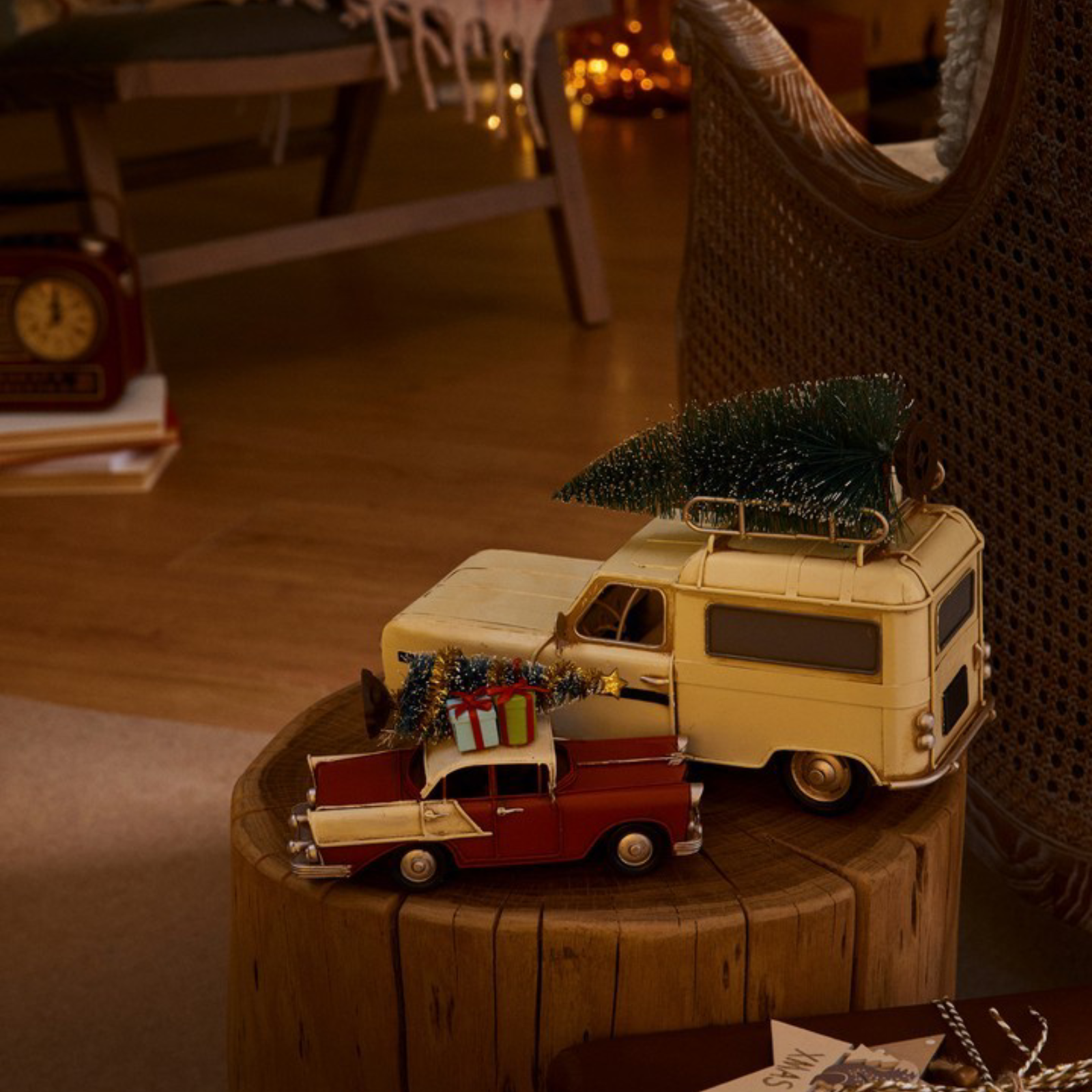 Cette jolie pièce décorative incarne l'esprit de Noël, combinant la figure emblématique d'une voiture vintage avec des éléments de Noël traditionnels
