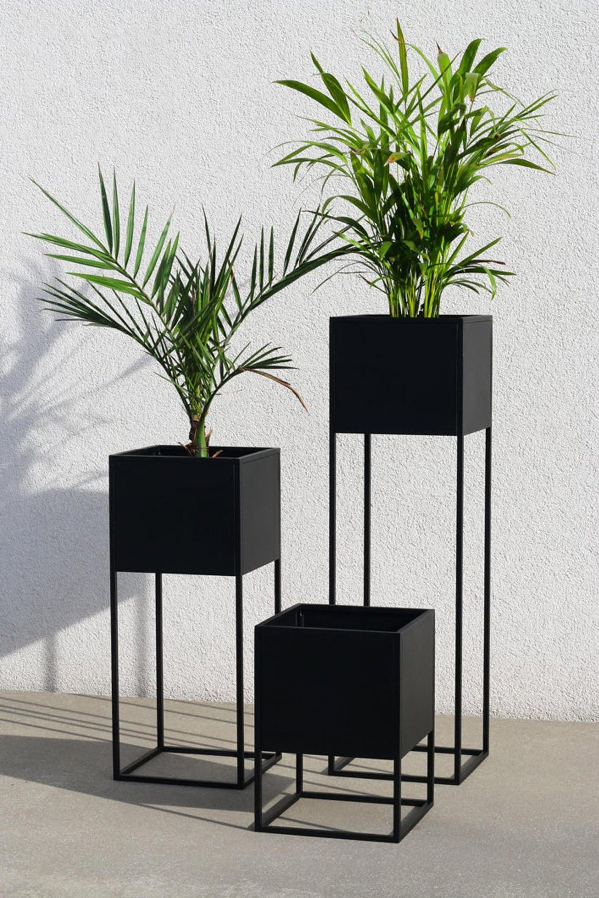 L'ensemble se compose de trois cache-pots de tailles différentes : la plus petite jardinière a une largeur et une profondeur de 20 cm et une hauteur de 35 cm, la moyenne a une largeur et une profondeur de 25 cm et une hauteur de 47 cm, tandis que la plus grande jardinière a une largeur et une profondeur de 30 cm et une hauteur de 72 cm.