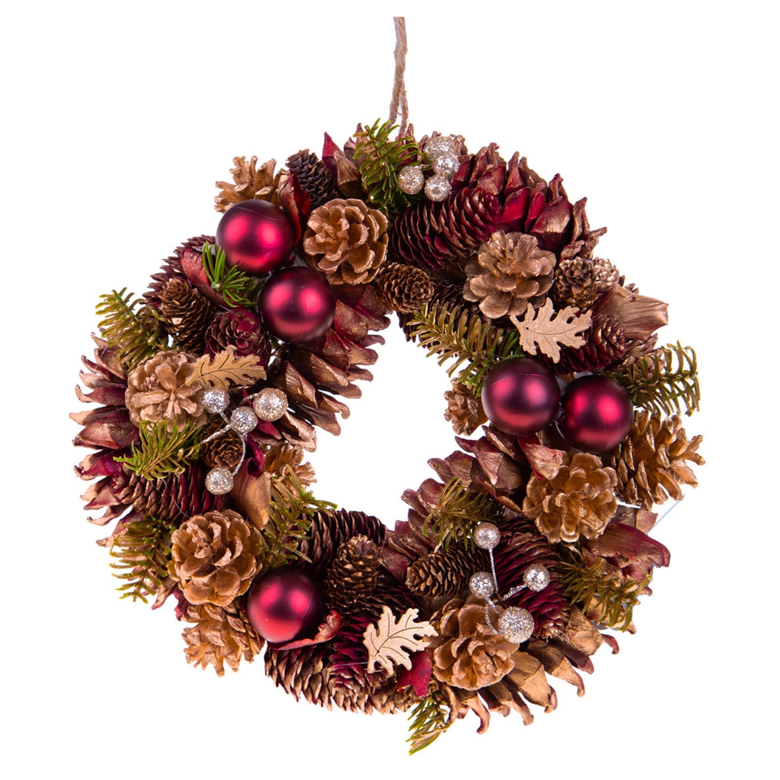 La couronne est principalement composée de boules de bois et de pommes de pin, ce qui lui confère un aspect naturel et traditionnel. Les boules en bois pourraient être peintes avec des couleurs de Noël ou des décorations typiques de l'époque, tandis que les pommes de pin ajoutent une note rustique et automnale à la composition.