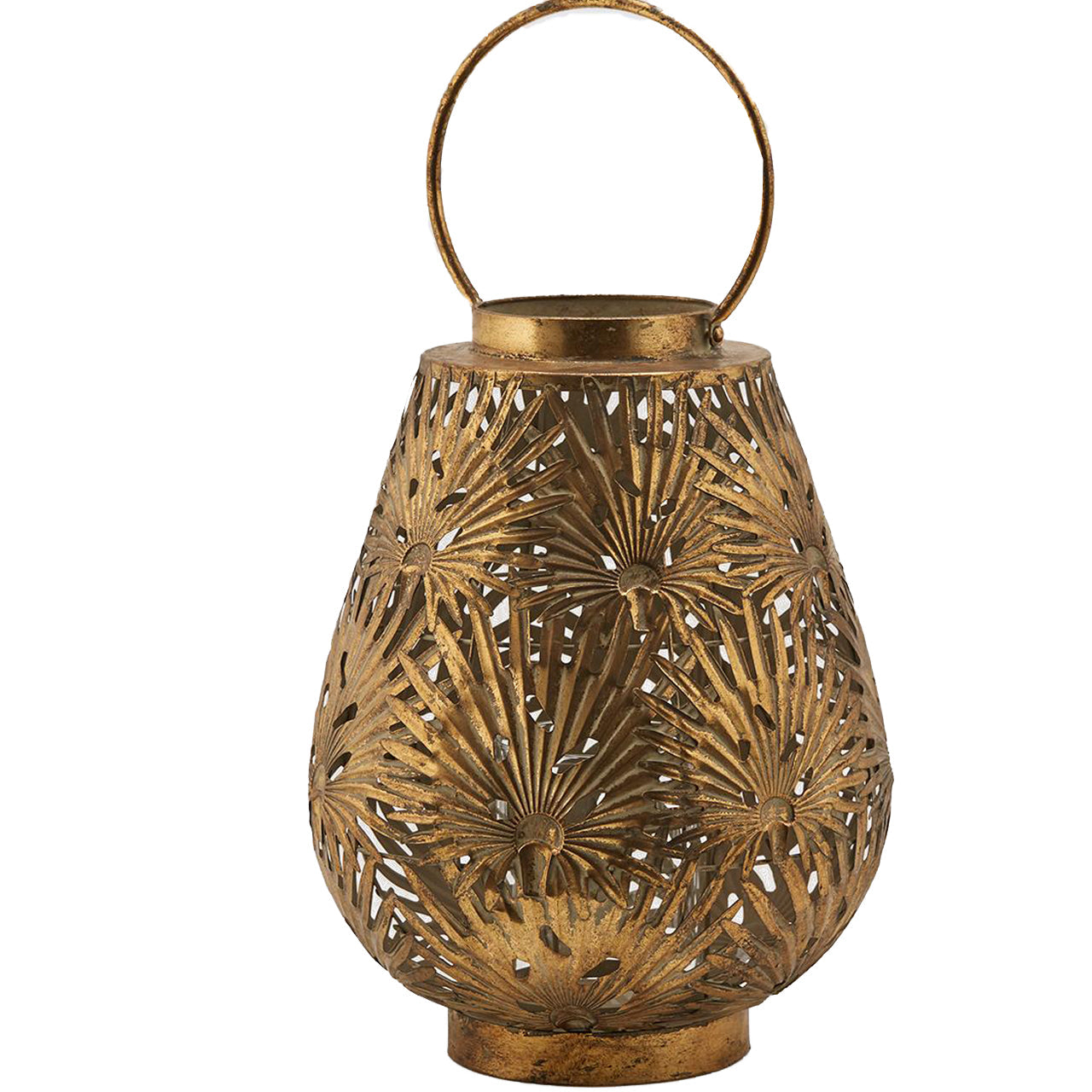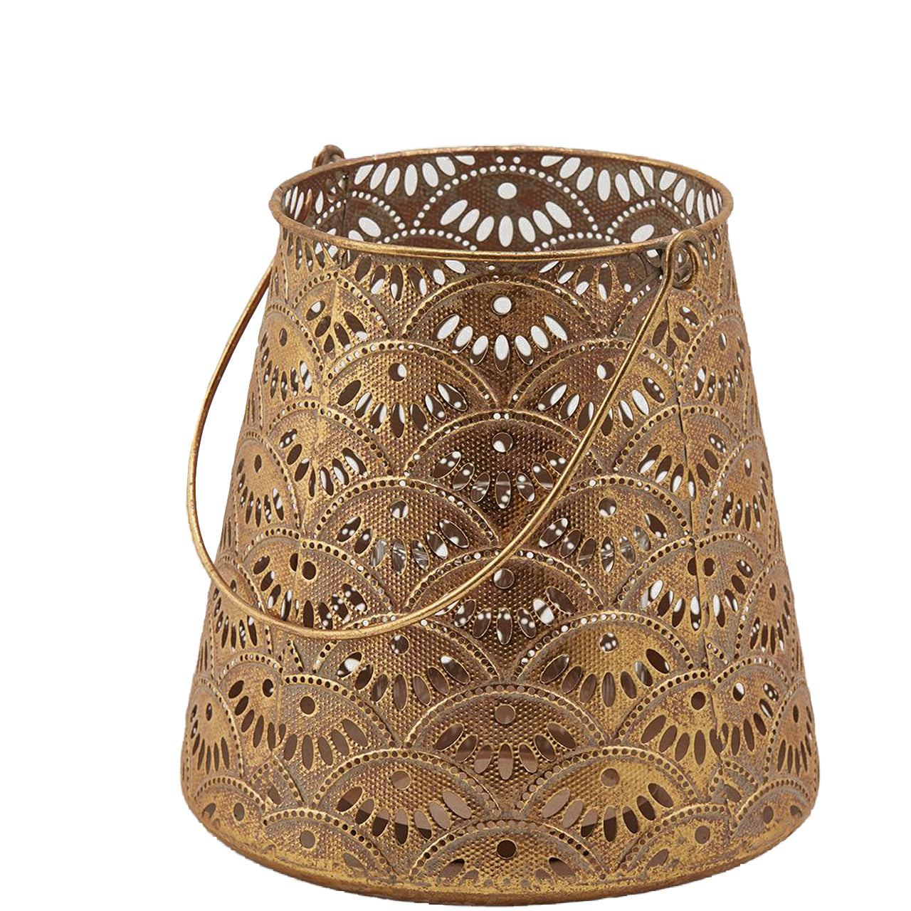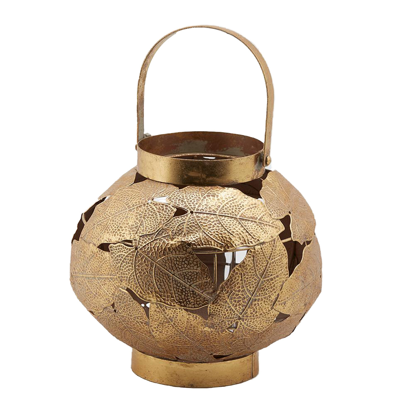 Prix régulier €62,90 Prix réduit €11,90La lanterne décorative décrite est un objet en métal présentant un élégant motif de feuilles dorées. Sa structure est conçue pour ressembler à une lanterne traditionnelle, avec des panneaux de verre transparent qui permettent à la lumière de dégager une atmosphère chaleureuse et relaxante.