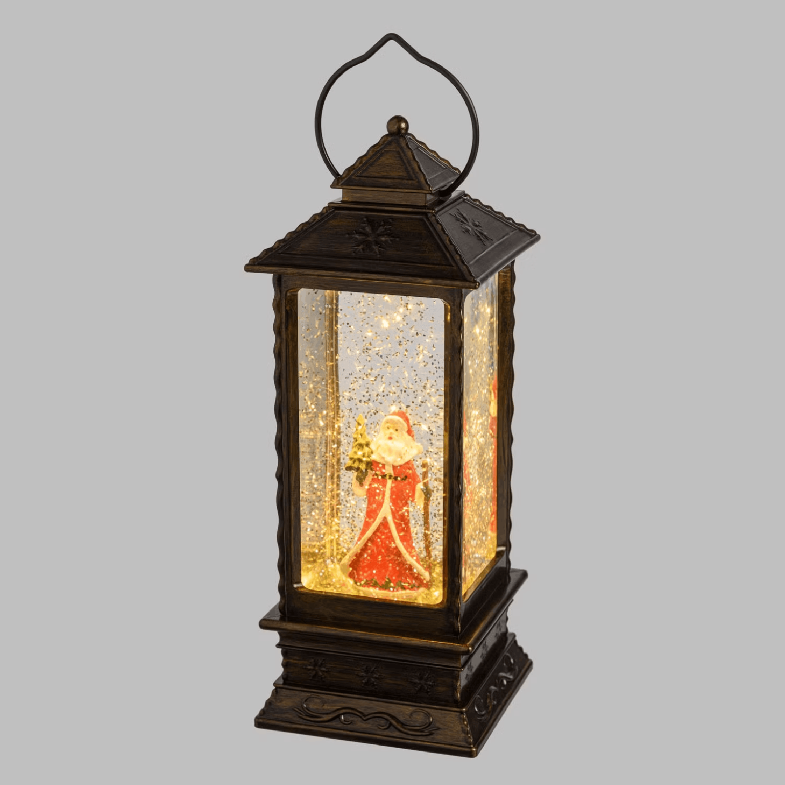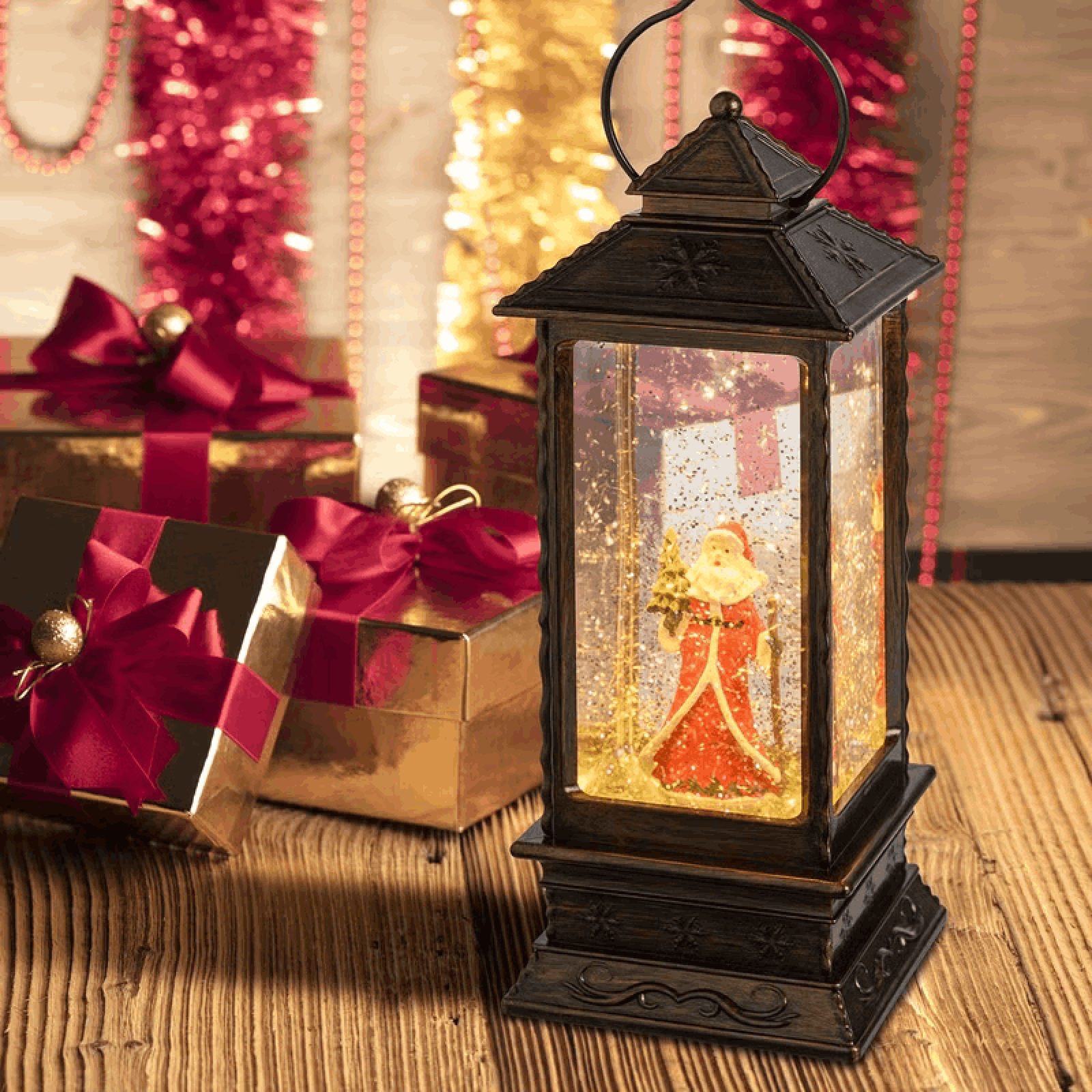 Derrière la vitre, on aperçoit un Père Noël dans la neige, tombant en gros flocons mobiles. L'effet est possible grâce aux paillettes contenues dans l'eau.