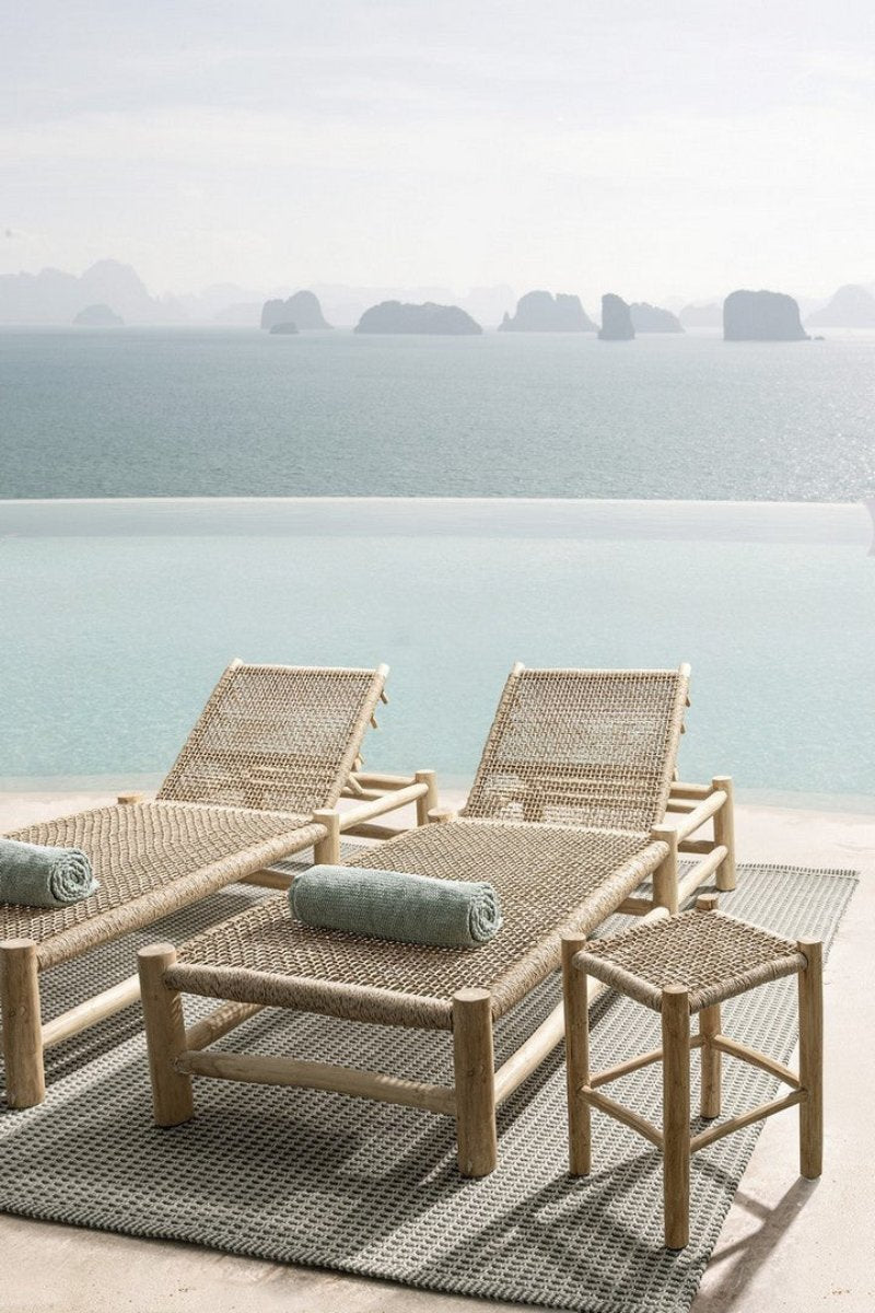 En résumé, le transat "Lampok" avec structure en branches de teck et tissage de fibres synthétiques offre un design unique et distinctif pour ceux qui recherchent une solution originale pour la détente en plein air. Avec le dossier inclinable, il offre un confort personnalisé, tandis que la préconisation de protection et l'acceptation des fissures et petites fissures confèrent à la chaise longue un aspect authentique et naturel.