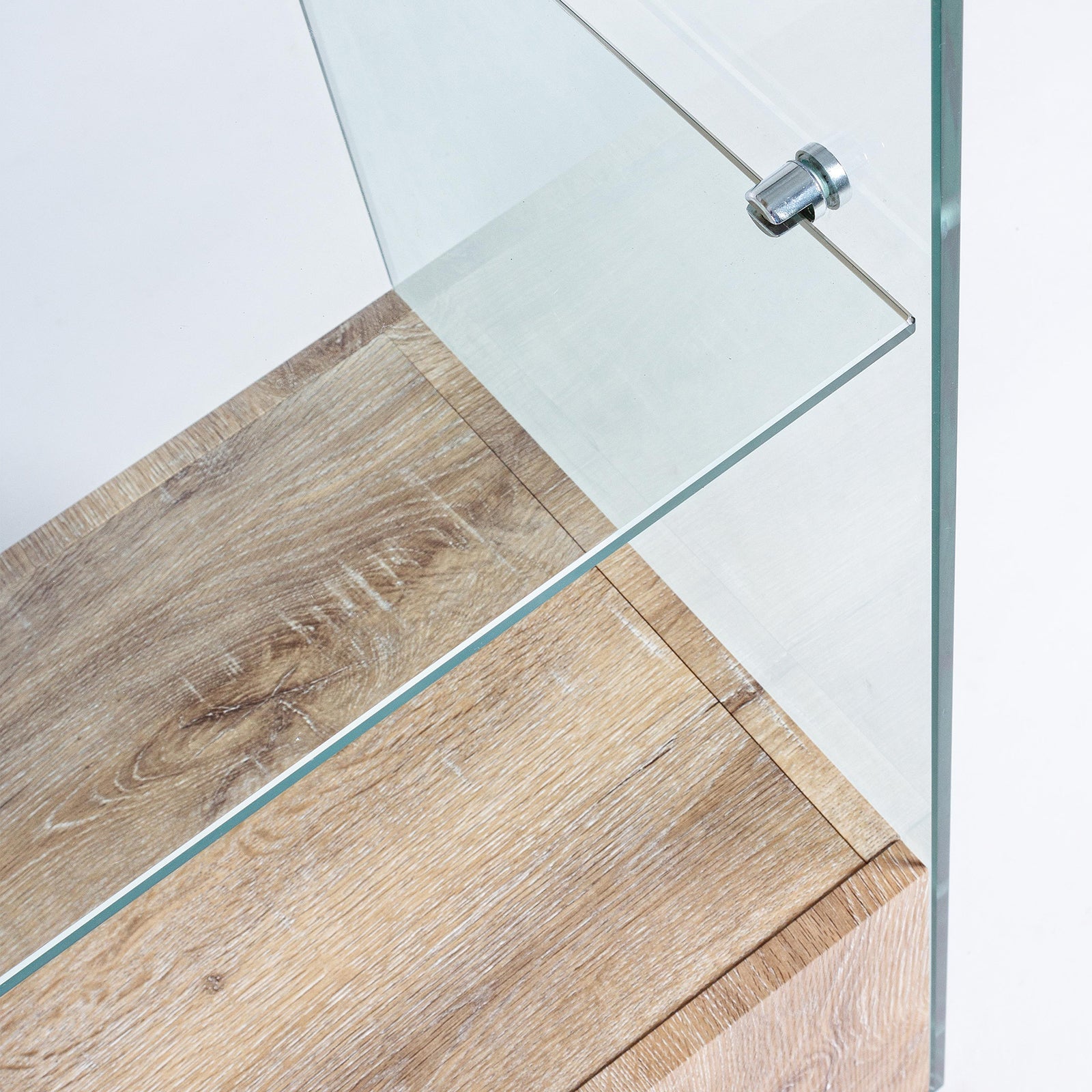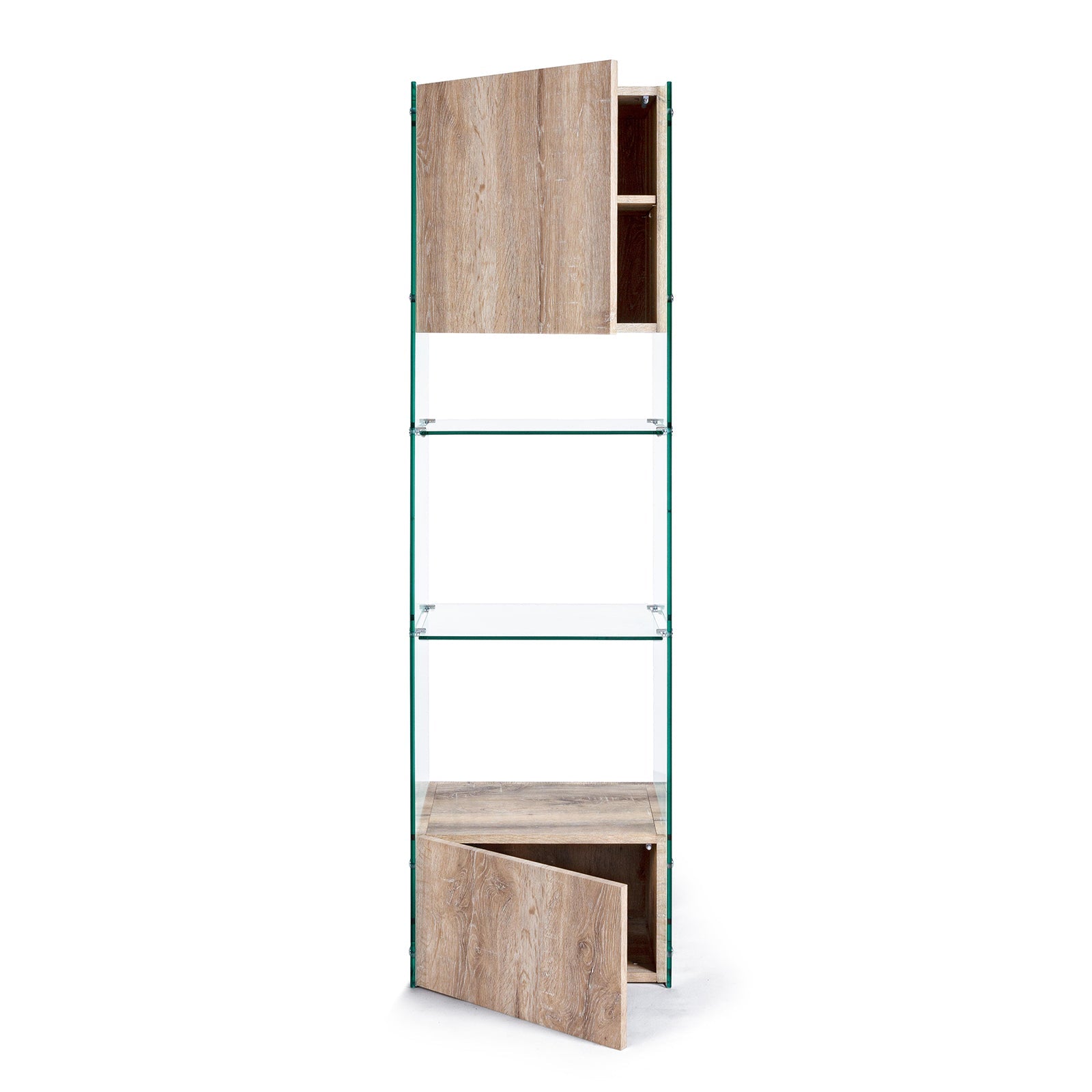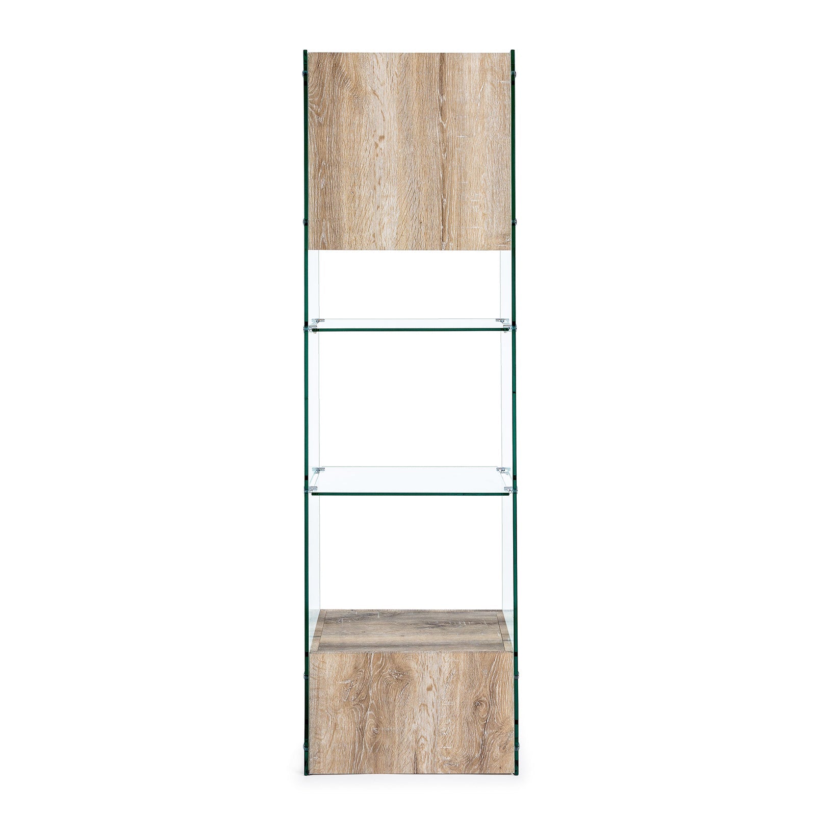 La bibliothèque design est composée de caissons de différentes tailles, en verre trempé, superposés de manière décalée et irrégulière. La structure est ensuite renforcée et stabilisée par des éléments de rigidification métalliques, positionnés aux points de jonction.