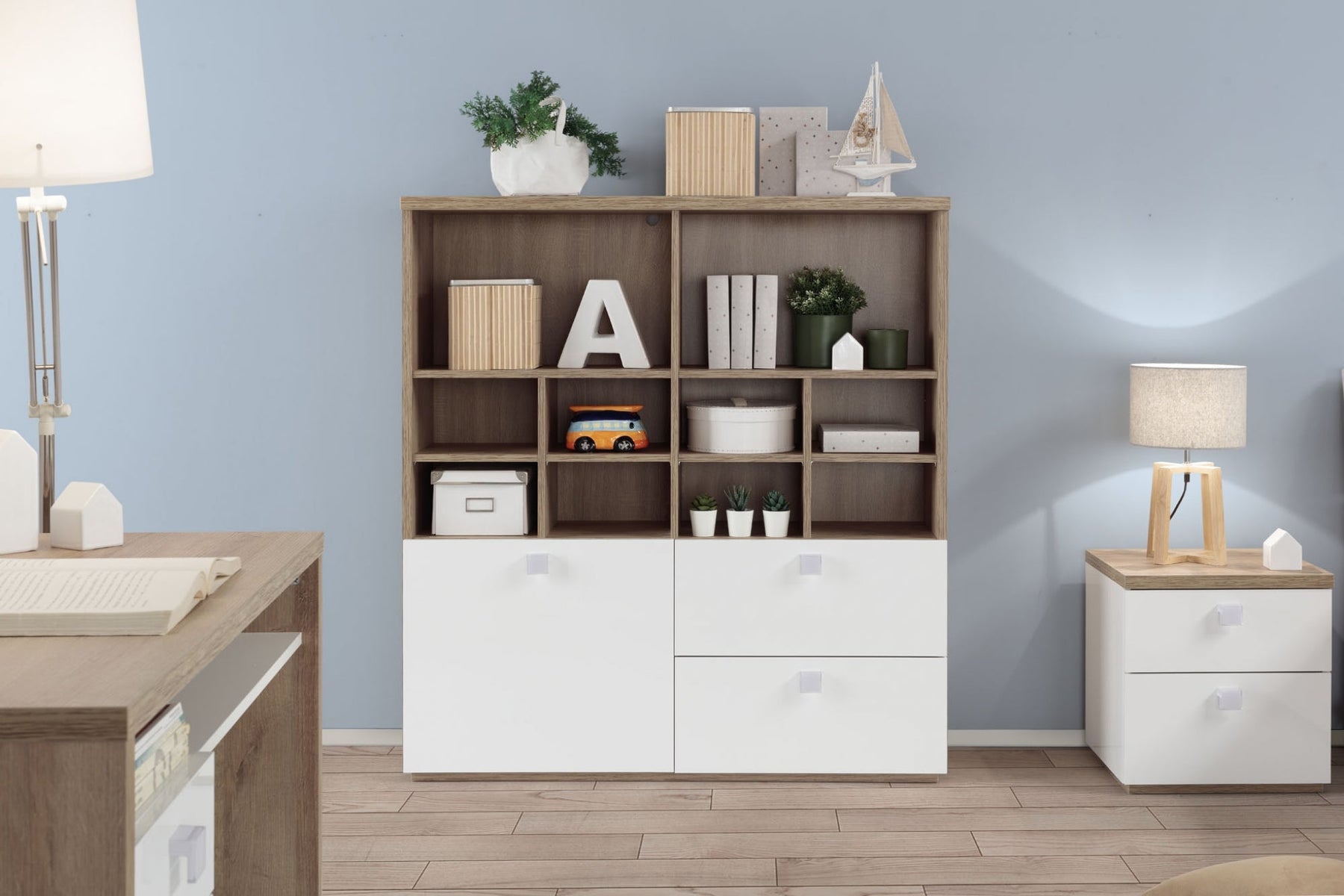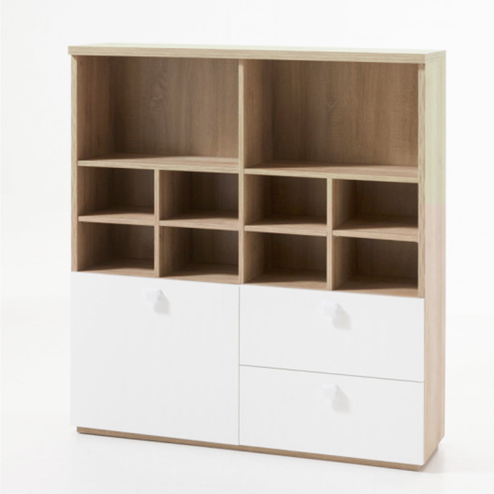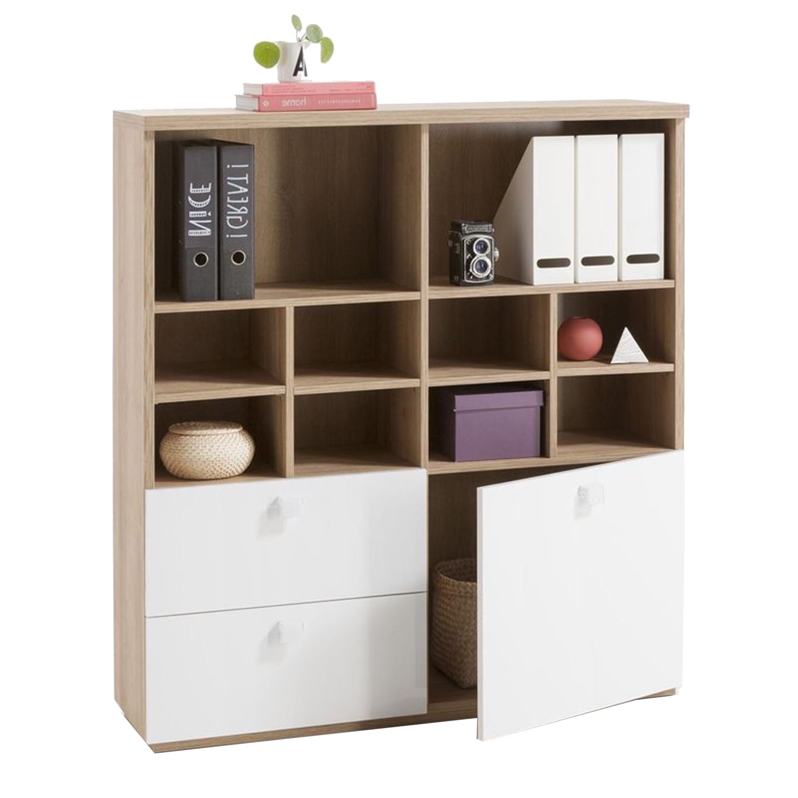 Prix régulier €312,90 Prix réduit €274,90Meuble bibliothèque ligne Globo, structure en chêne Riviera avec porte et deux tiroirs laqués blanc brillant.