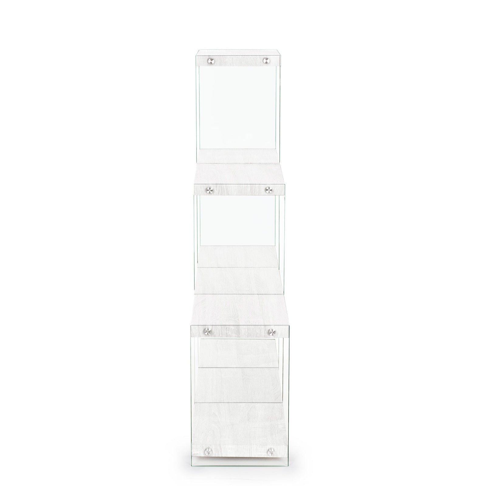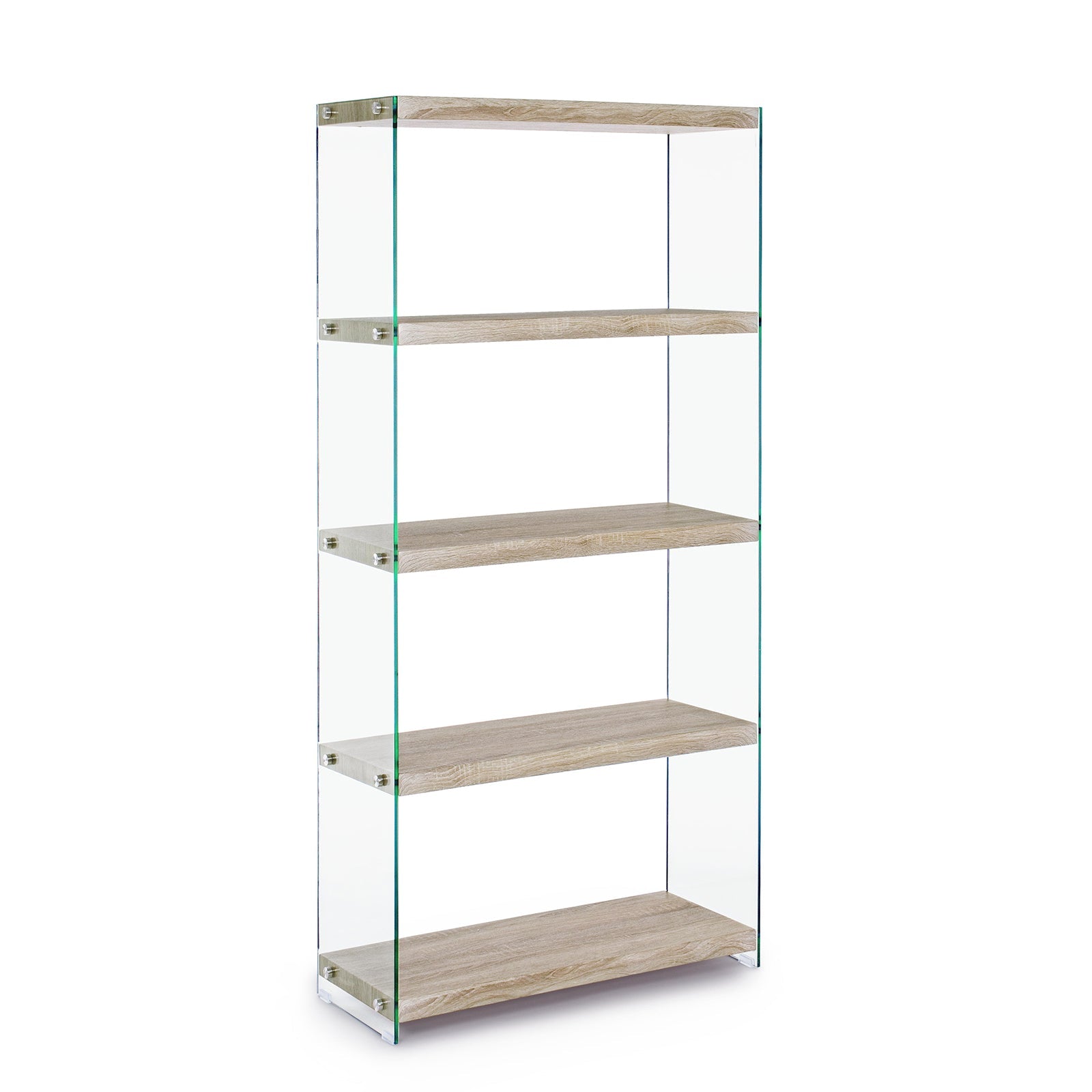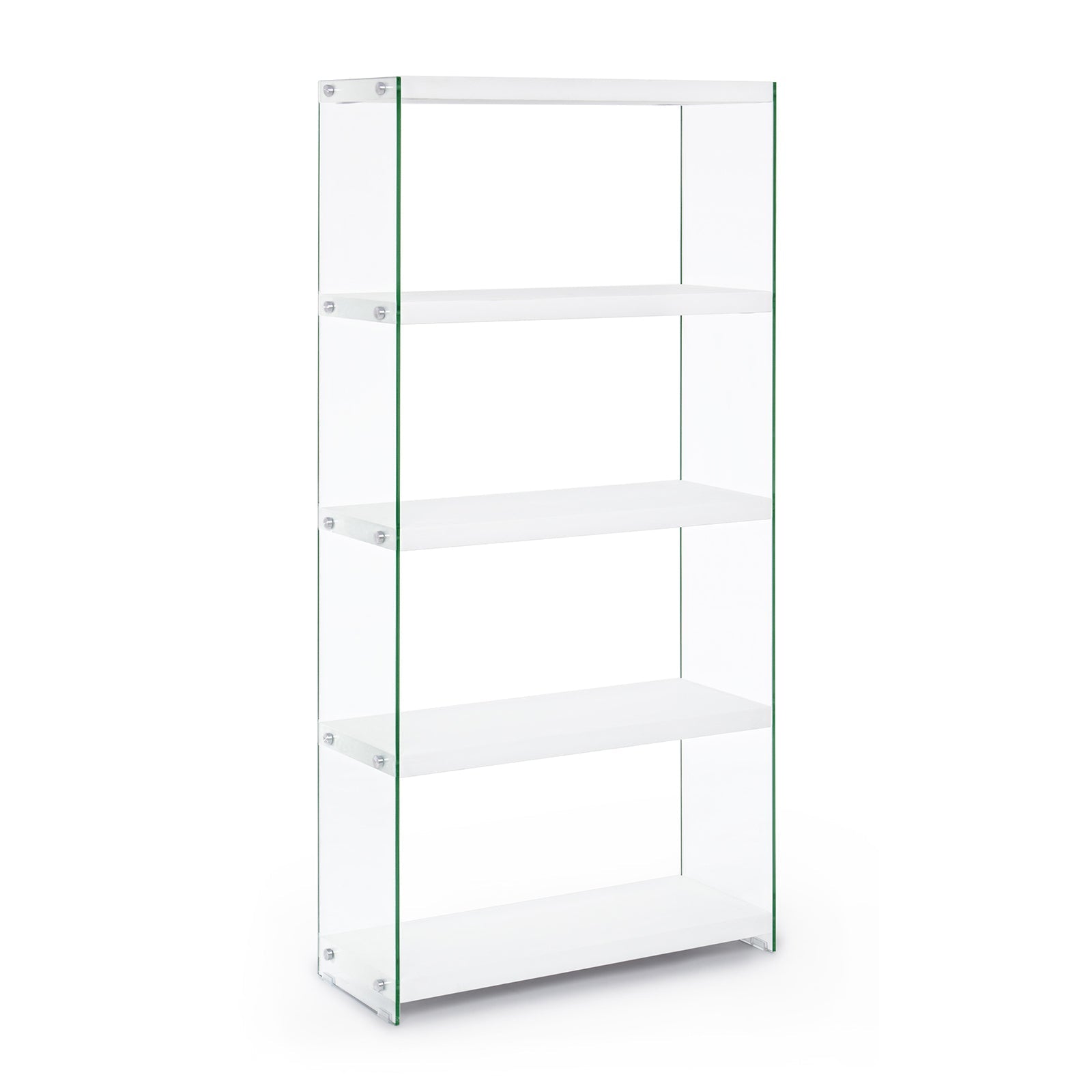 La bibliothèque design est composée de caissons de différentes tailles, en verre trempé, superposés de manière décalée et irrégulière. La structure est ensuite renforcée et stabilisée par des éléments de rigidification métalliques, positionnés aux points de jonction.
