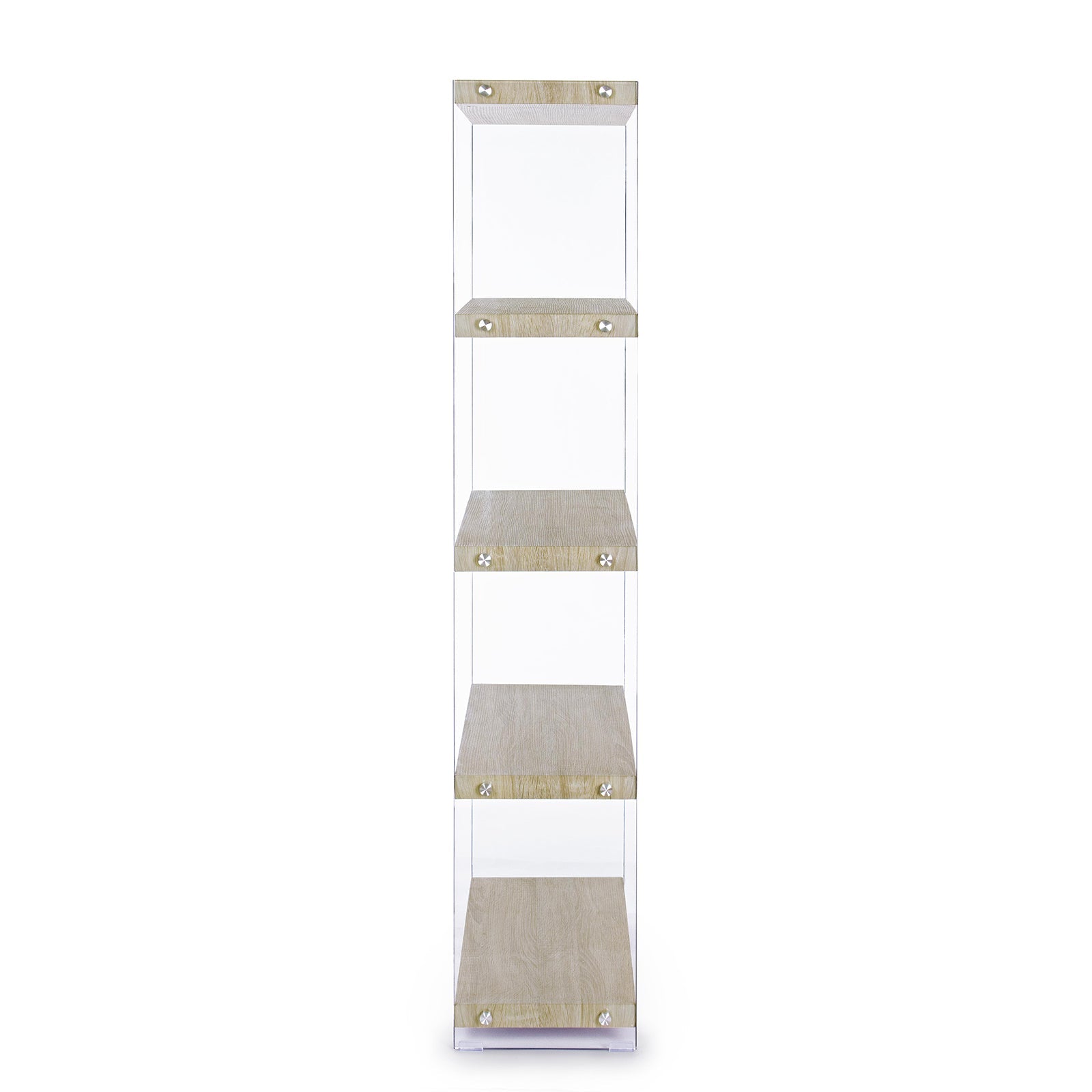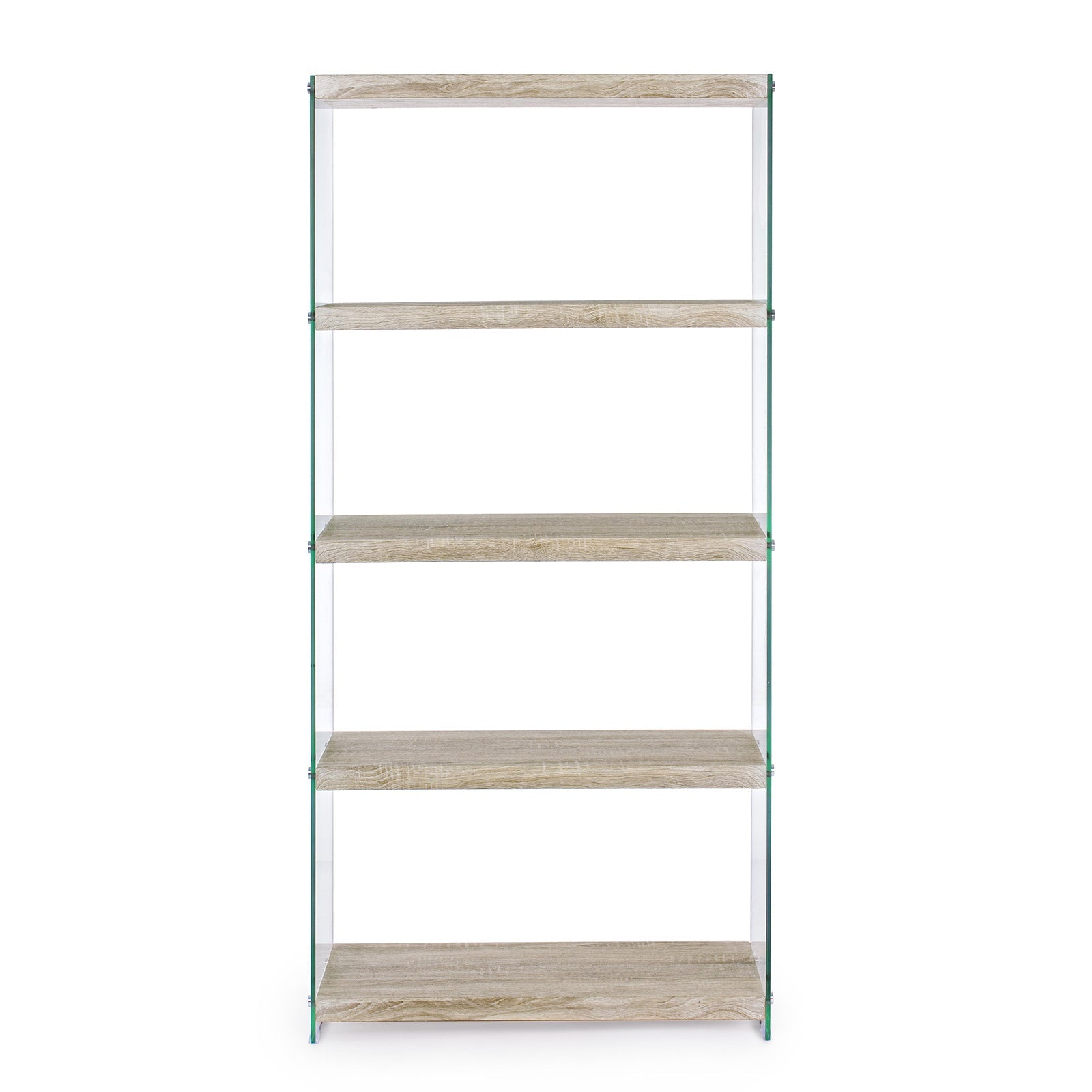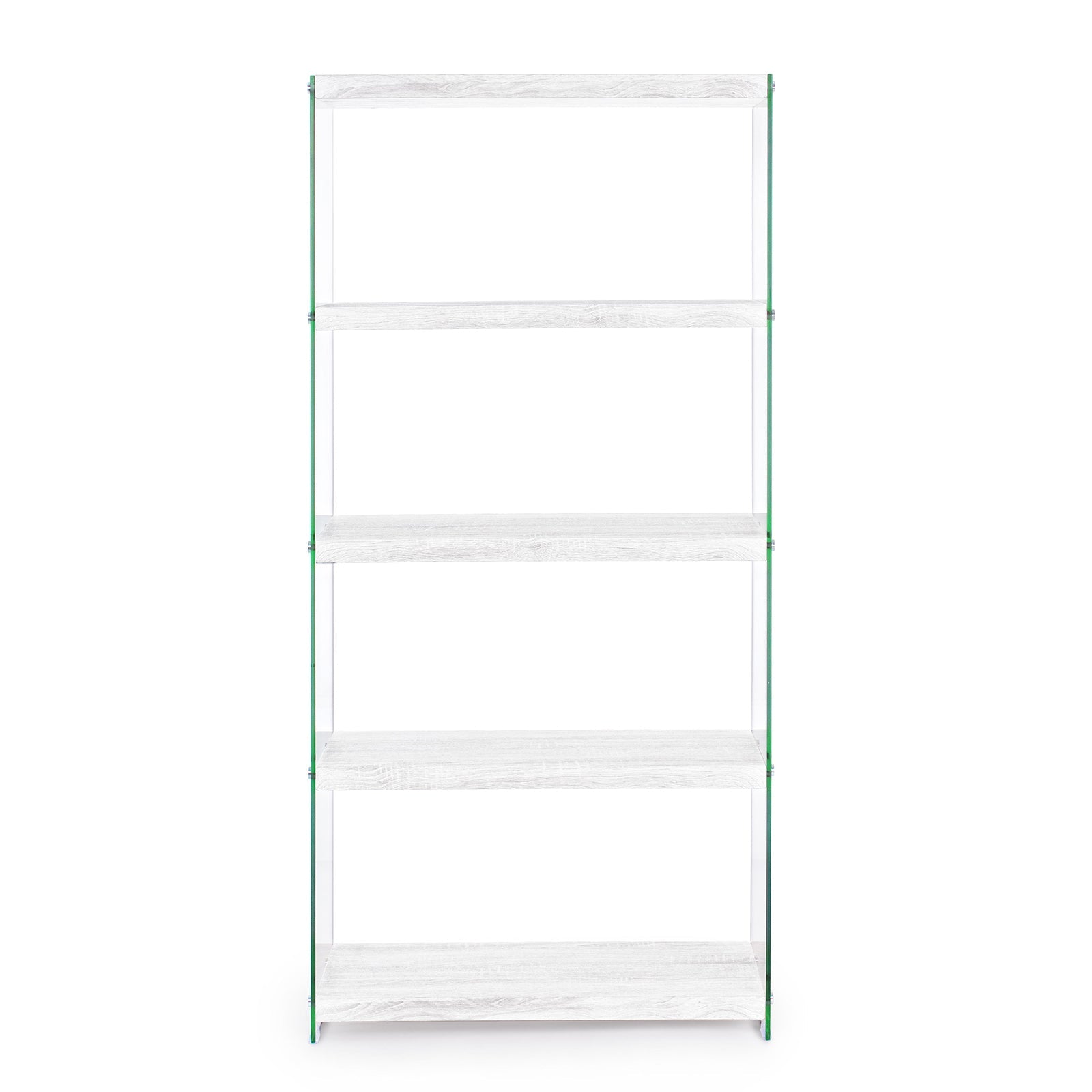 La bibliothèque design est composée de caissons de différentes tailles, en verre trempé, superposés de manière décalée et irrégulière. La structure est ensuite renforcée et stabilisée par des éléments de rigidification métalliques, positionnés aux points de jonction.