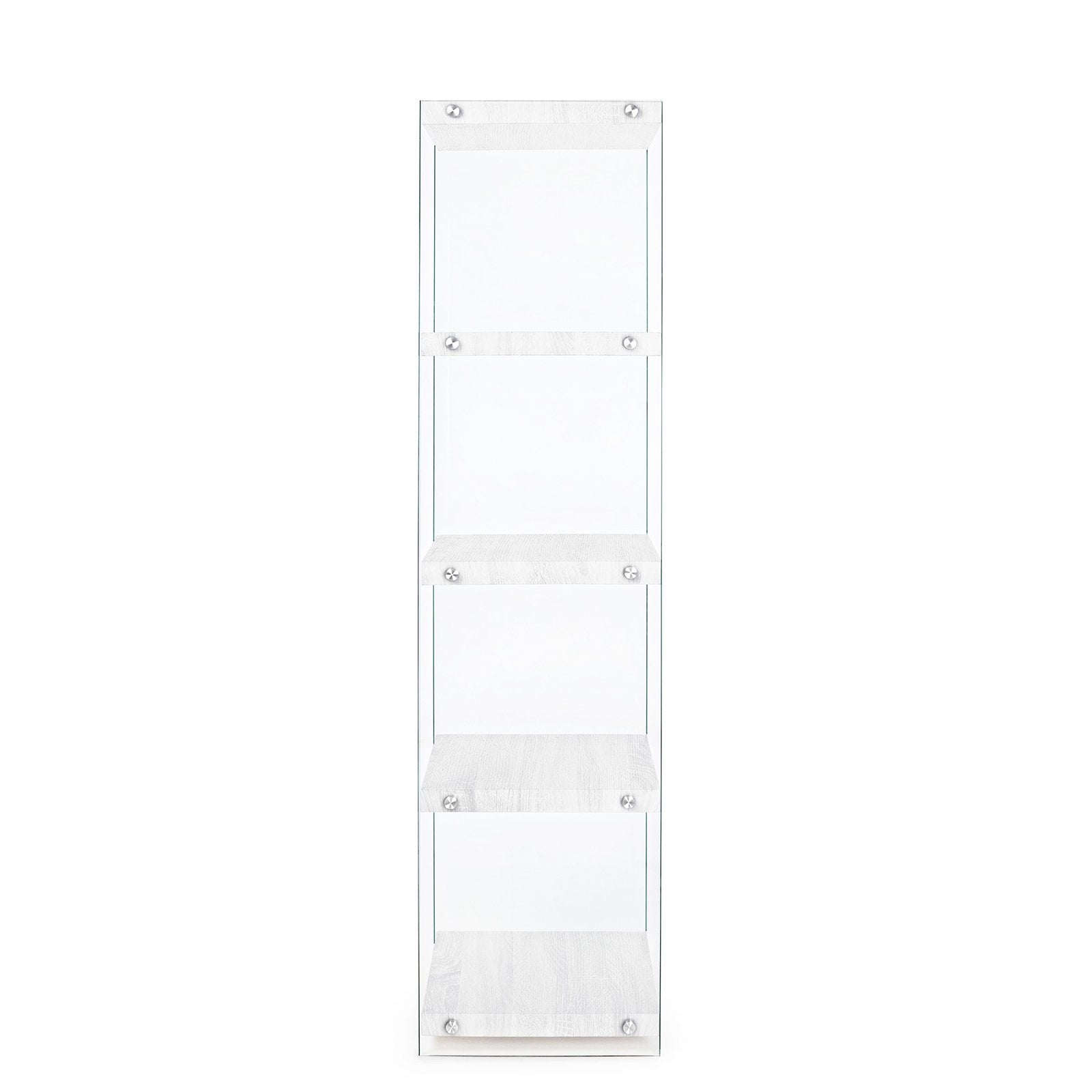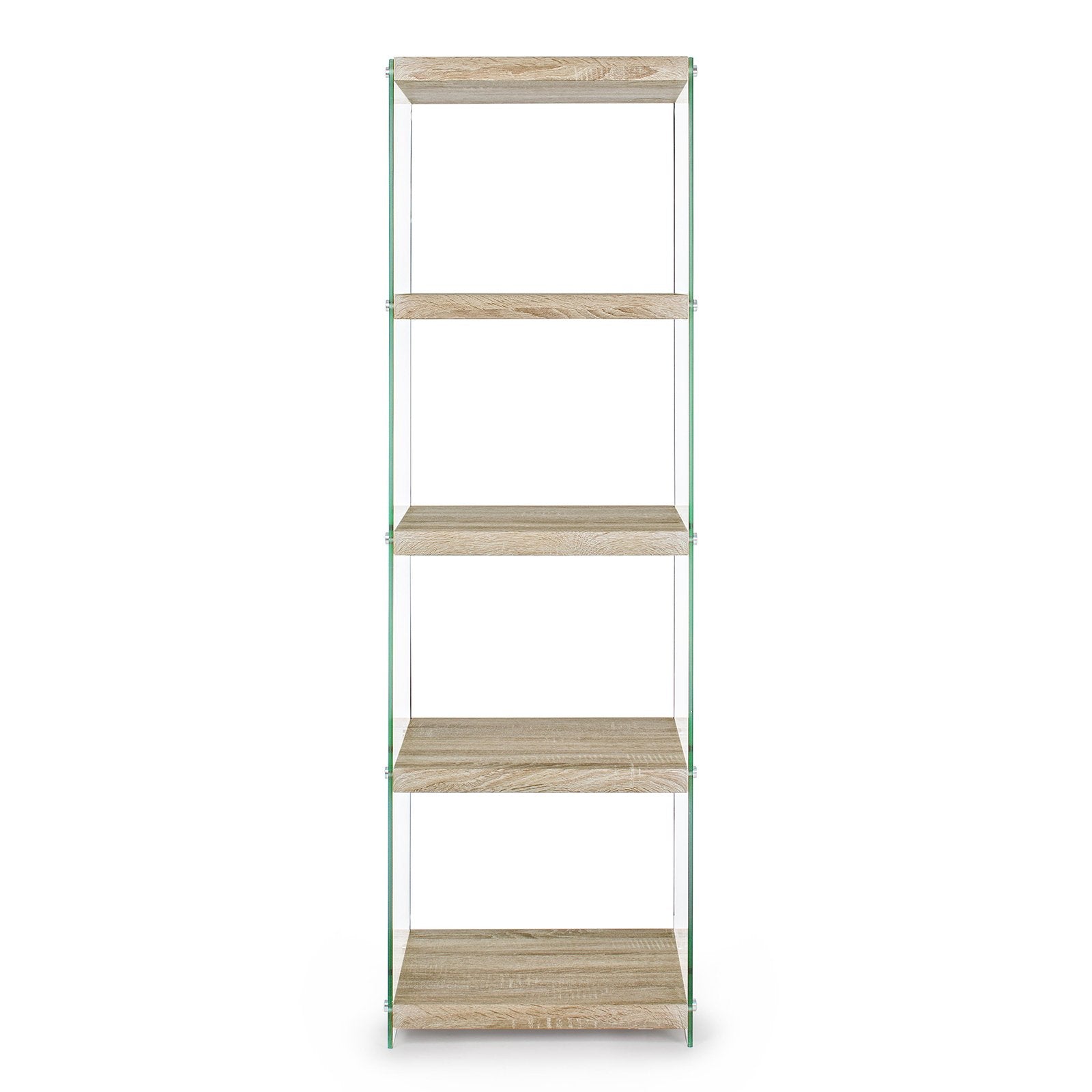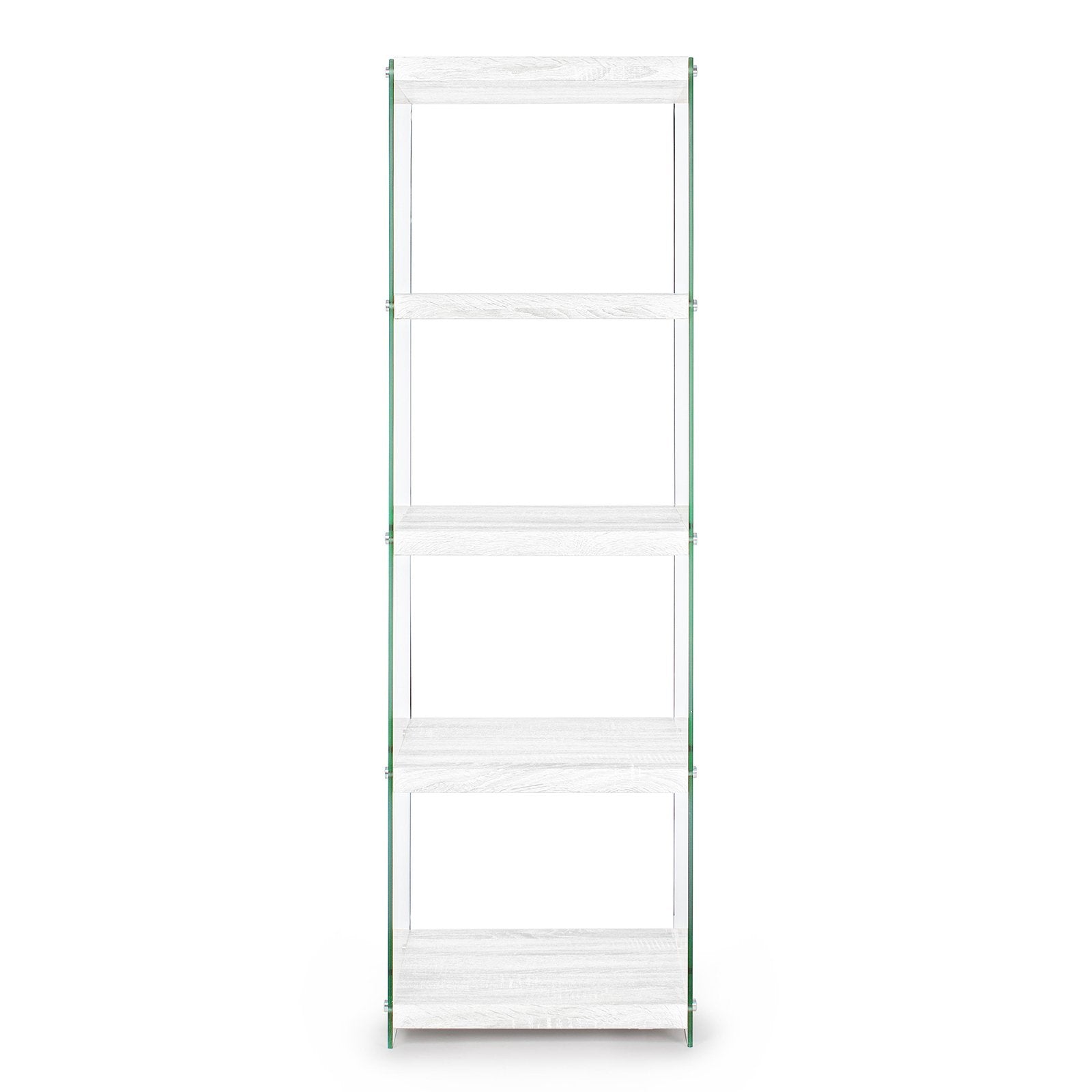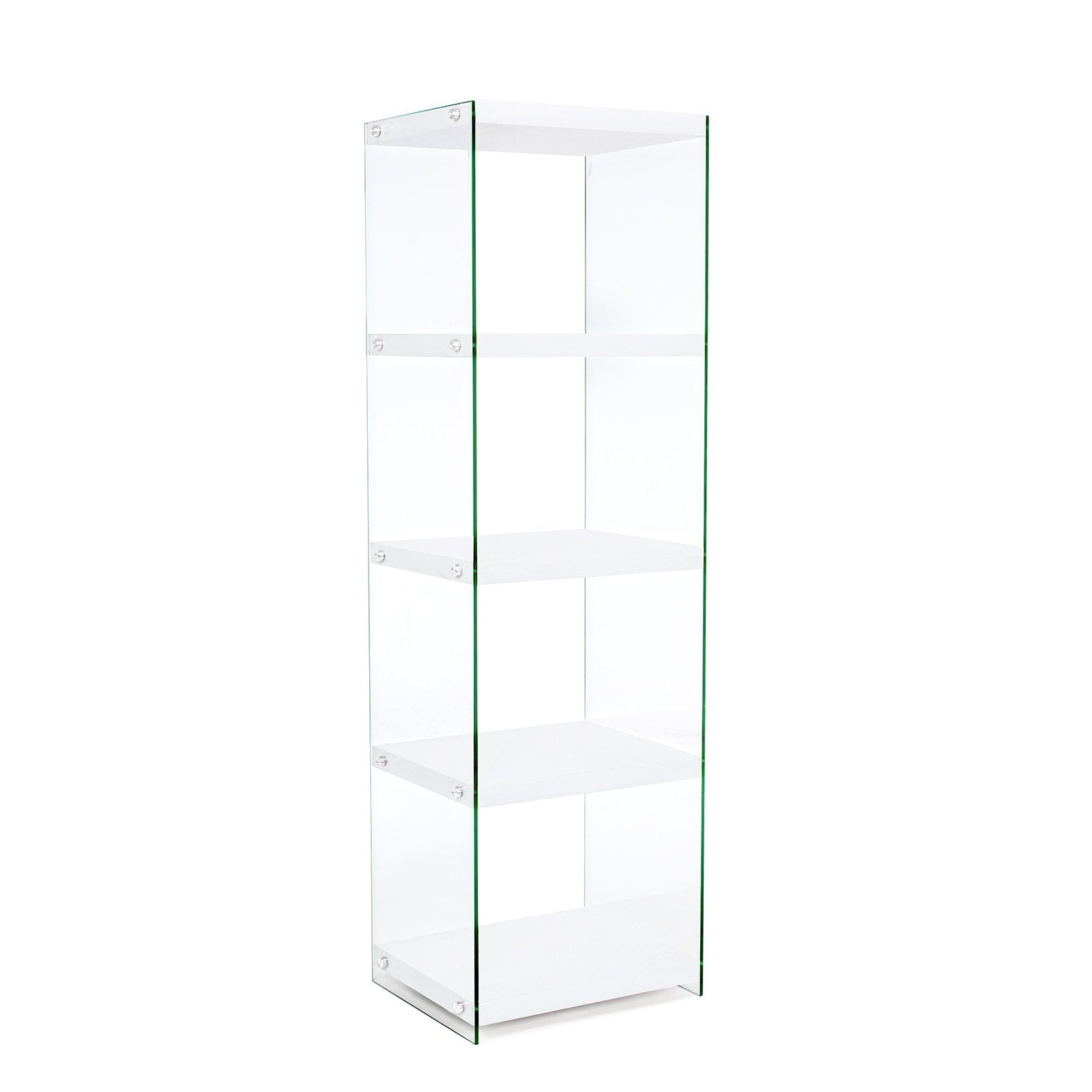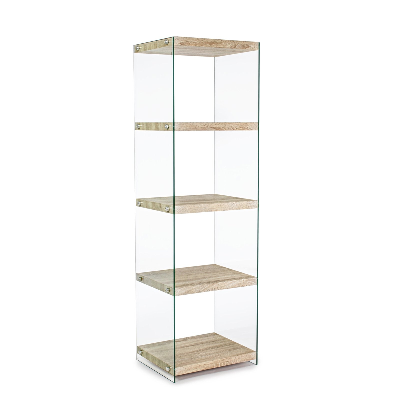 La bibliothèque design est composée de caissons de différentes tailles, en verre trempé, superposés de manière décalée et irrégulière. La structure est ensuite renforcée et stabilisée par des éléments de rigidification métalliques, positionnés aux points de jonction.
