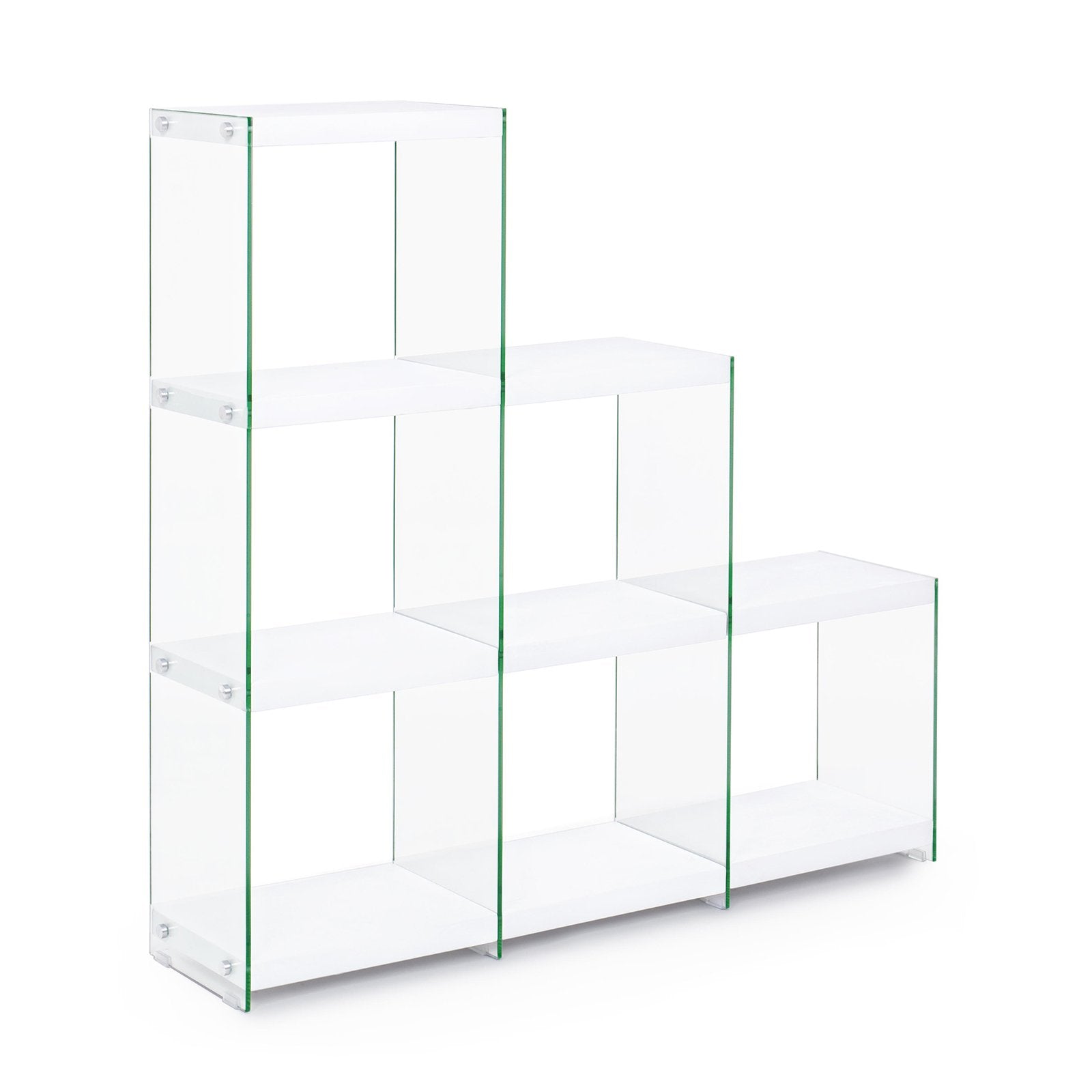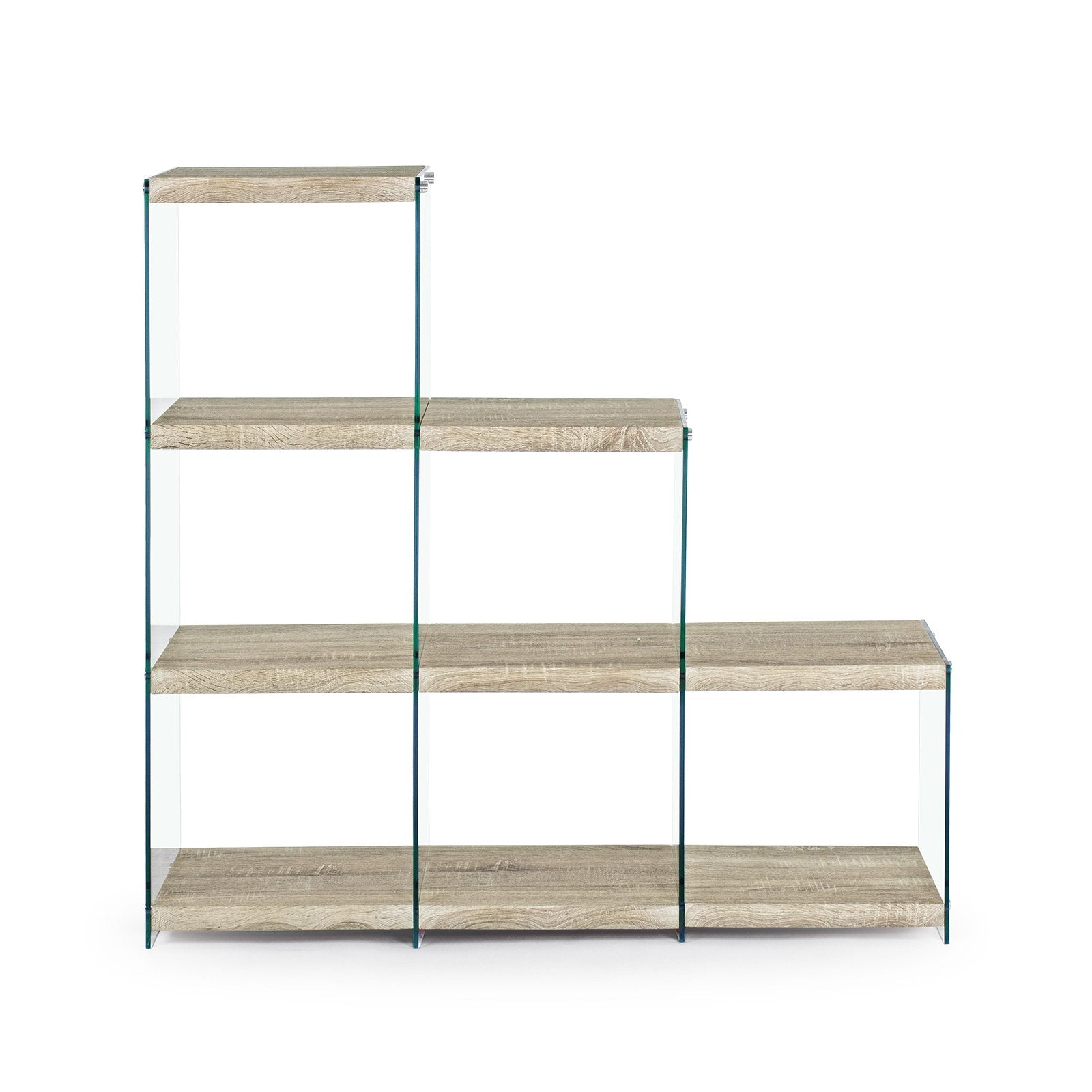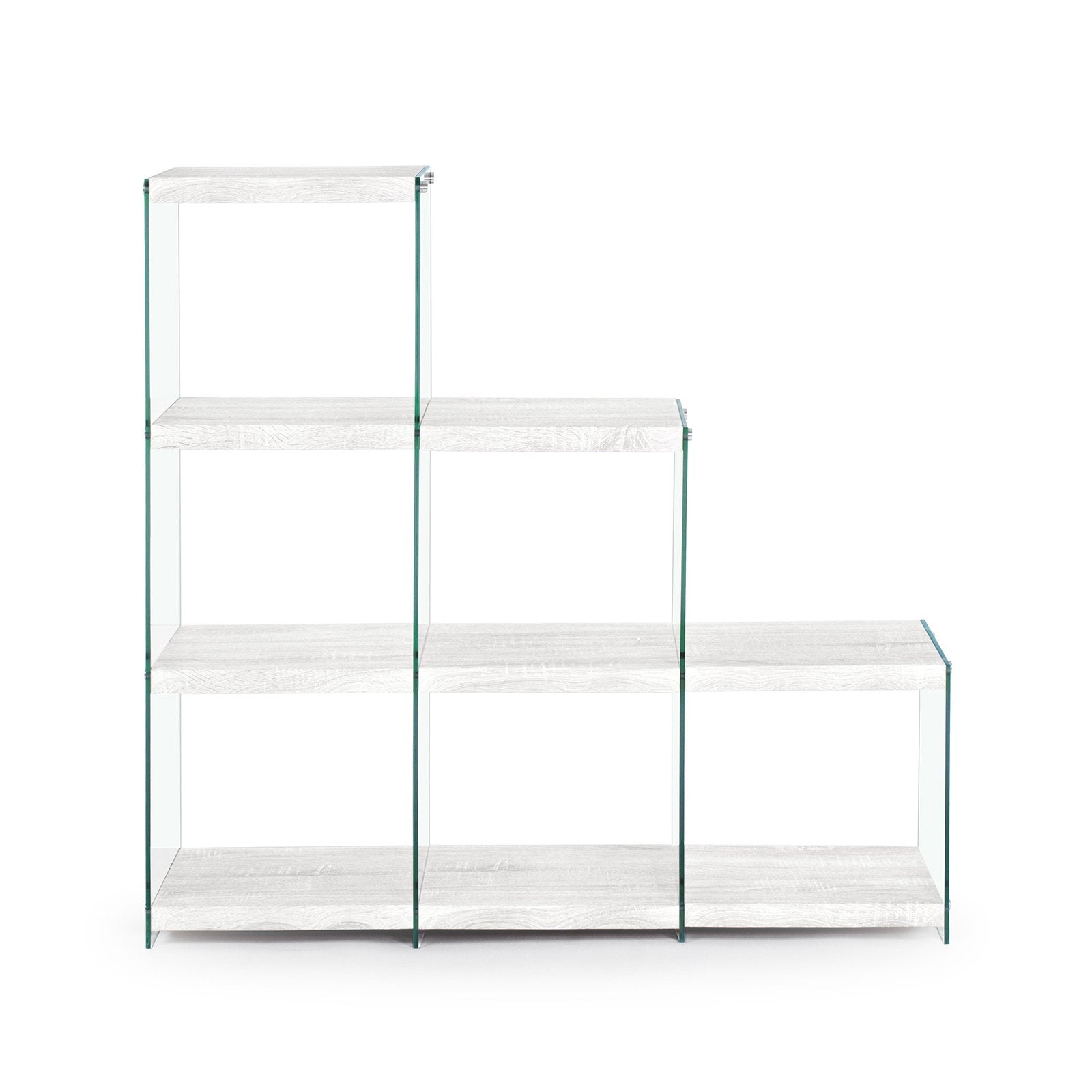 La bibliothèque design est composée de caissons de différentes tailles, en verre trempé, superposés de manière décalée et irrégulière. La structure est ensuite renforcée et stabilisée par des éléments de rigidification métalliques, positionnés aux points de jonction.