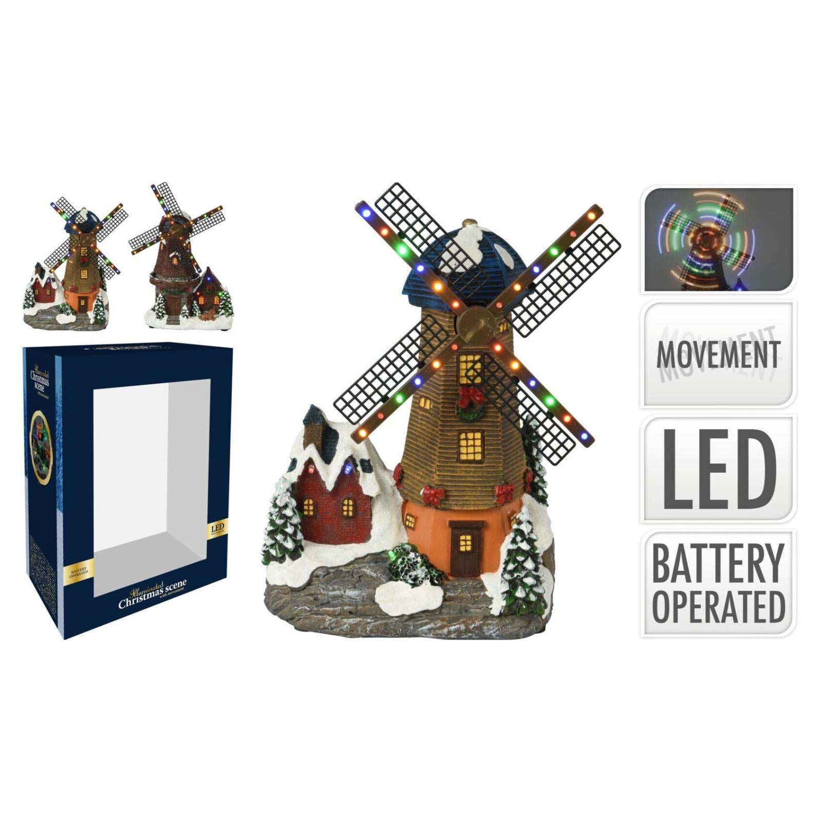 Moulin à vent bâtiment animé pour village de Noël avec lumières et mouvement h 30 cm