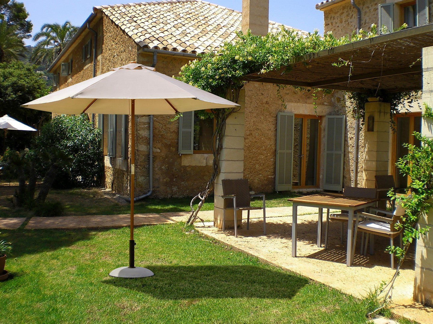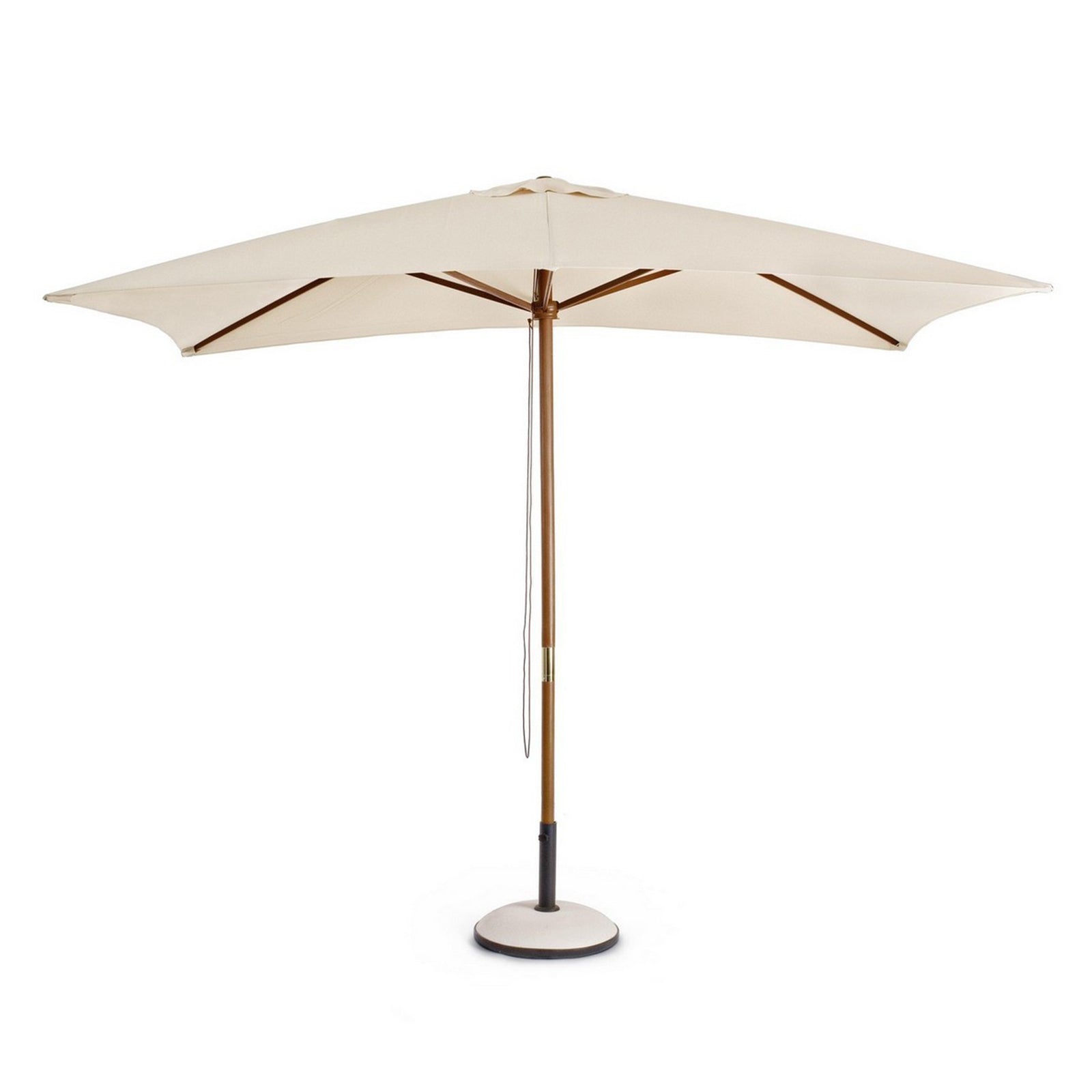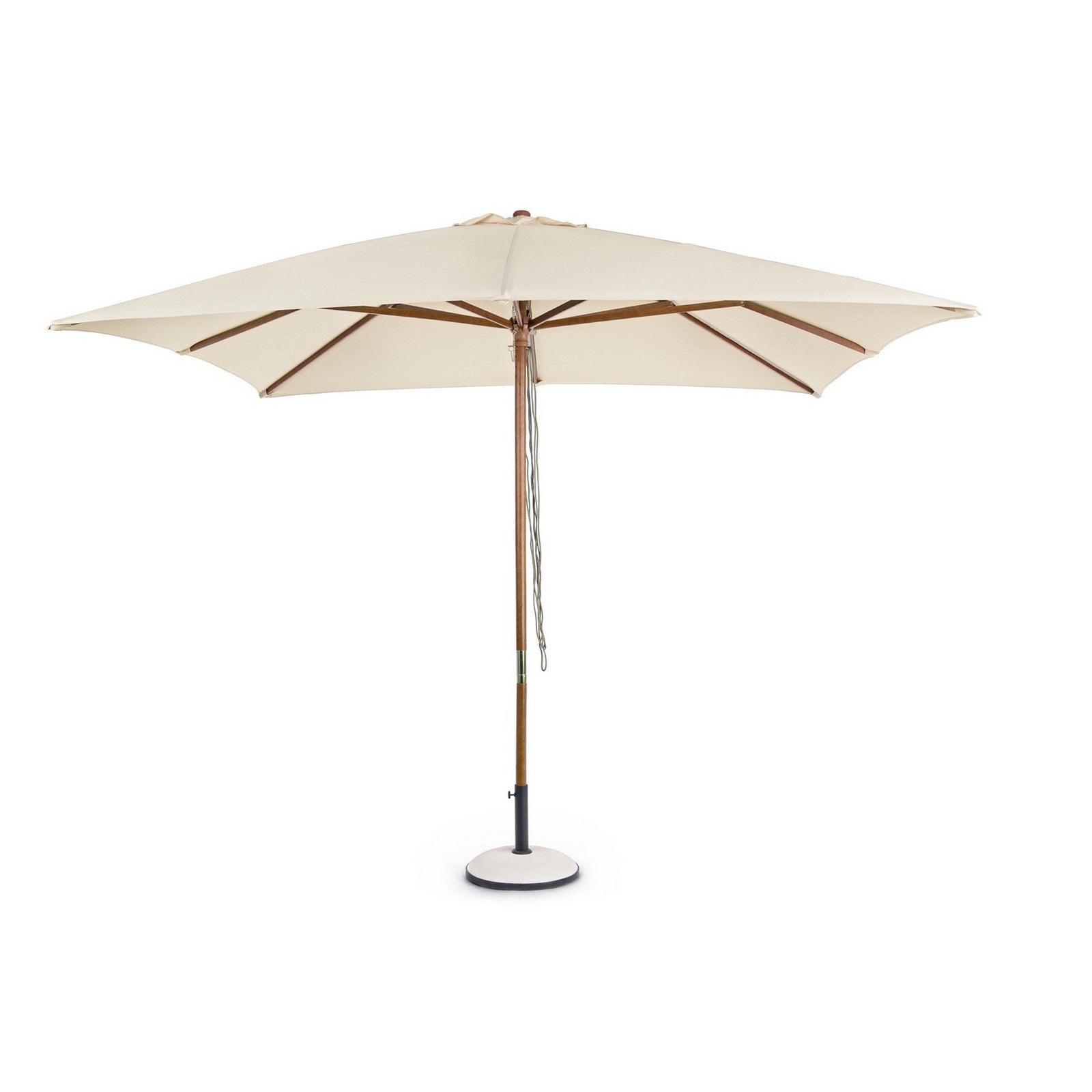 Le parapluie est équipé d'une poulie qui vous permet d'ouvrir et de fermer le parapluie facilement. La housse du parasol est de couleur naturelle et est en polyester d'une densité de 180 grammes par mètre carré. La housse est équipée d'une cheminée à vent qui permet à la brise de passer à travers le parasol sans causer de dommages ou de problèmes.