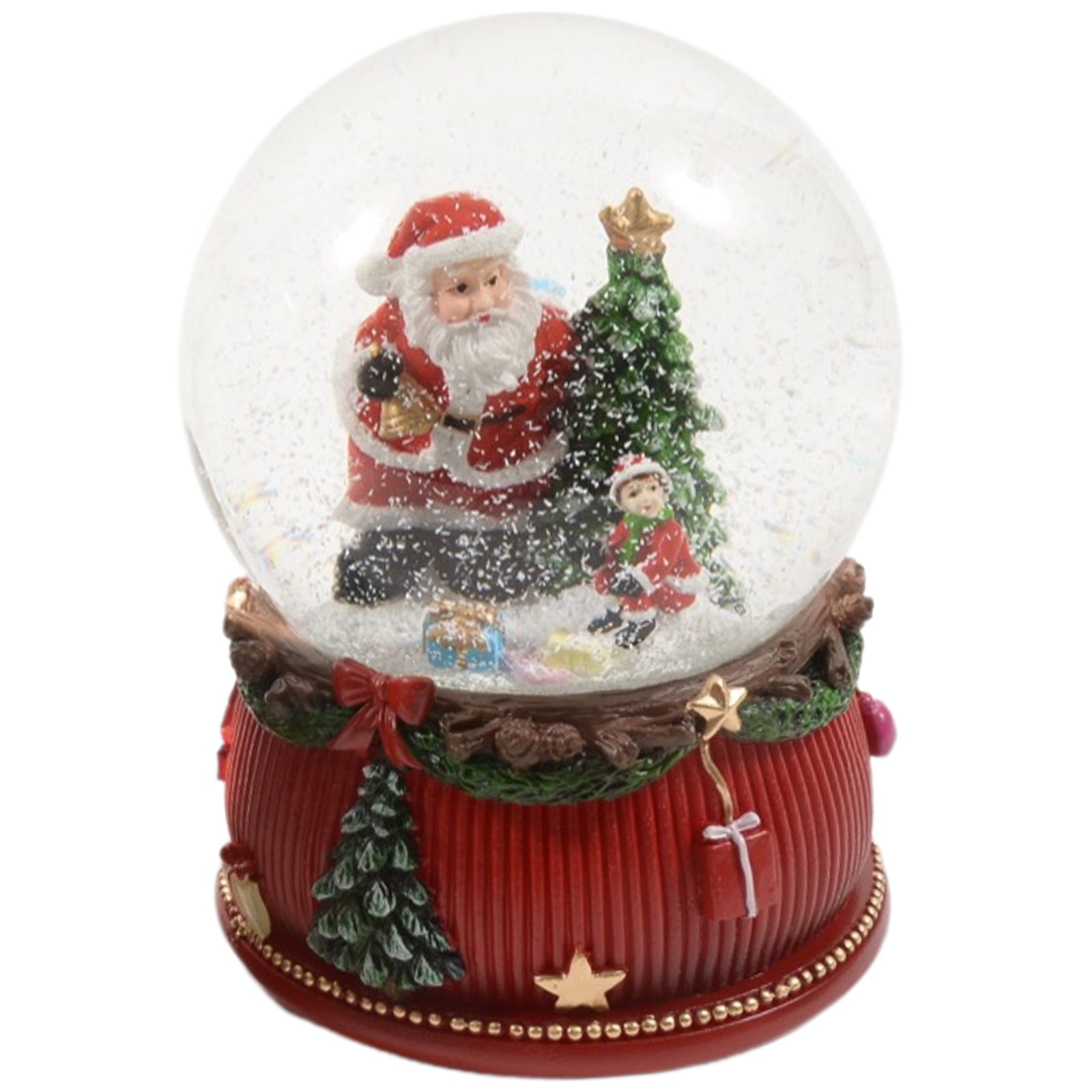 La boule de neige est fabriquée en plastique de haute qualité et son diamètre est de 10 x 10 cm, tandis que sa hauteur est de 14 cm. La couleur prédominante est le rouge, mais elle est enrichie de détails blancs pour créer un effet neigeux. La boîte à musique est actionnée par une clé placée en bas et son son est délicat et mélodieux.
