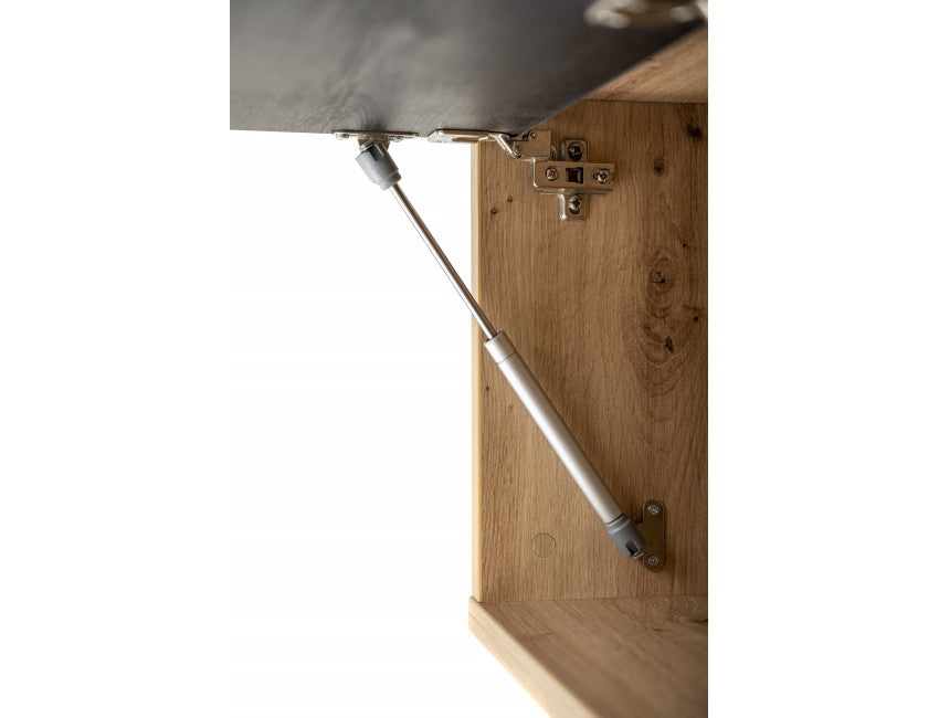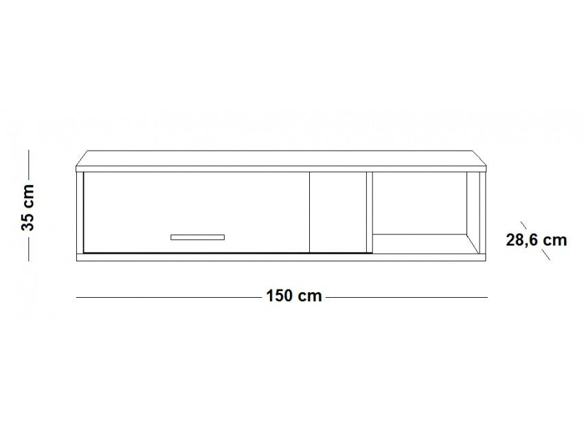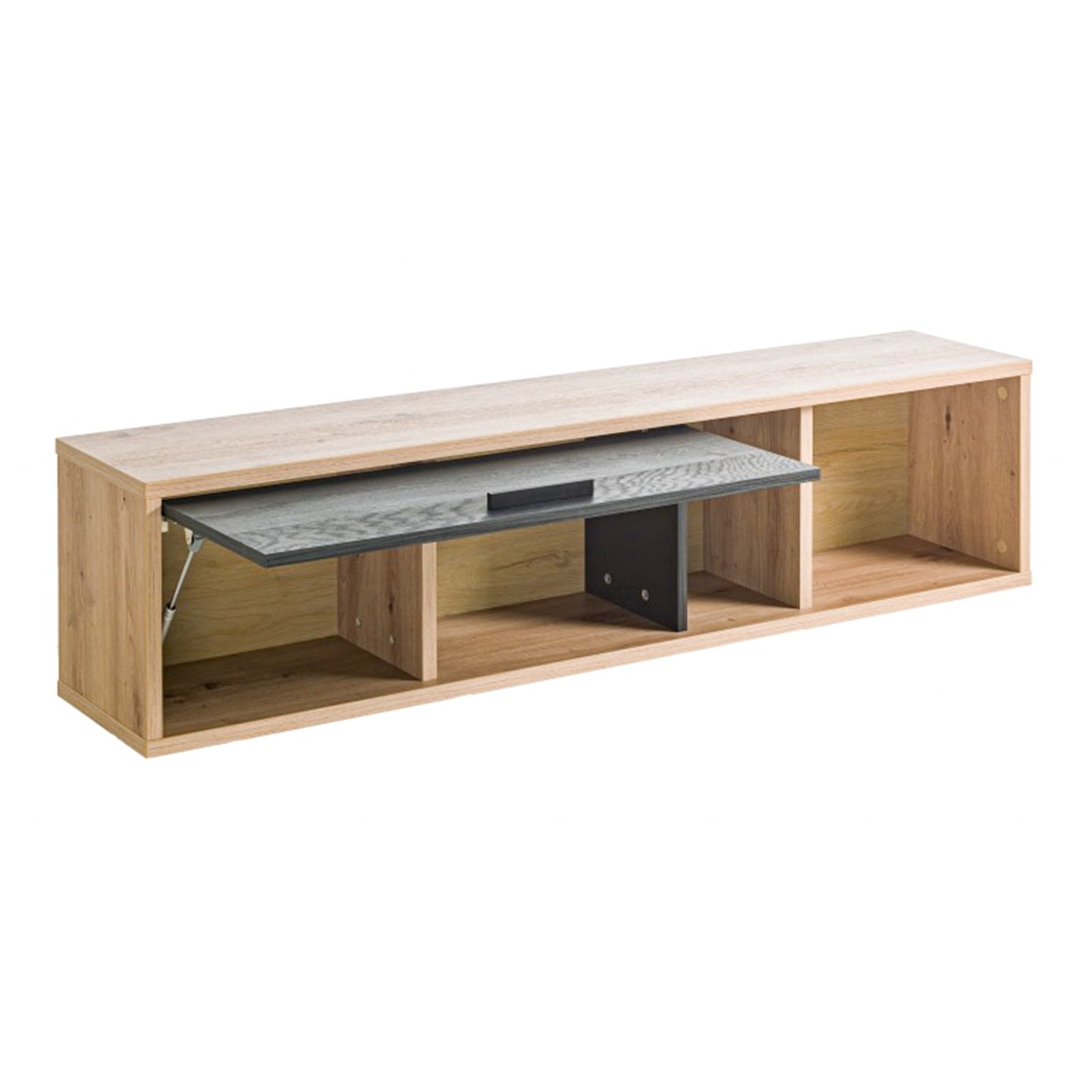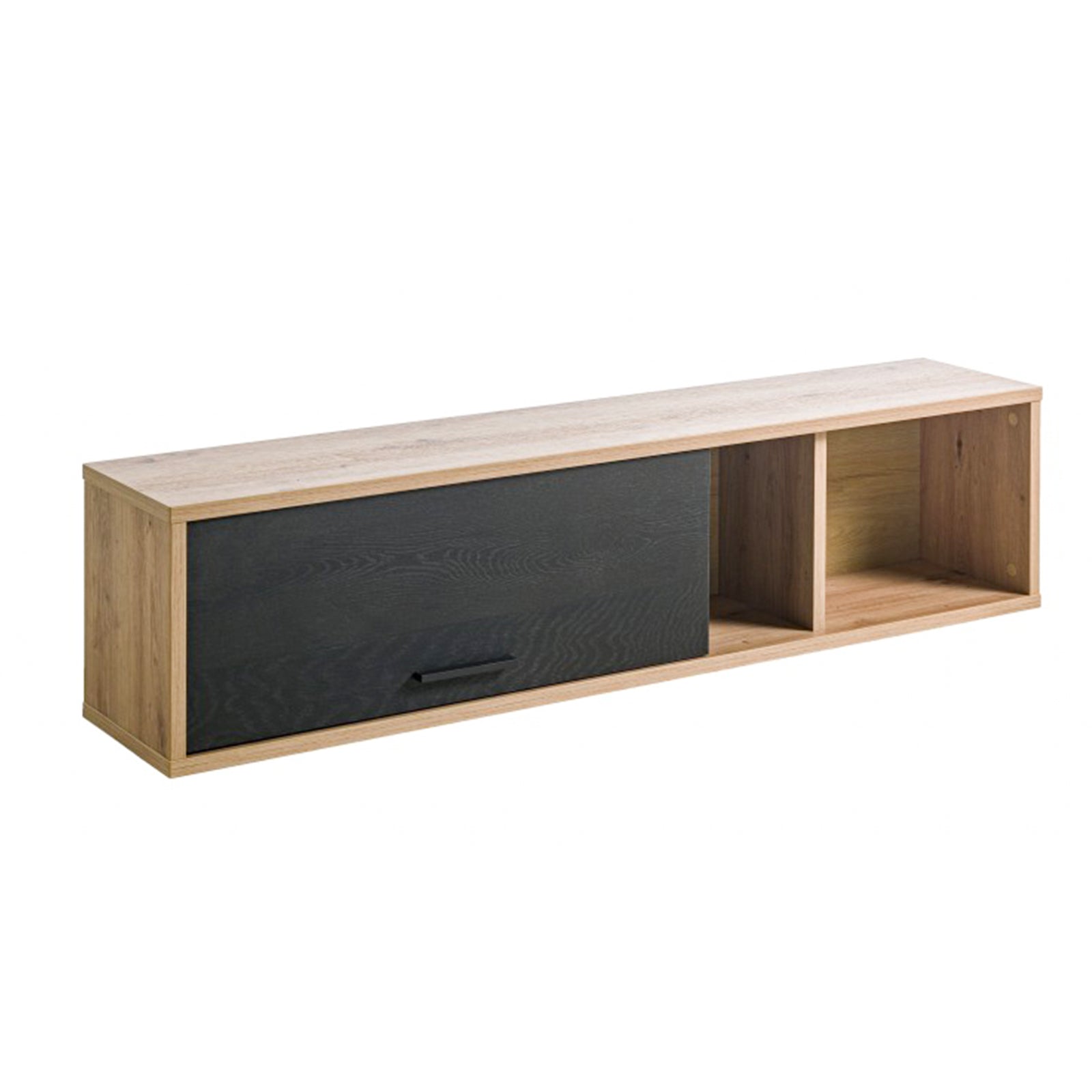 Ce meuble mural est conçu pour être fonctionnel grâce à la porte pliante et ses deux compartiments ouverts.