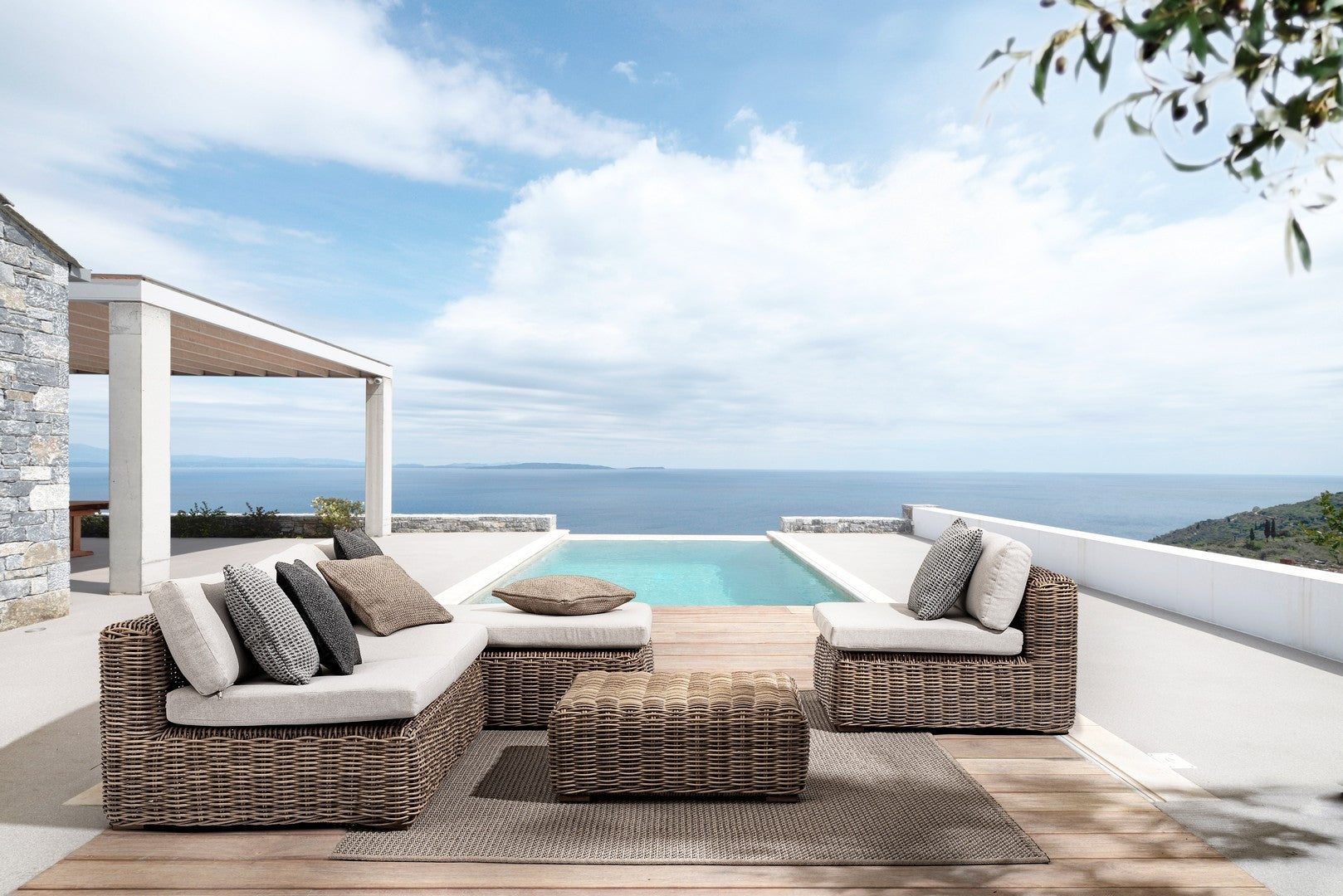 • Coussins d'assise et de dossier déhoussables en tissu oléfine (100% polypropylène)