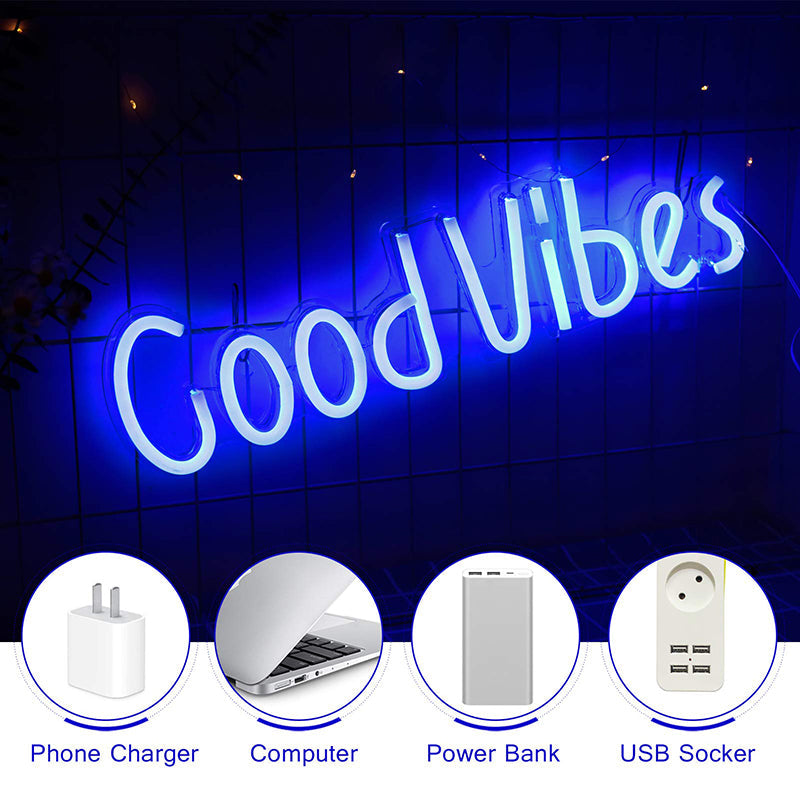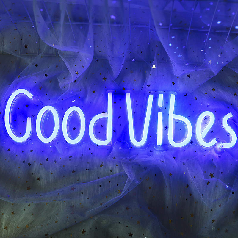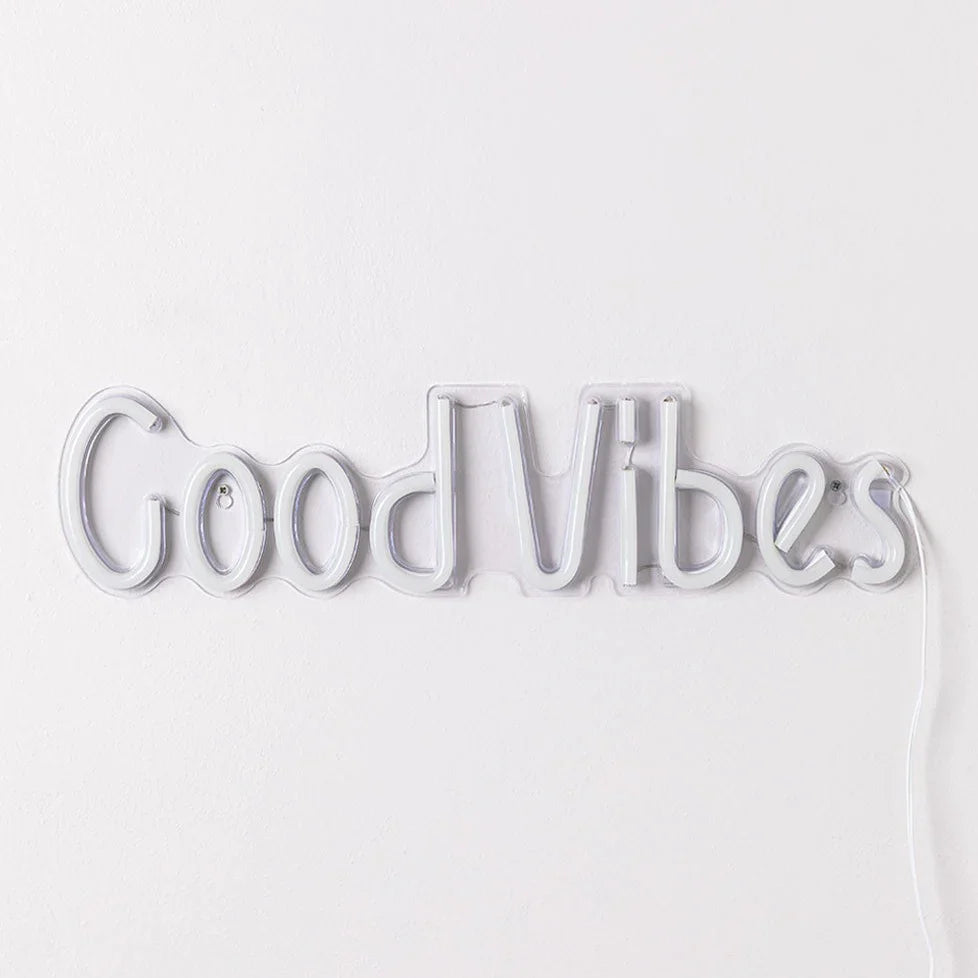 Les mots « Good Vibes » sont illuminés de manière attrayante, mettant en valeur le message d'optimisme et d'espoir.