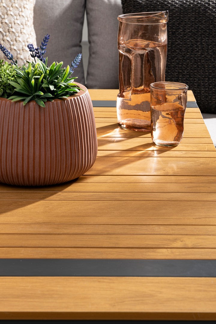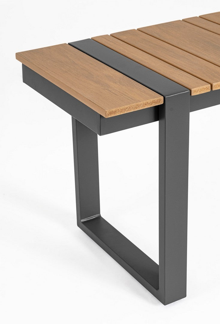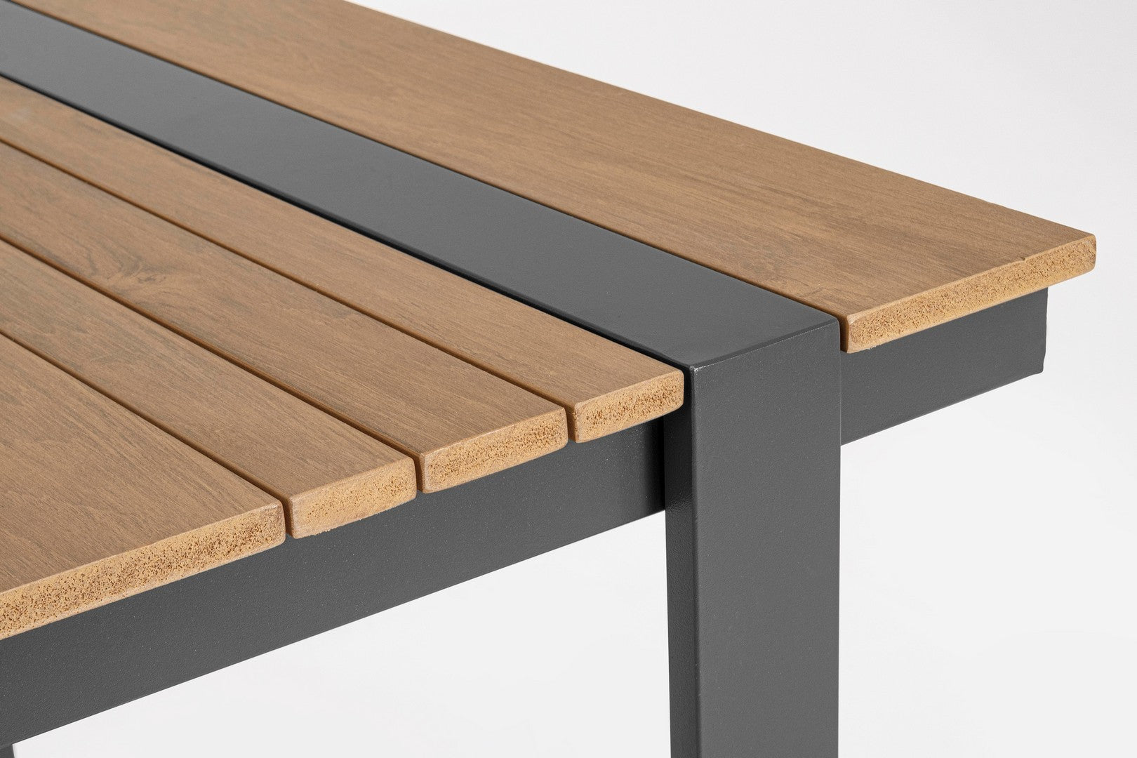Les côtés et le plateau de la table sont en polywood, un matériau composite qui a un aspect similaire au bois mais avec une plus grande résistance aux intempéries et une plus grande durabilité dans le temps.