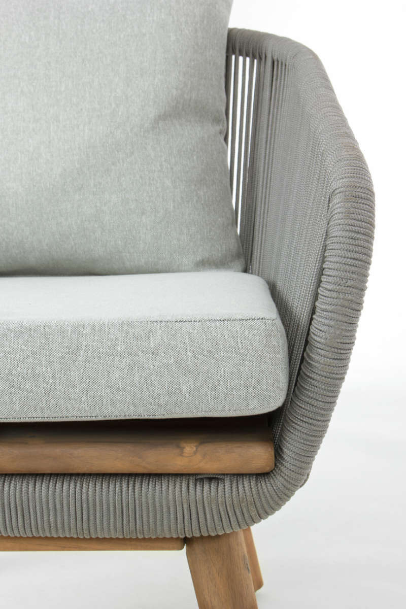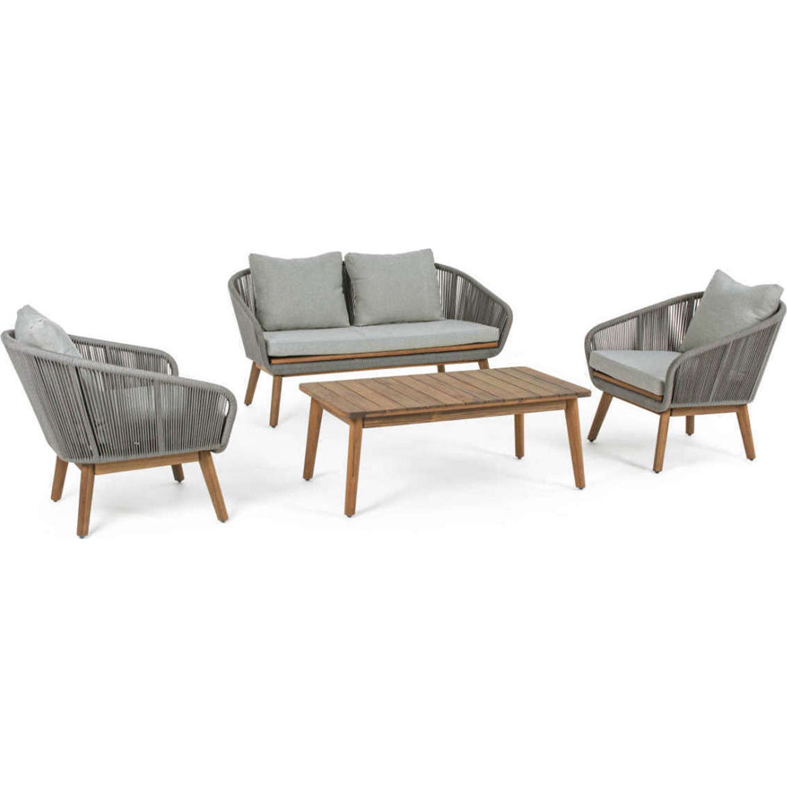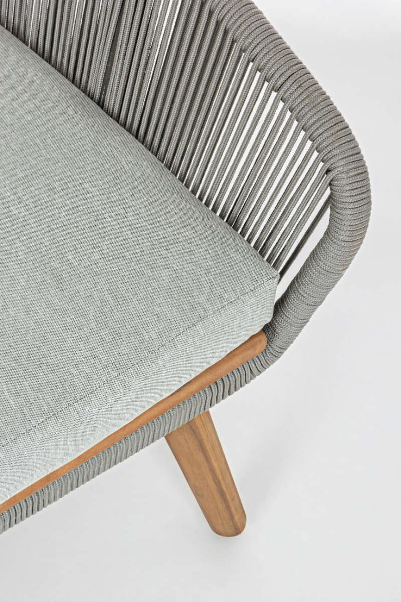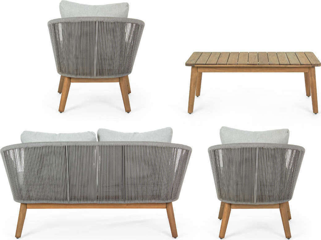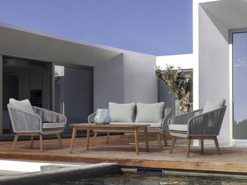Salon de jardin Annecy proposé par Bizzotto avec structure en aluminium et assise en bois d'Acacia finition huilée.