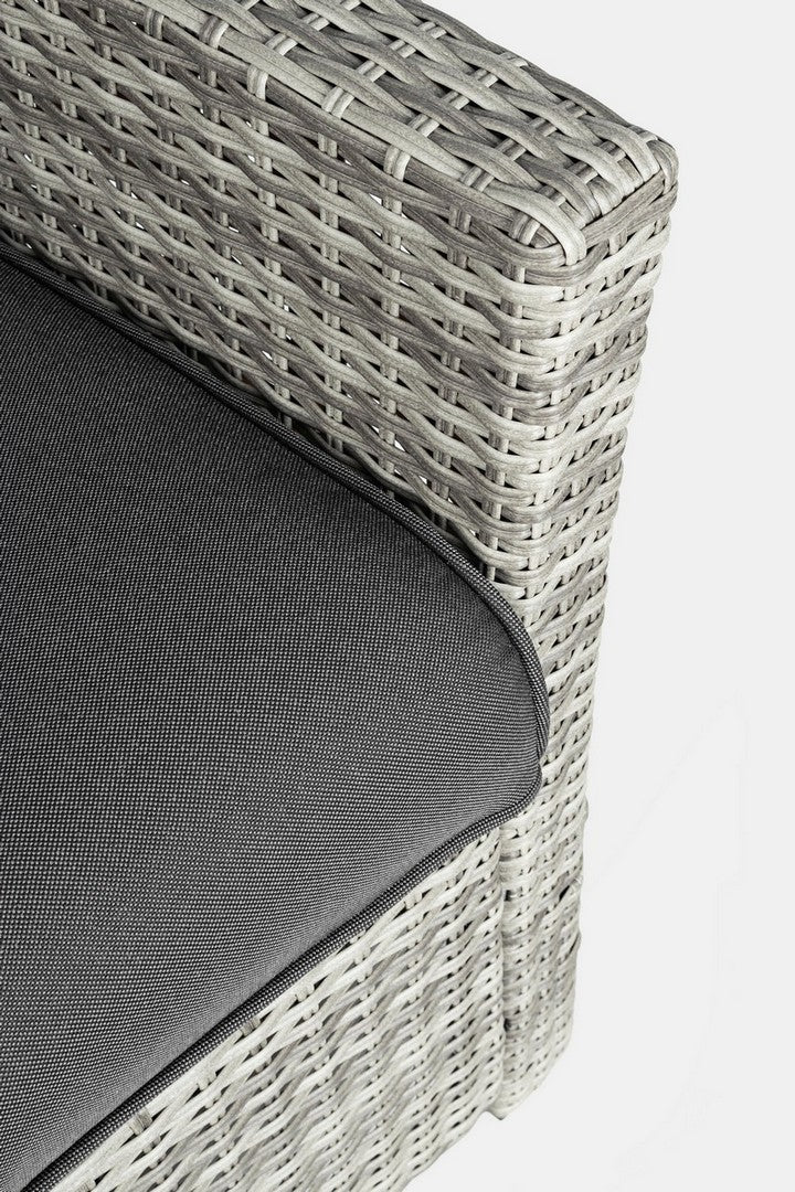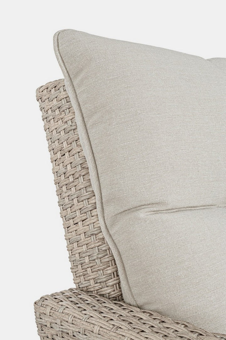 Les coussins d'assise et de dossier sont déhoussables et sont fabriqués en tissu Olefin, un matériau résistant à l'eau et aux UV composé à 100 % de polypropylène, pour garantir un maximum de confort et de résistance aux facteurs atmosphériques.