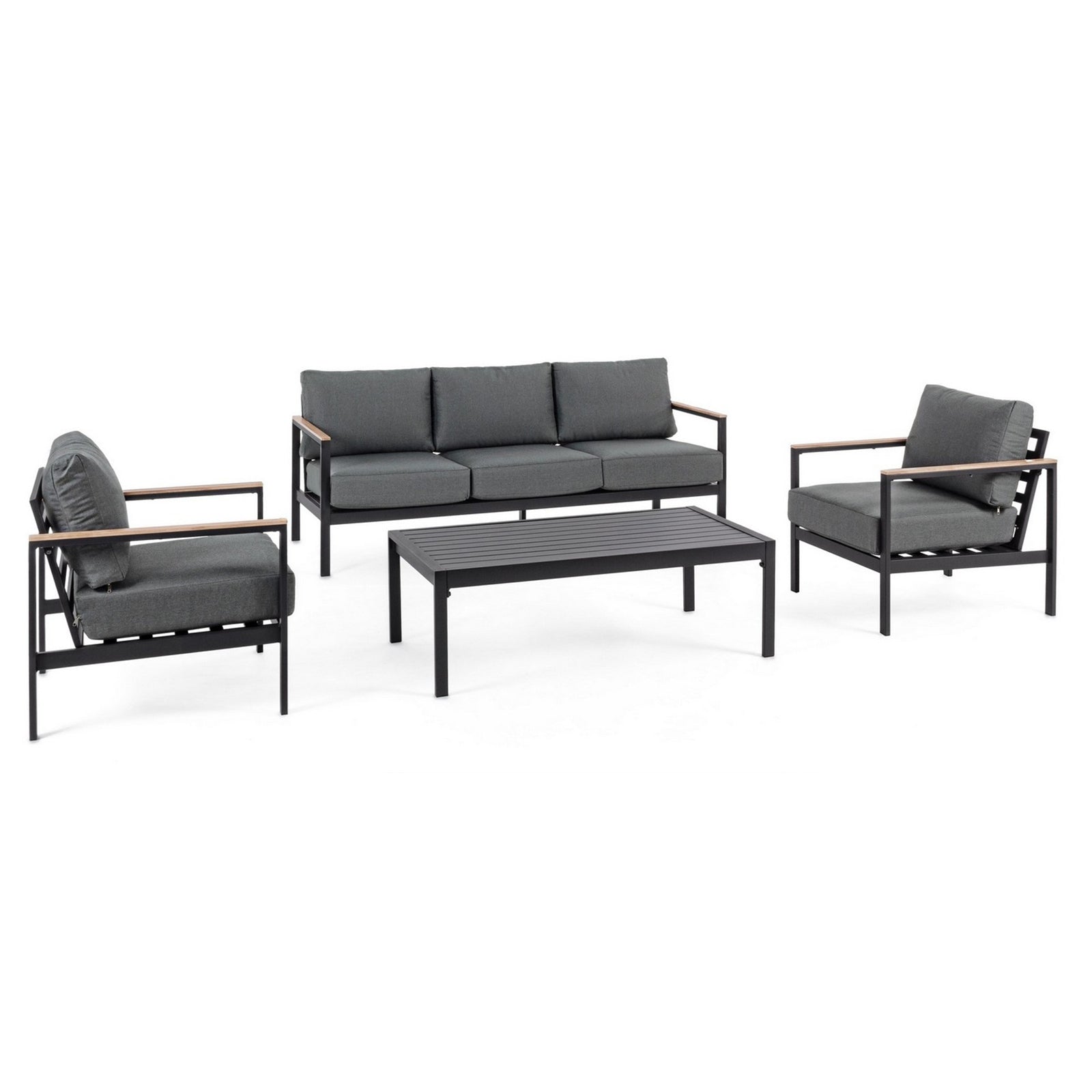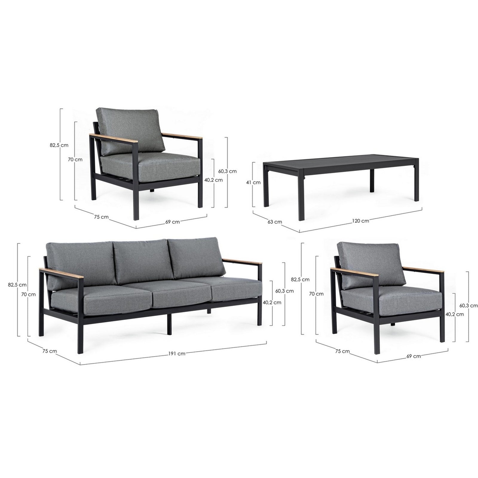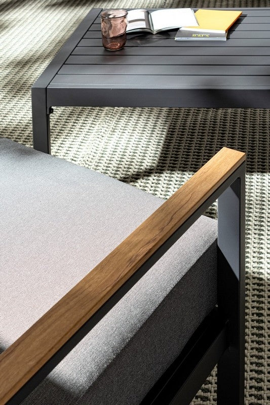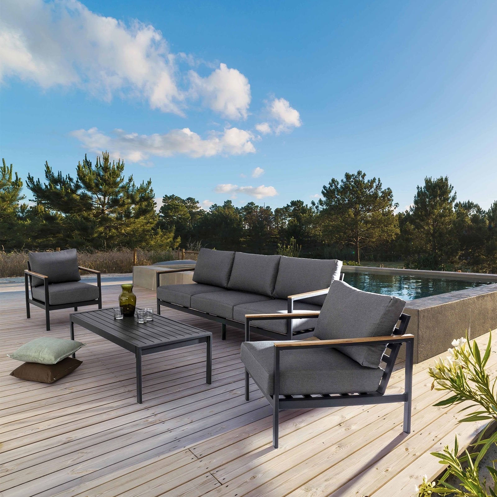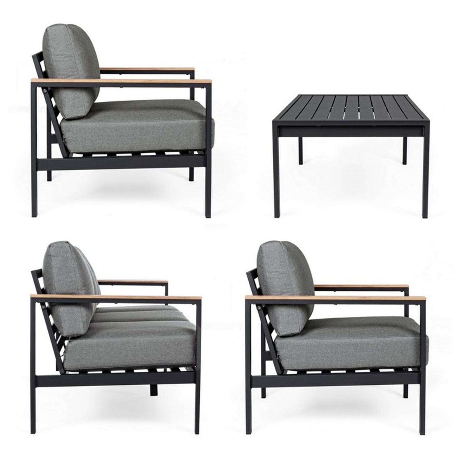 Lounge en aluminium peint anthracite mat avec coussins d'extérieur rembourrés gris très confortables.Les dimensions généreuses le rendent très confortable à utiliser.Grande table basse pour mille usages du quotidien.Caractéristiques: - Structure en aluminium thermolaqué époxy