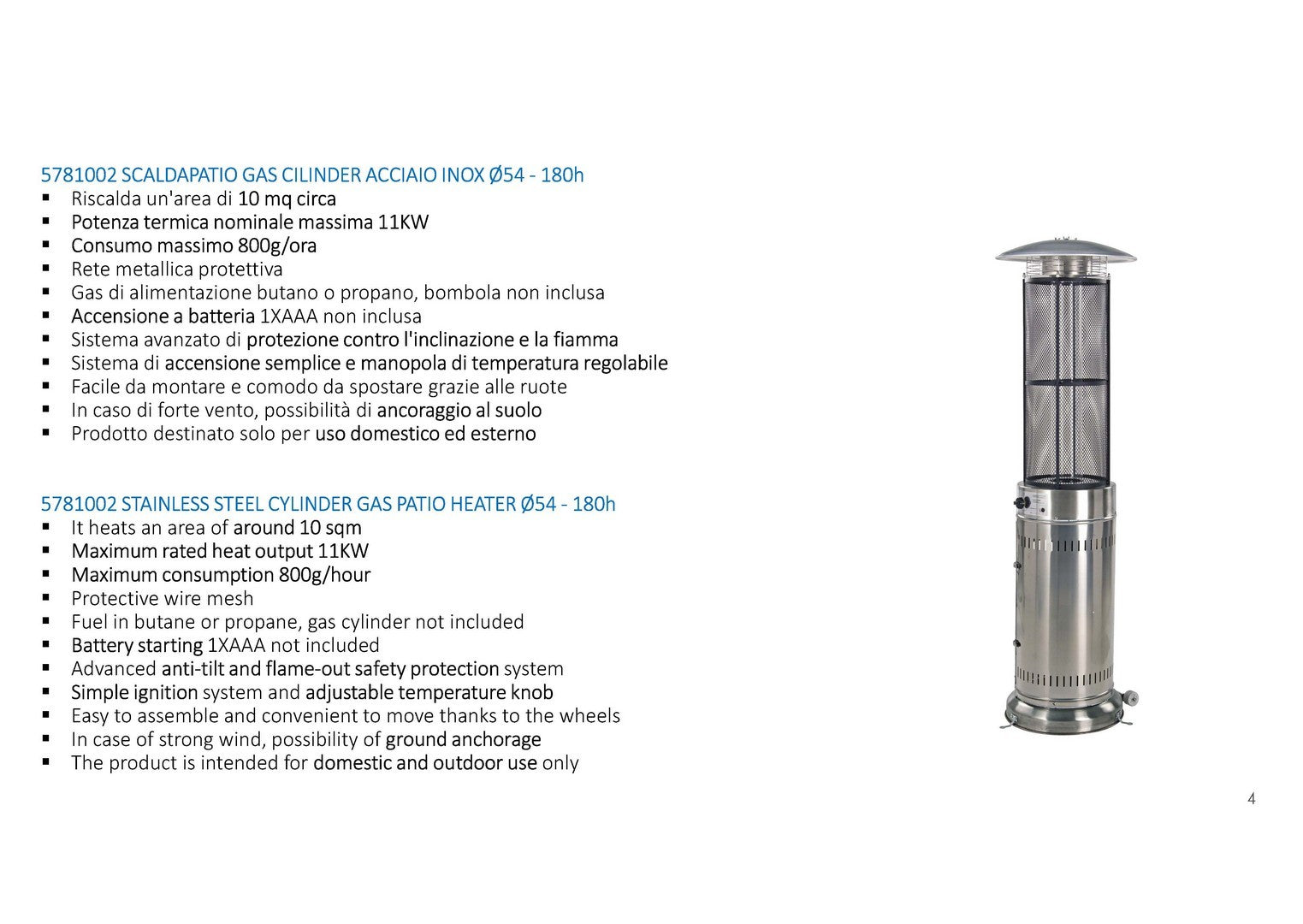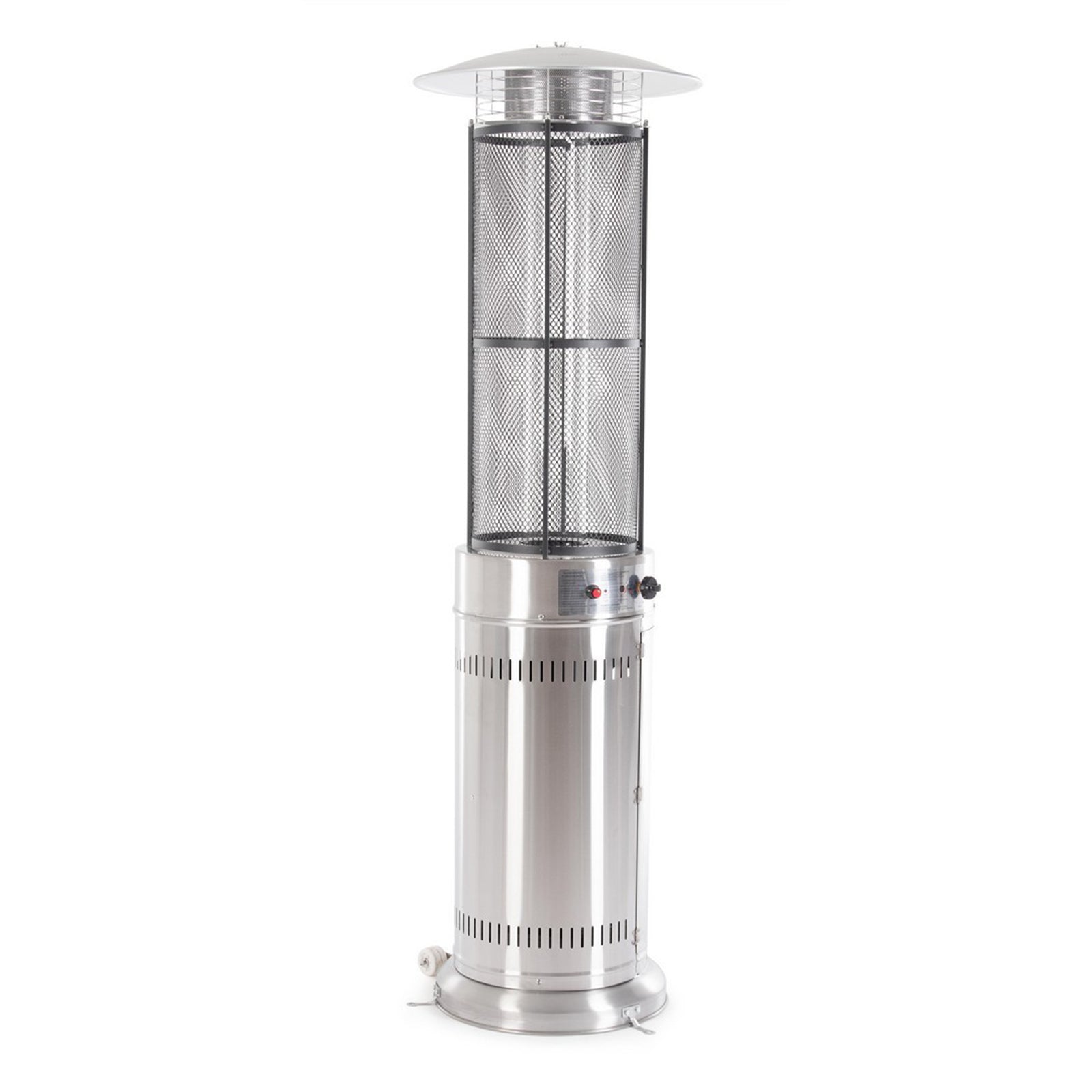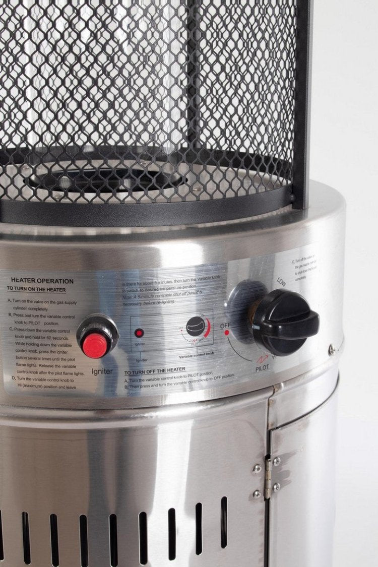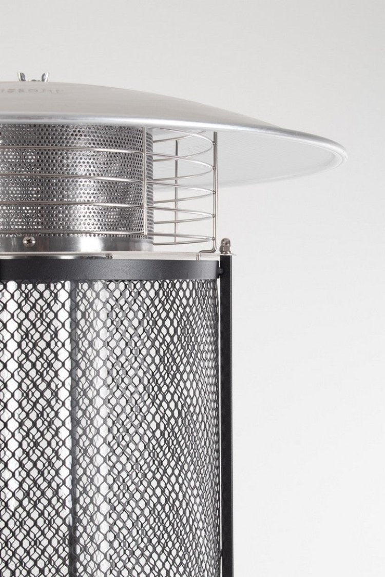La puissance calorifique nominale maximale de ce chauffage de terrasse à gaz est de 11 kW. Il peut fonctionner avec du gaz combustible butane ou propane, mais la bouteille n’est pas incluse. La consommation maximale de gaz est de 800 g/heure. L'allumage se fait via une pile AAA, qui n'est pas incluse dans le produit.