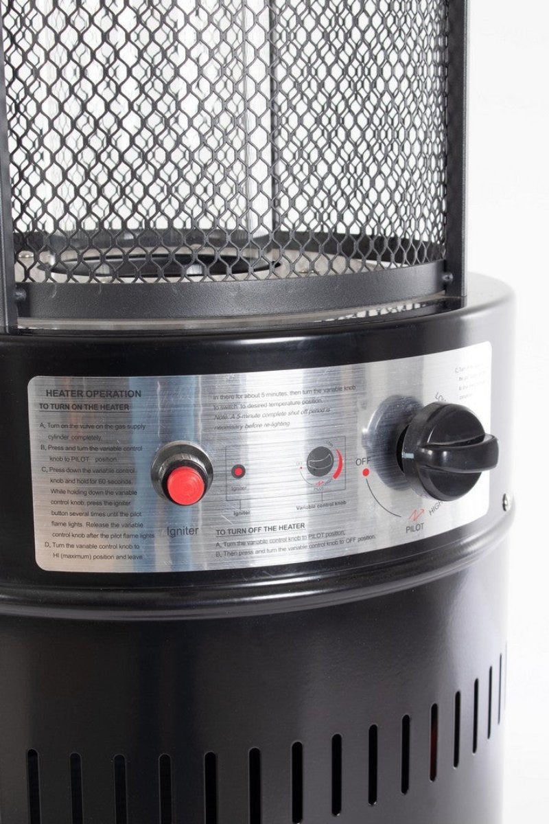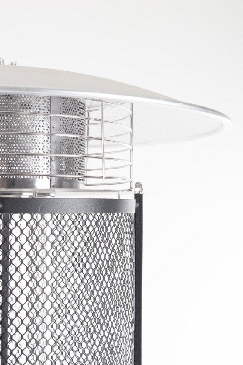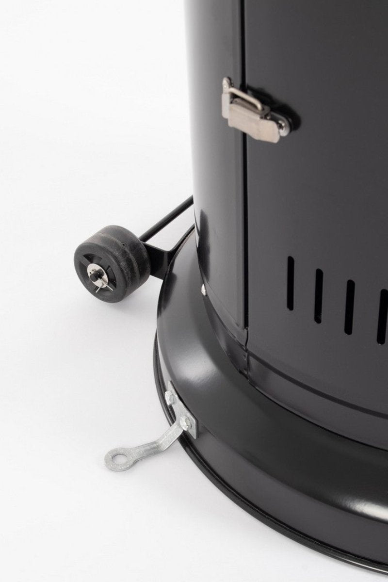Prix régulier €499,90 Prix réduit €456,90Le produit décrit est un chauffe-terrasse cylindrique à gaz conçu pour une utilisation en extérieur. Il possède une structure principale en acier peint par poudrage noir, ce qui lui confère solidité et durabilité. La taille globale du produit est de 54 cm de diamètre et 180 cm de hauteur.