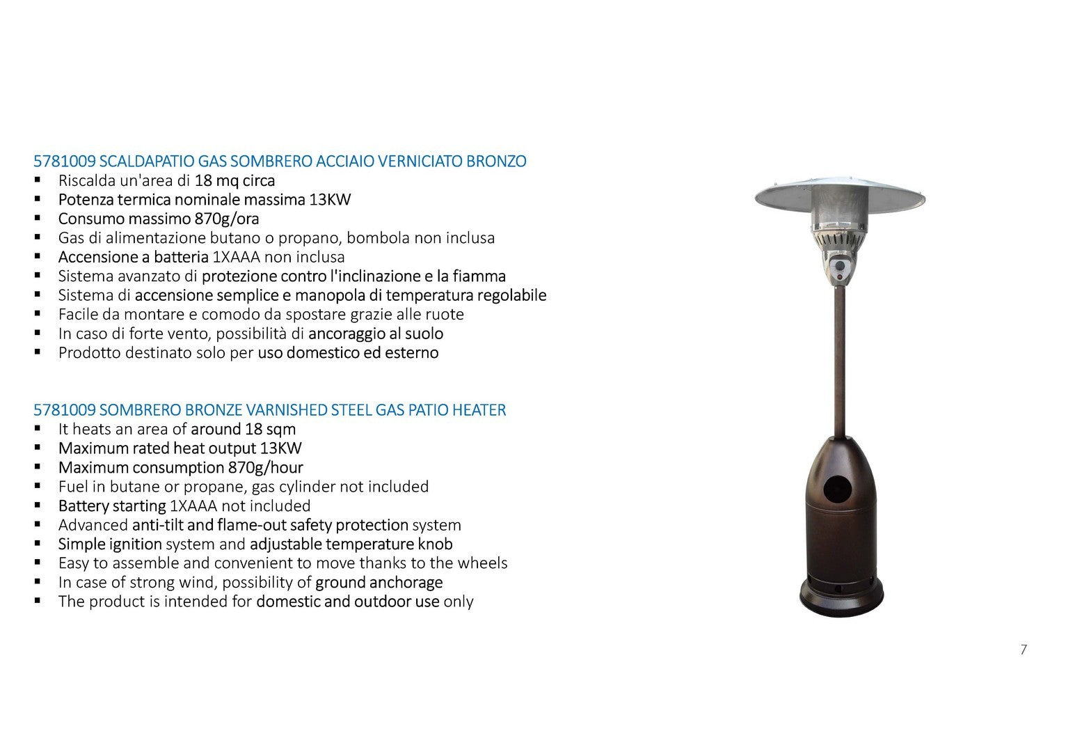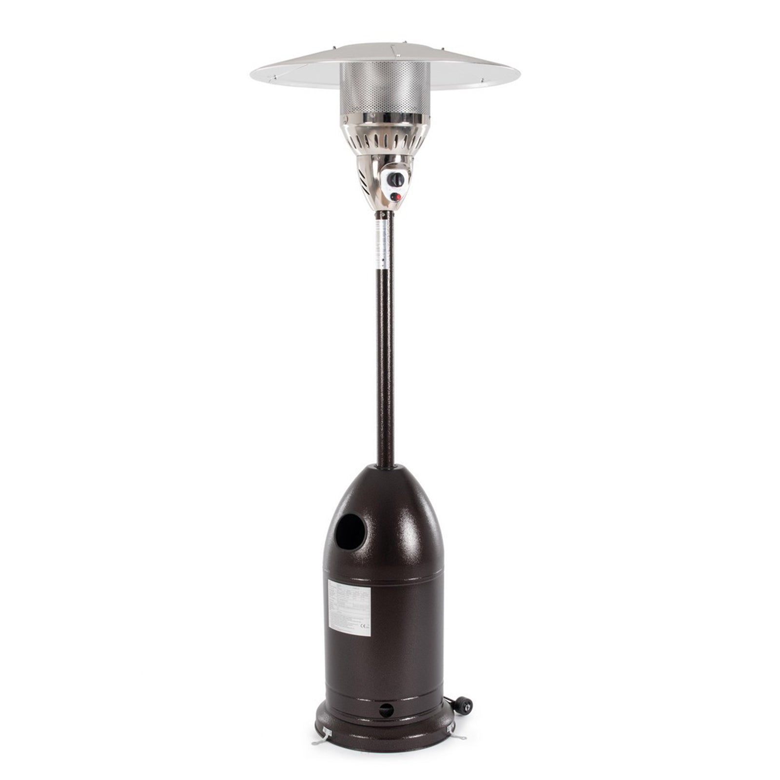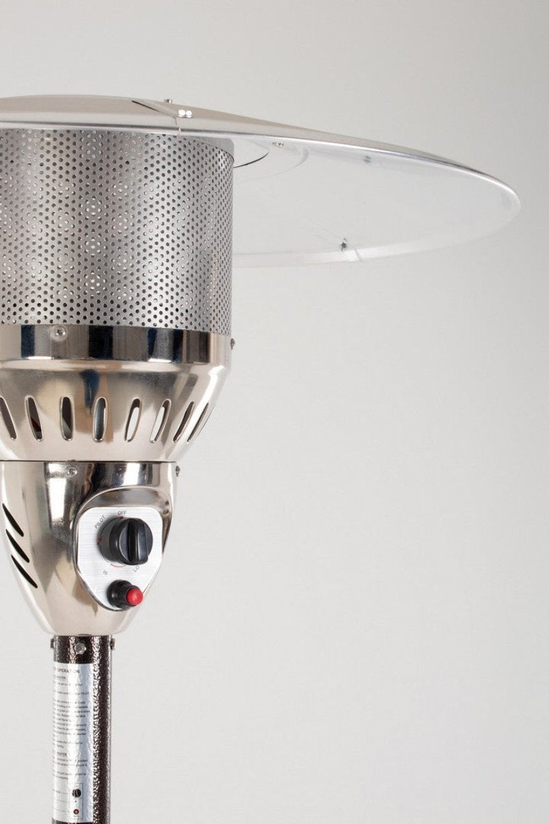 Prix régulier €374,90 Prix réduit €331,90Le produit décrit est un chauffe-terrasse au gaz conçu pour une utilisation en extérieur. La structure principale est en acier peint par poudrage noir, avec une couleur bronze qui donne un aspect élégant. Les dimensions du produit sont de 81,3 cm de diamètre et 220 cm de hauteur.