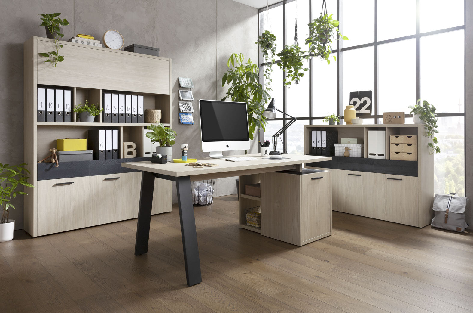 Prix régulier €437,90 Prix réduit €406,90Bureau de la ligne DaVinci avec extension et commode, couleur gris effet bois et finitions chêne naturel.