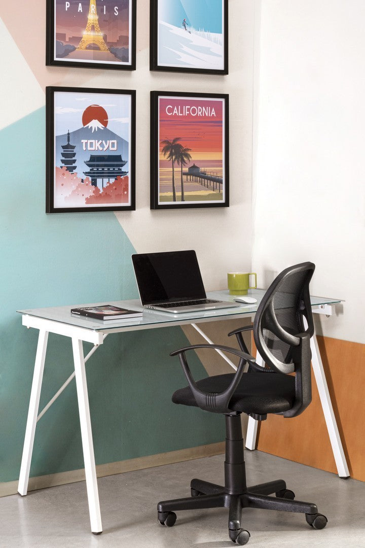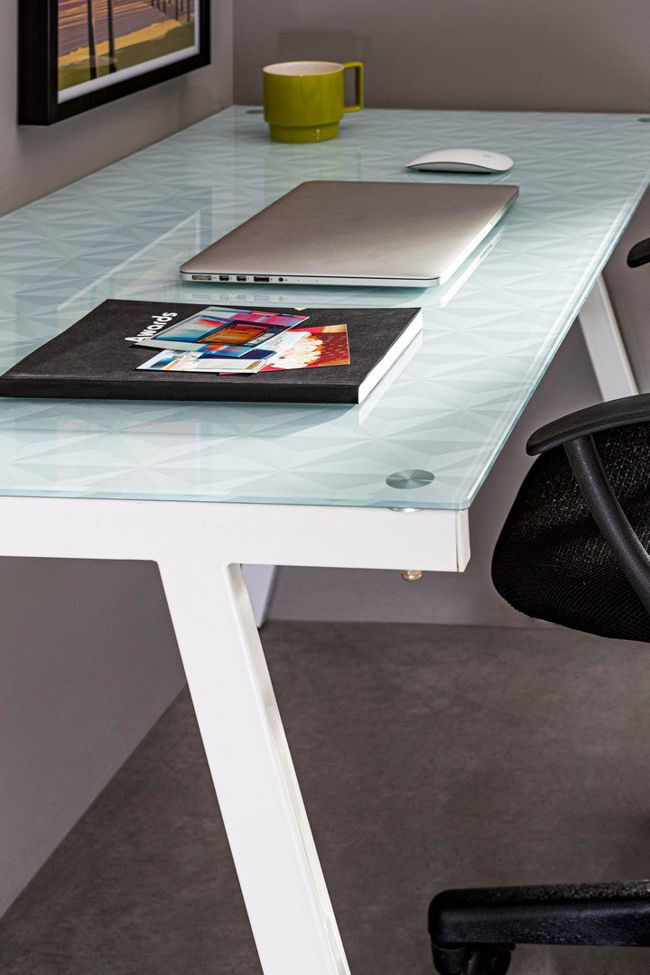 Le plateau en verre du bureau Archimède dans sa simplicité s'adapte à n'importe quelle pièce de la maison ou du bureau.