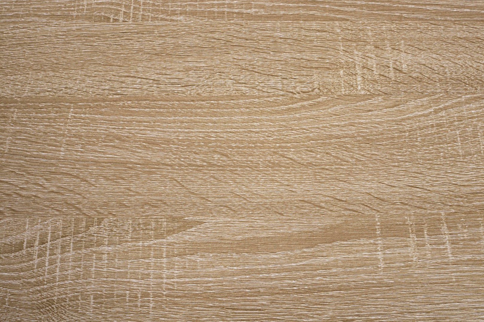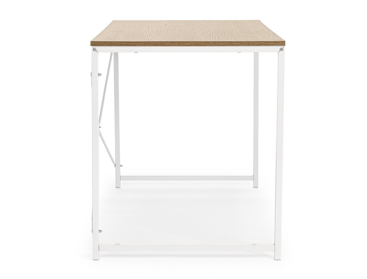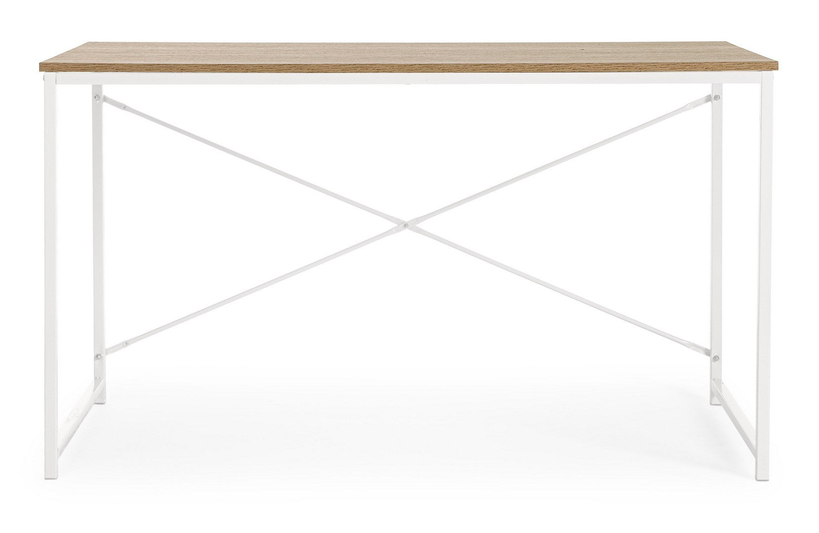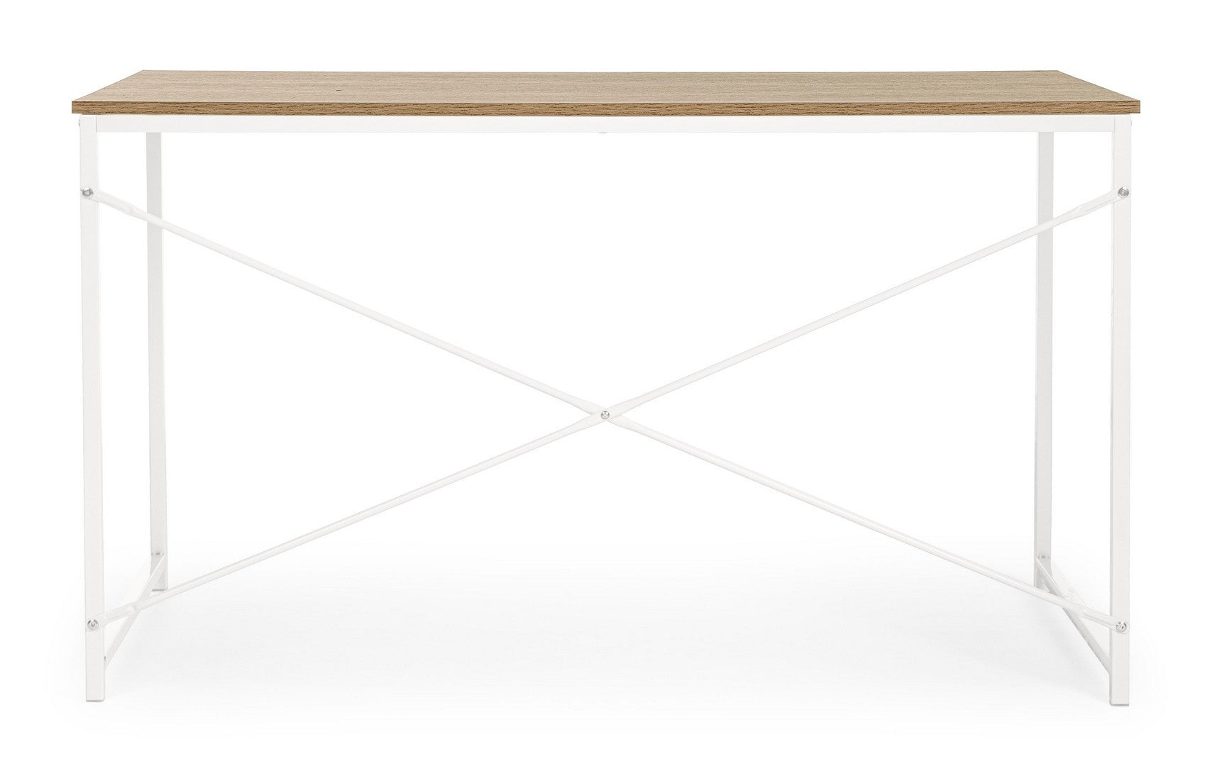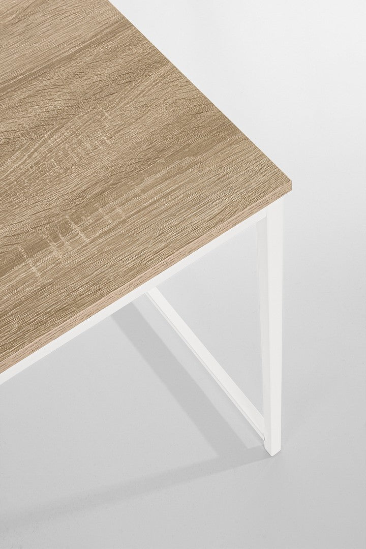 Structure en acier peint blanc, plateau en bois mélaminé plaqué chêne.